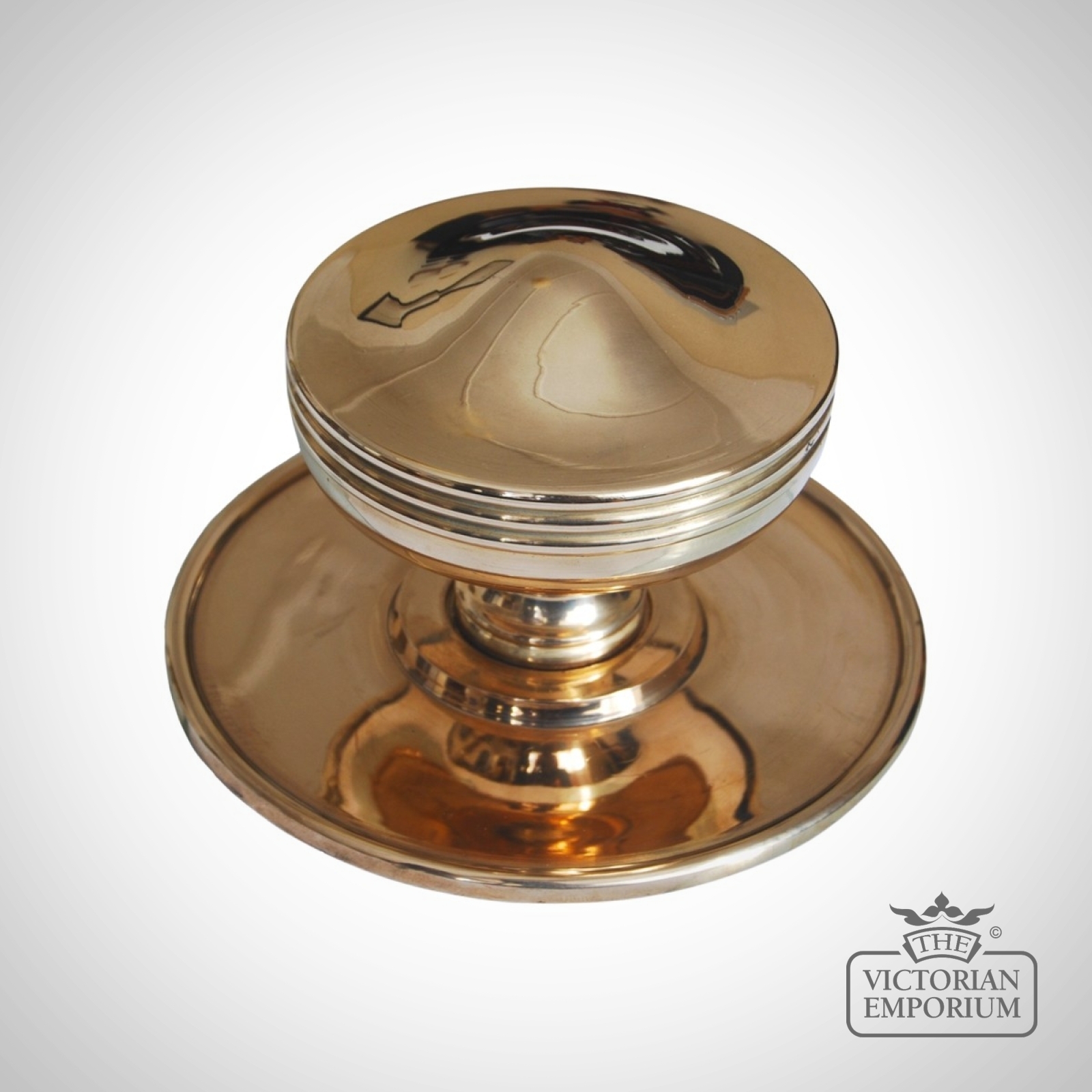 Impressive front door knob in copper brass or plain brass. This is not lacquered , and will all dull down over time if not polished .
