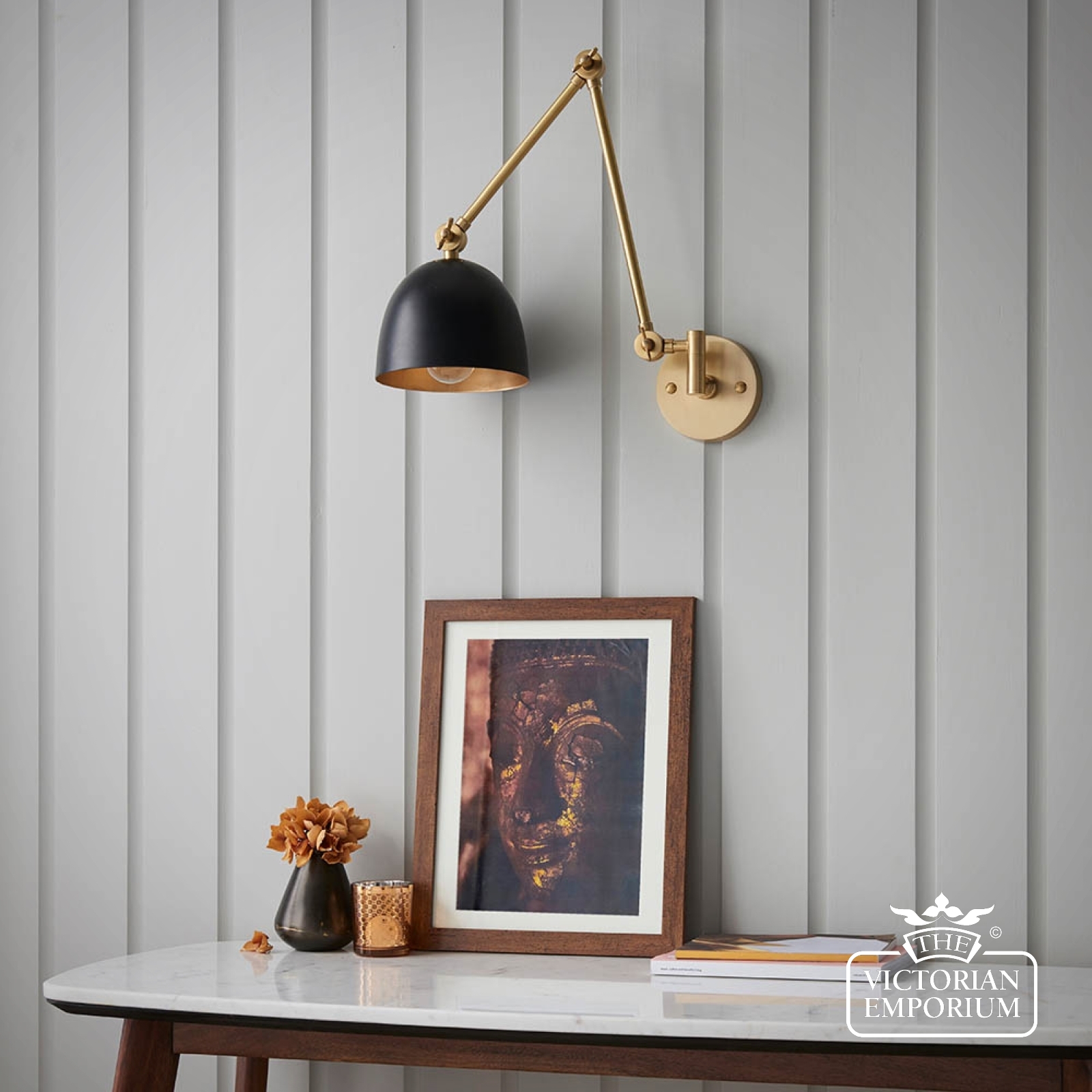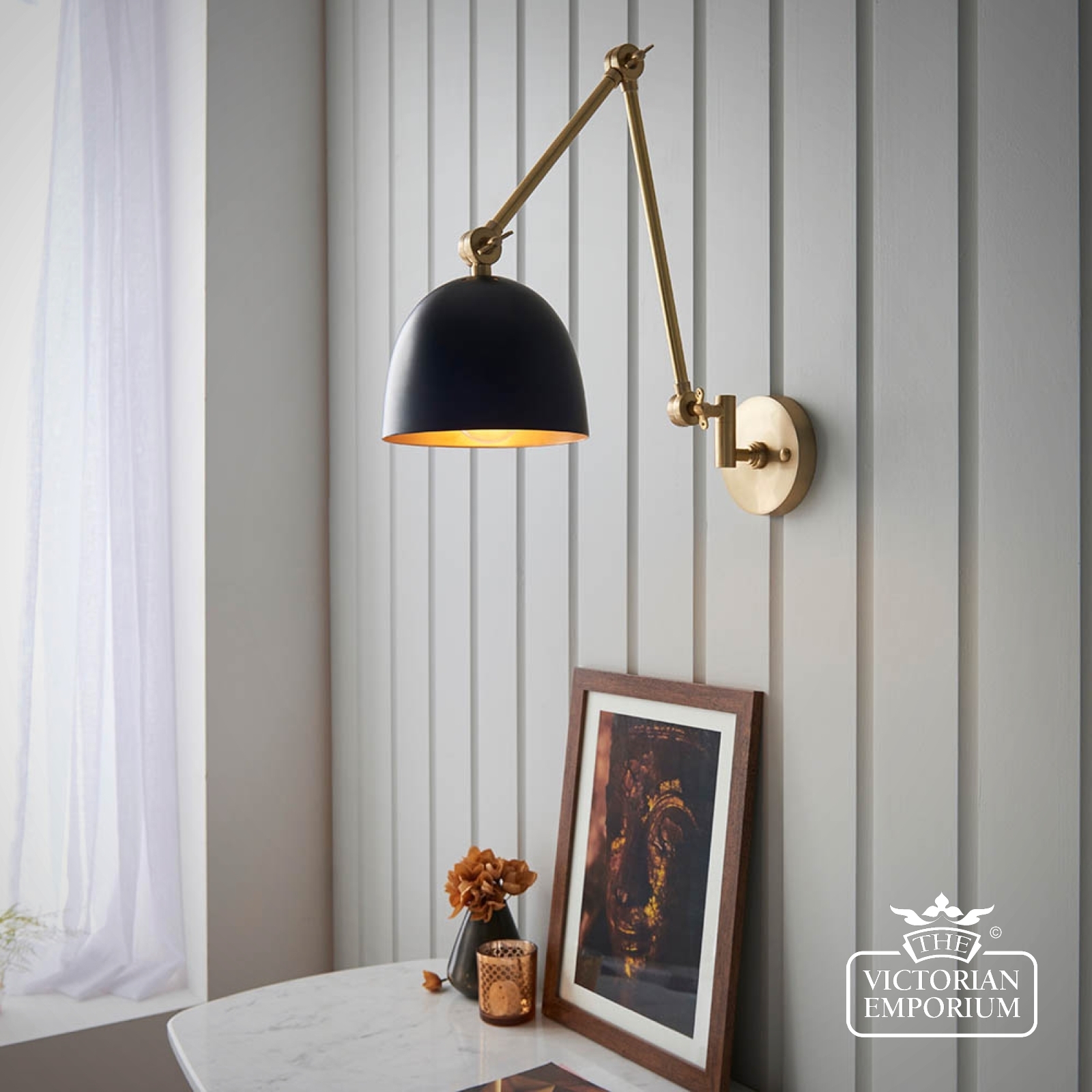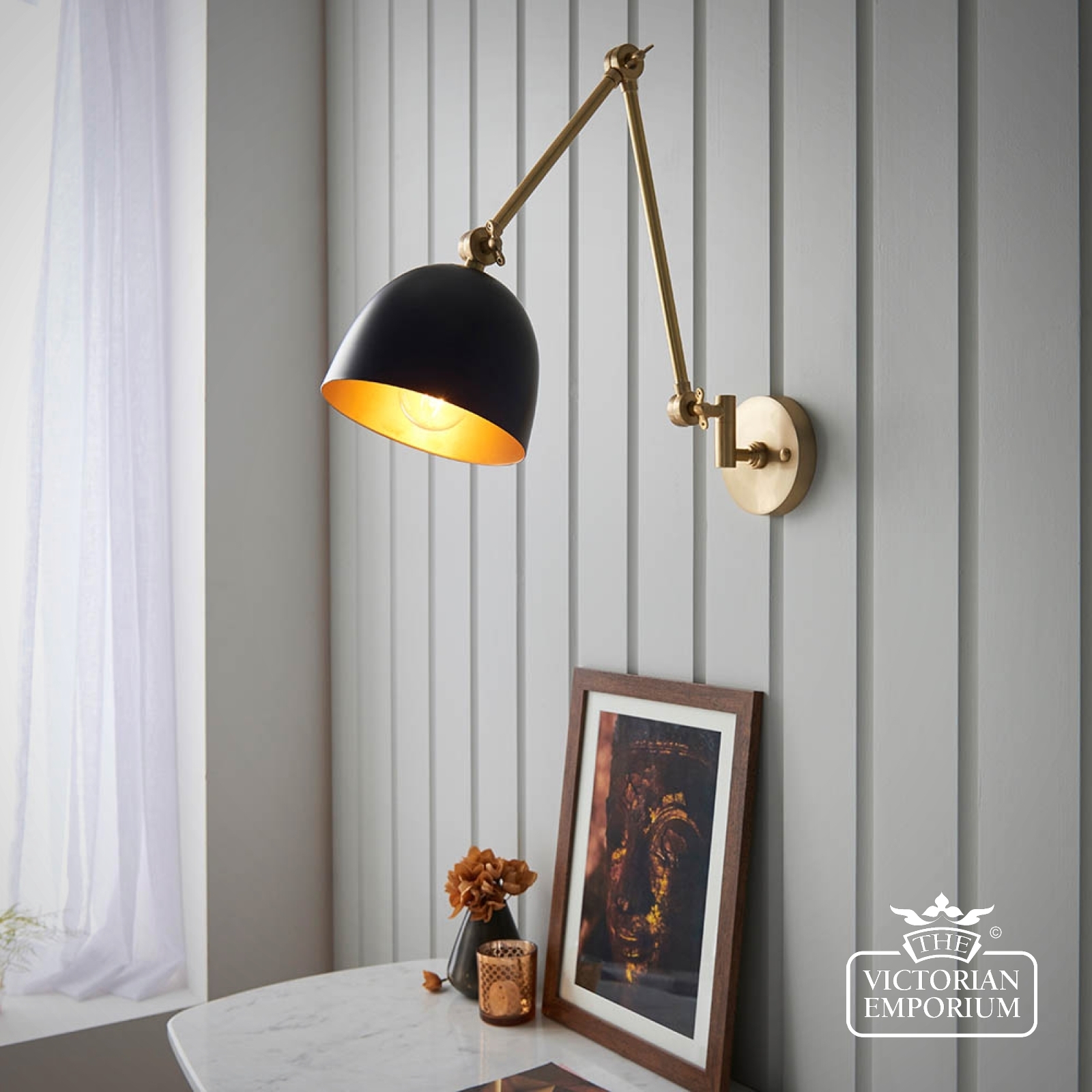 This attractive wall light has fully adjustable arms, to position either side of your bed or as a task light above a kitchen work top. It’s made of brass with a striking antique finish and a matt black painted shade.