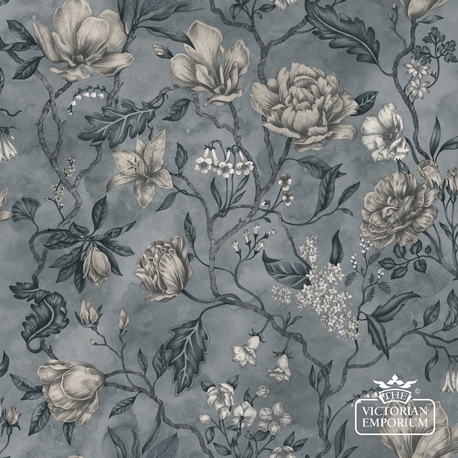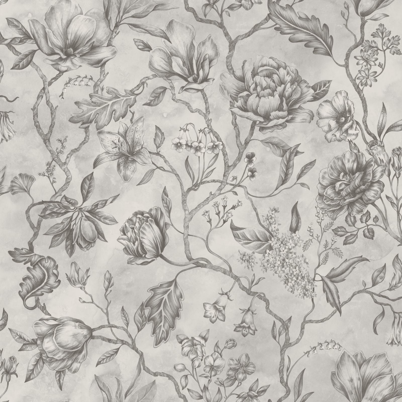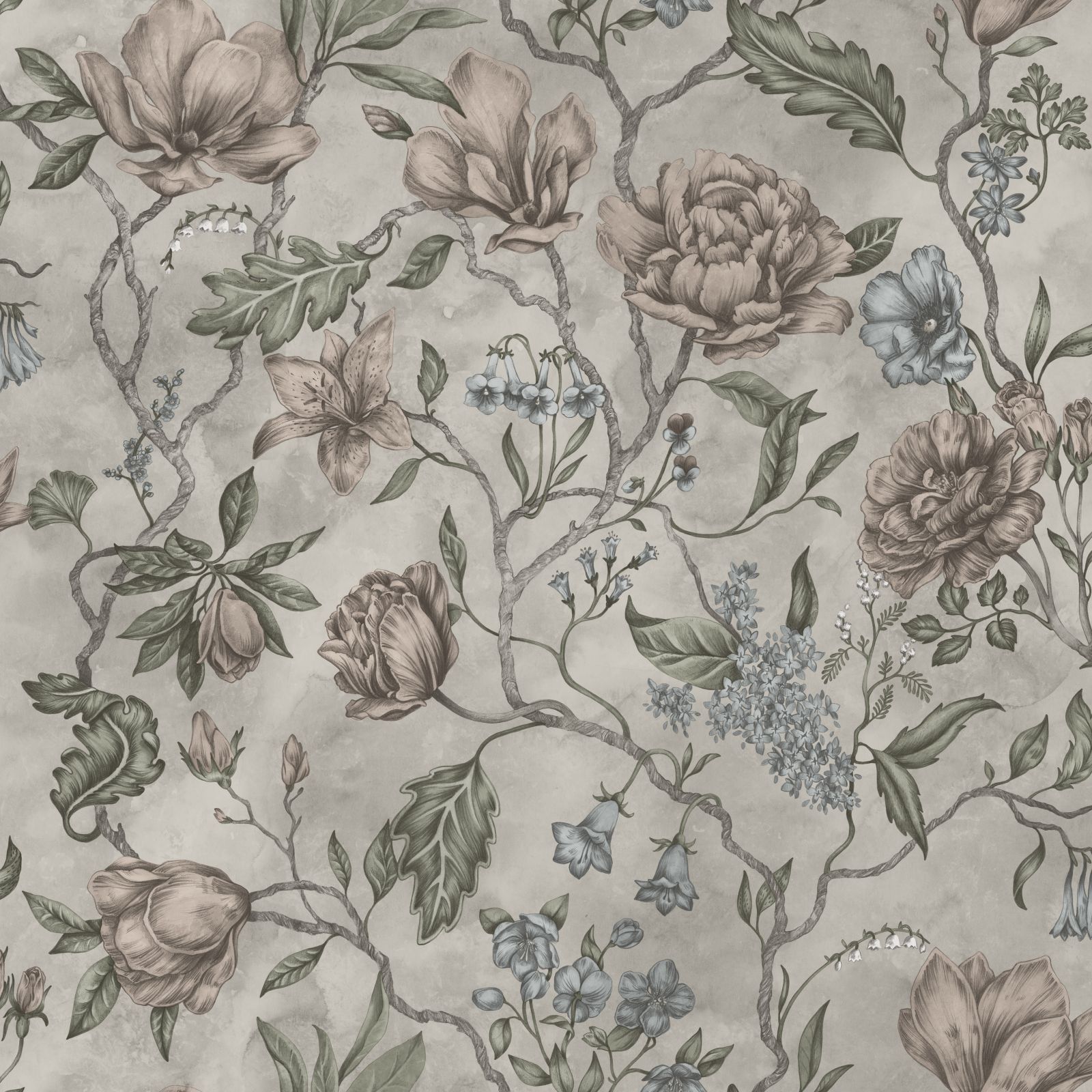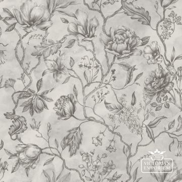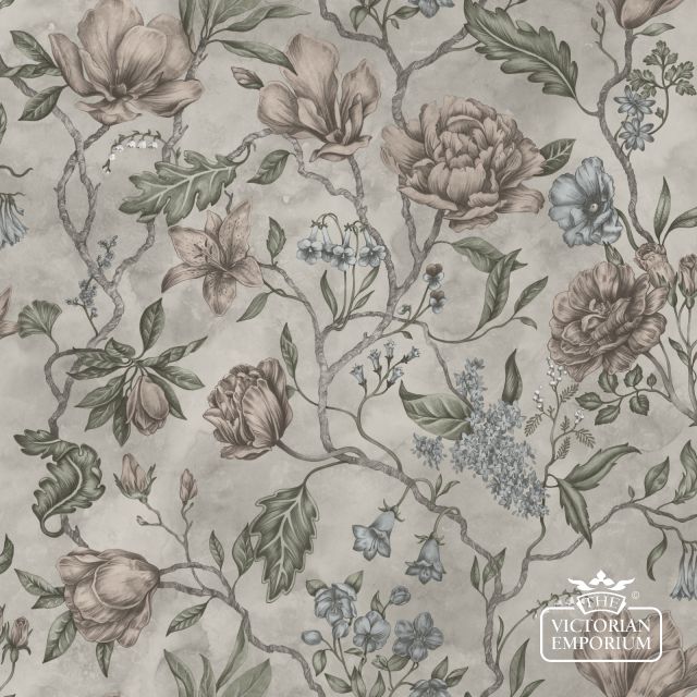 A beautiful hand painted wallpaper design featuring magnolias, forget-me-nots and roses which come to life over a dreamy and misty space.