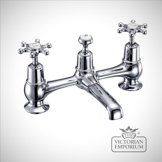Bridge basin mixer, with plug & chain waste, tap heads & base with high central indice with plug and chain waste and swivel