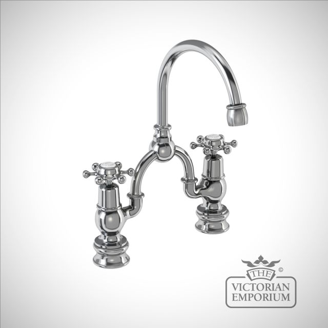 Bridge basin mixer, with plug & chain waste, tap heads & base with high central indice with plug and chain waste and swivel