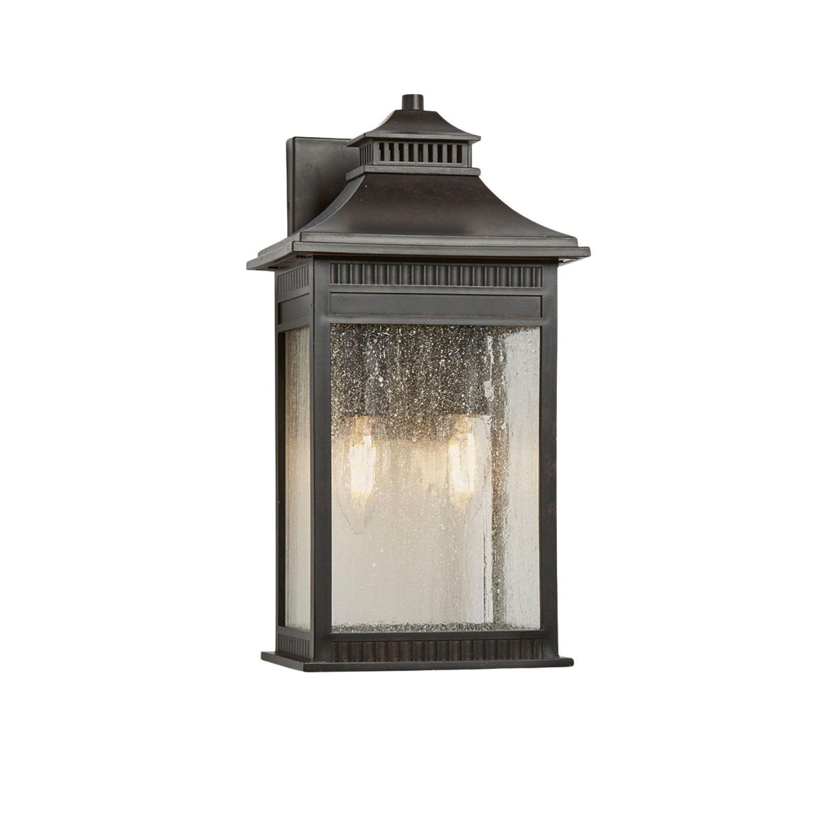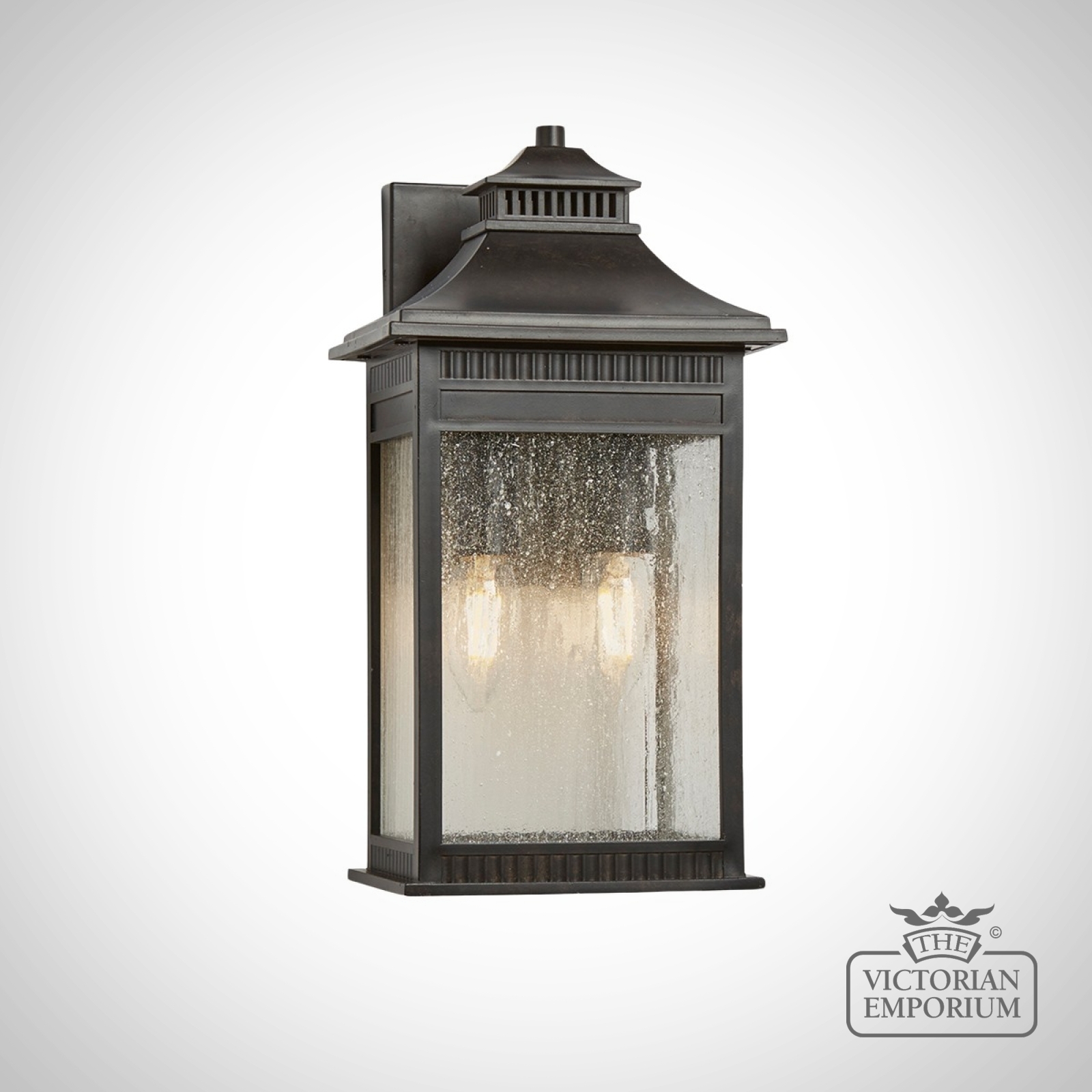 This lantern is designed for coastal locations with a 10 year warranty (5 years for the finish) to withstand extreme weather. It features clear seeded glass and a rich bronze finish