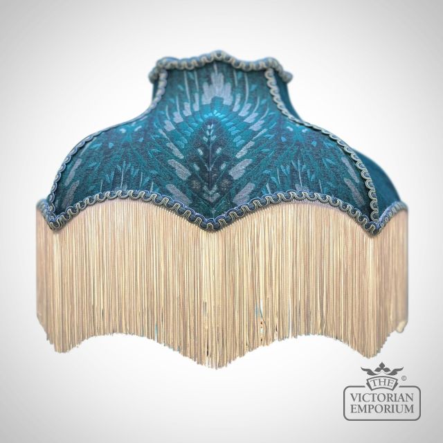 This is a beautiful Victorian Style lampshade with a deep aqua velvet body and beige fringing that can be purchased in a choice of sizes so that you can use it for table lamps, standing lamps, wall lights and ceiling lights around your period home
