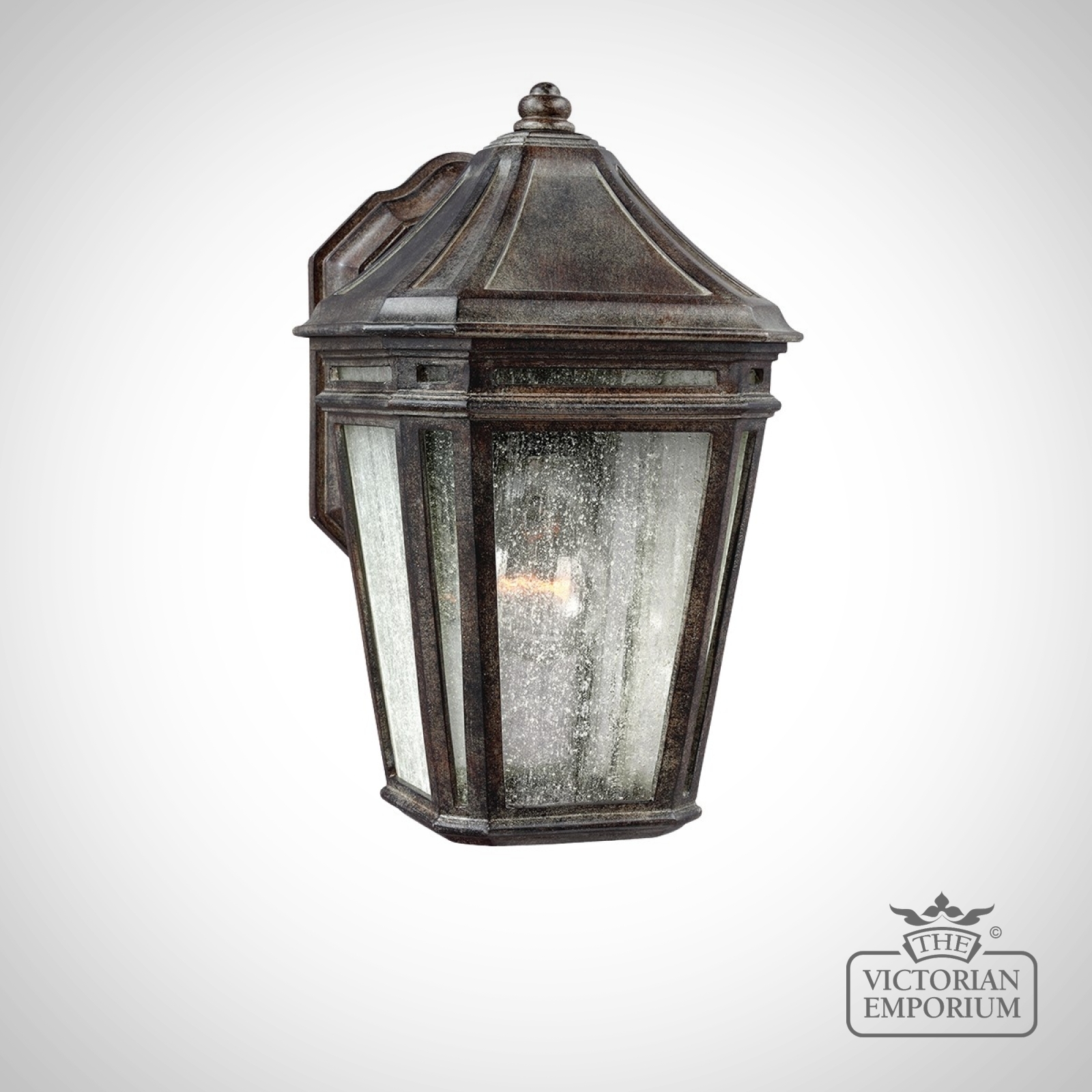 This lantern is designed for extreme weather and comes with a 5 year warranty. It has classic features with clear seeded glass with a chestnut finish