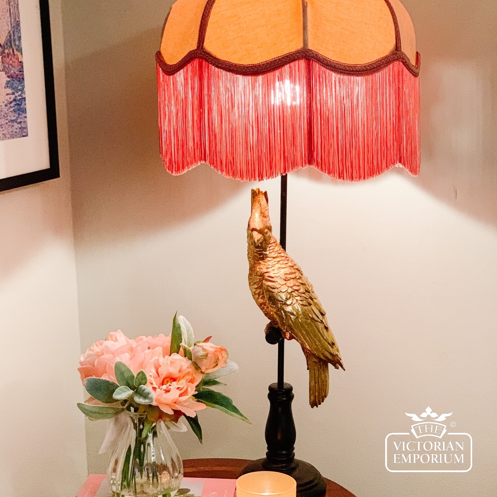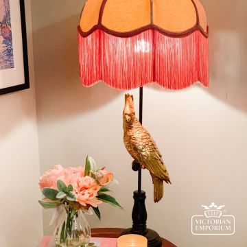 This beautiful Victorian style lamp shade has unlimited bespoke options. Please email us if you’d like to change the colour of fringing or even the fabric and we can provide you with a bespoke quotation.