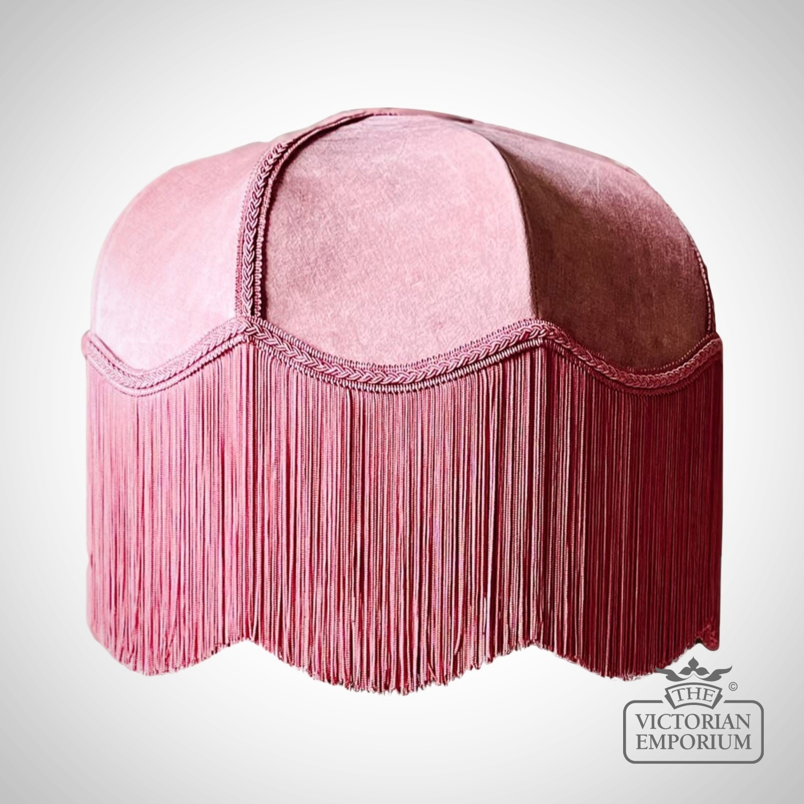 This is a beautiful Victorian Style lamp shade with a mid pink velvet body and matching fringing that can be purchased in a choice of sizes so that you can use it for table lamps, standing lamps, wall lights and ceiling lights around your period home