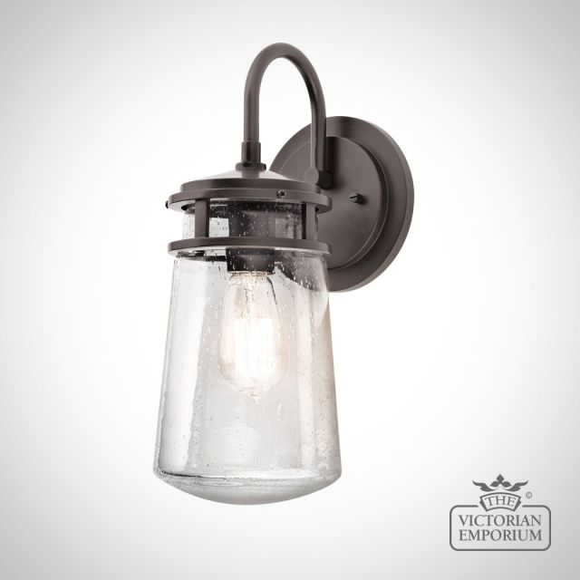 This outdoor wall light has a simple design with traditional detailing in a bronze finish with clear seeded glass