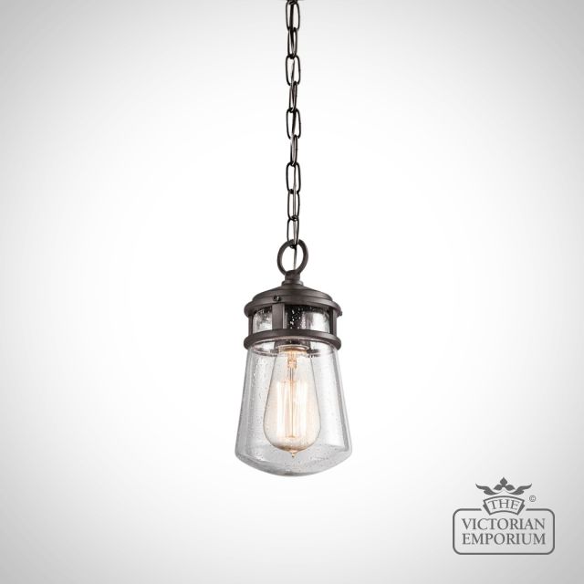 This outdoor chain lantern has a simple design with traditional detailing in a bronze finish with clear seeded glass