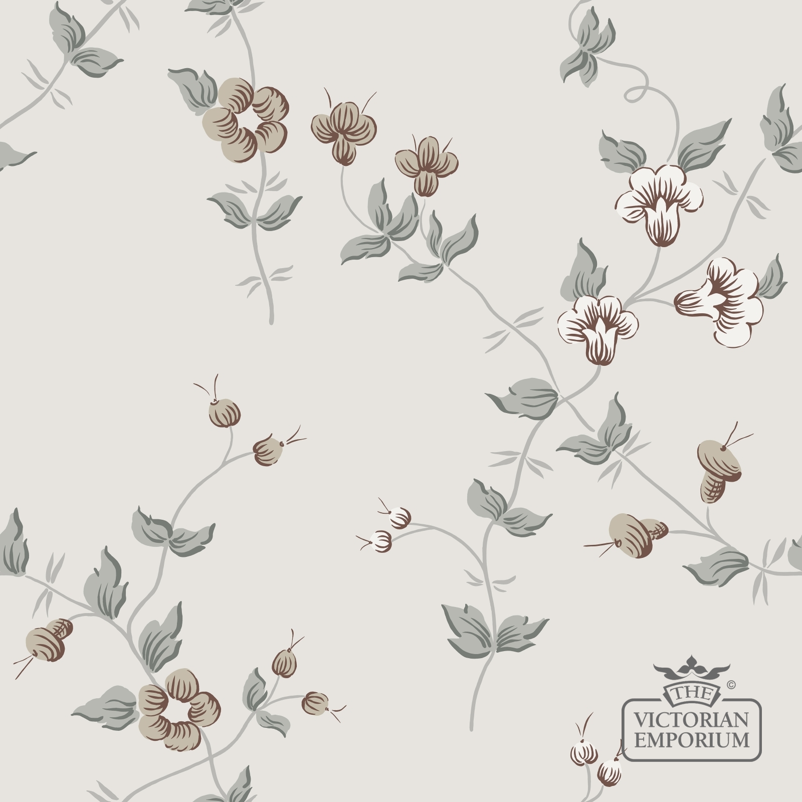 Guest room number 13 in Löfstad Castle was said to be haunted and that any wallpaper adorning the walls kept falling off. In the end, it was decided to paint delicate floral patterns directly on the wall using a thin brush. Inspiration was drawn from an 18th-century wallpaper, located in one of the castle’s wardrobes. This wallpaper that copies this design has a natural simplicity. Design: Original 18th century (Löfstad Castle)