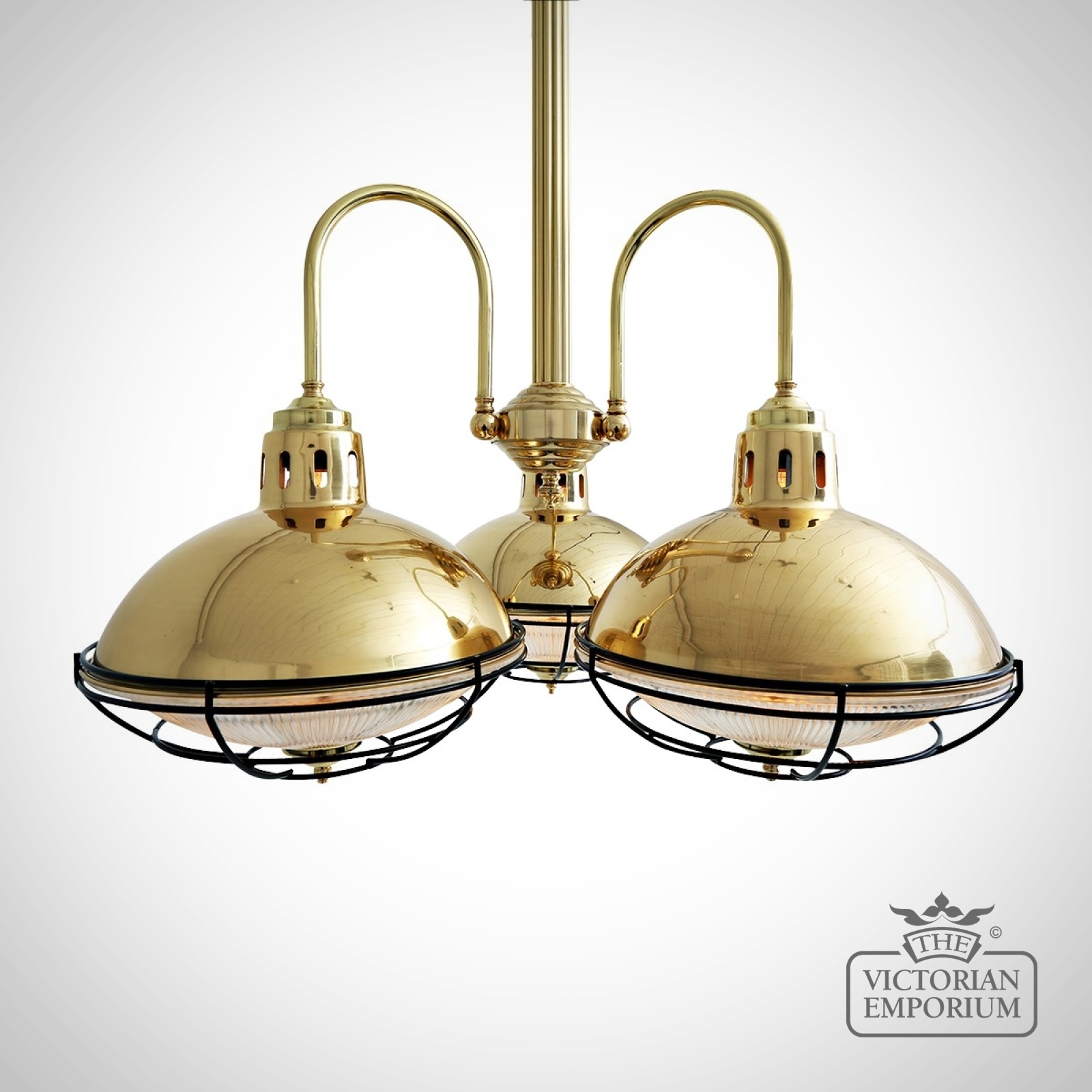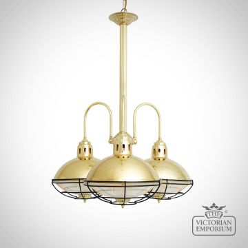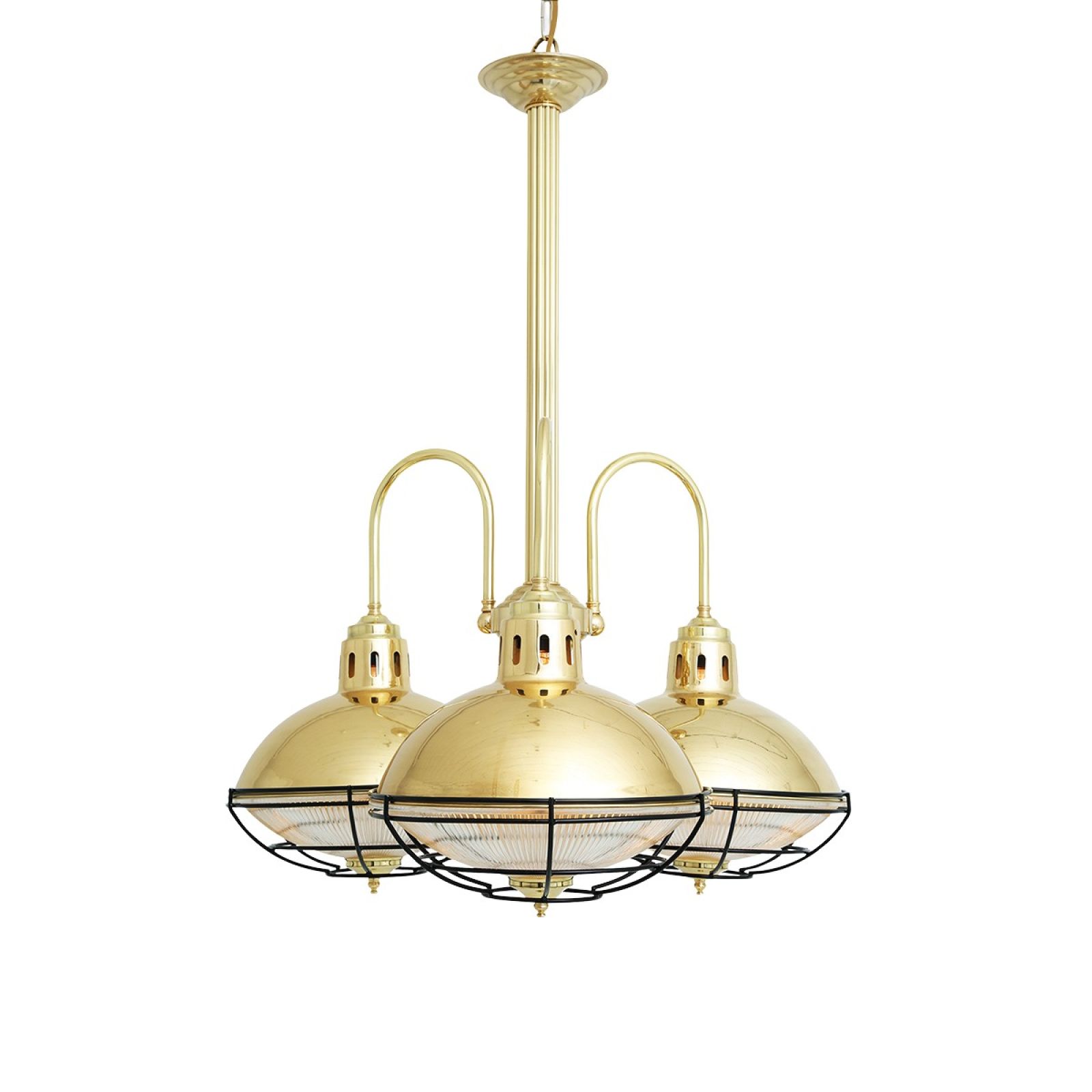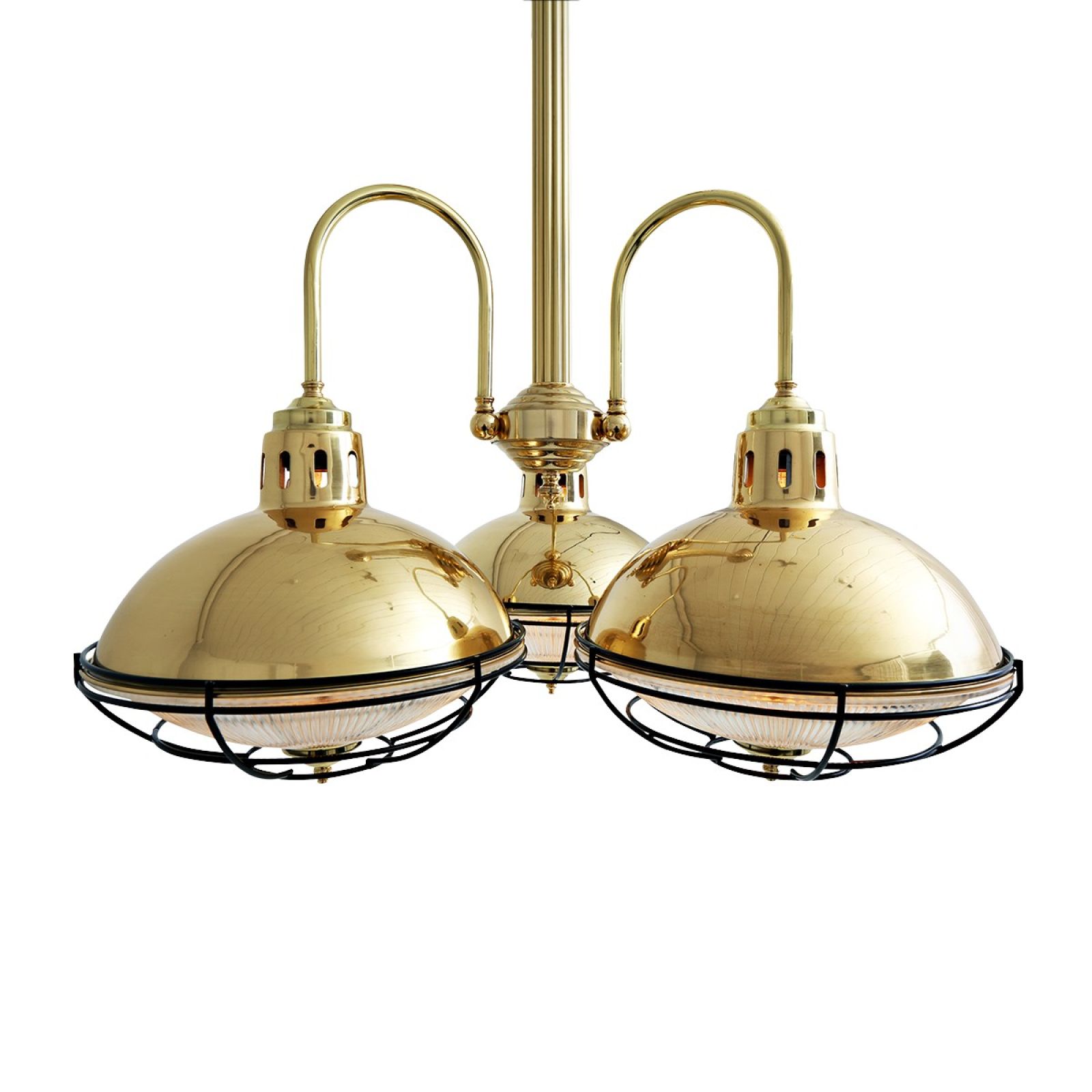 The chandelier comes complete with Holophane glass shades and brass protective cage, beautiful when lit with a warm bulb.