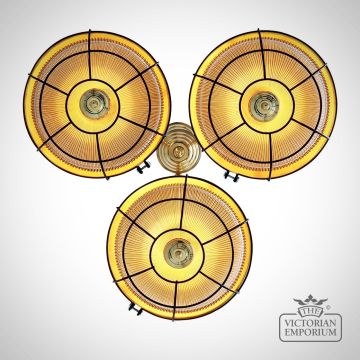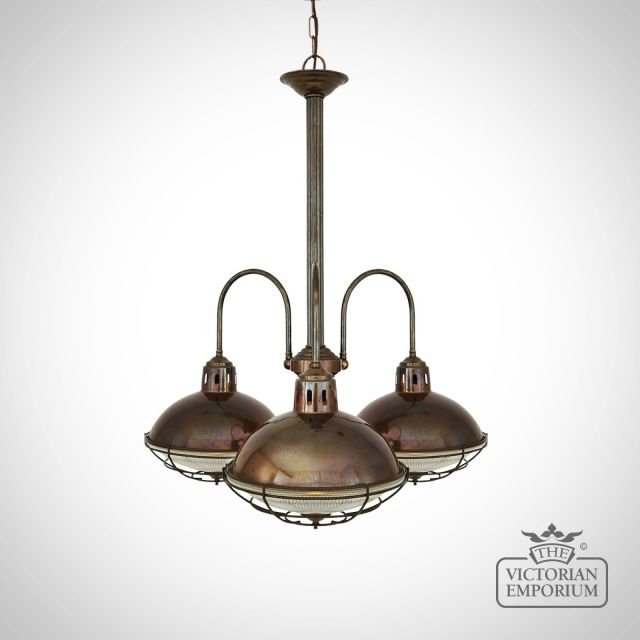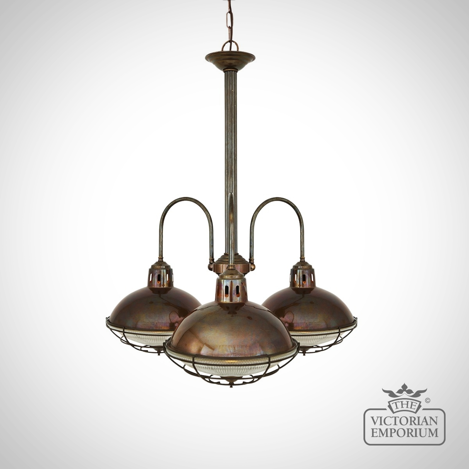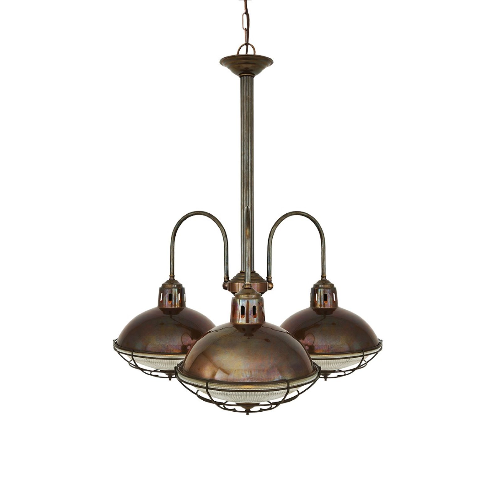 The chandelier comes complete with Holophane glass shades and brass protective cage, beautiful when lit with a warm bulb.