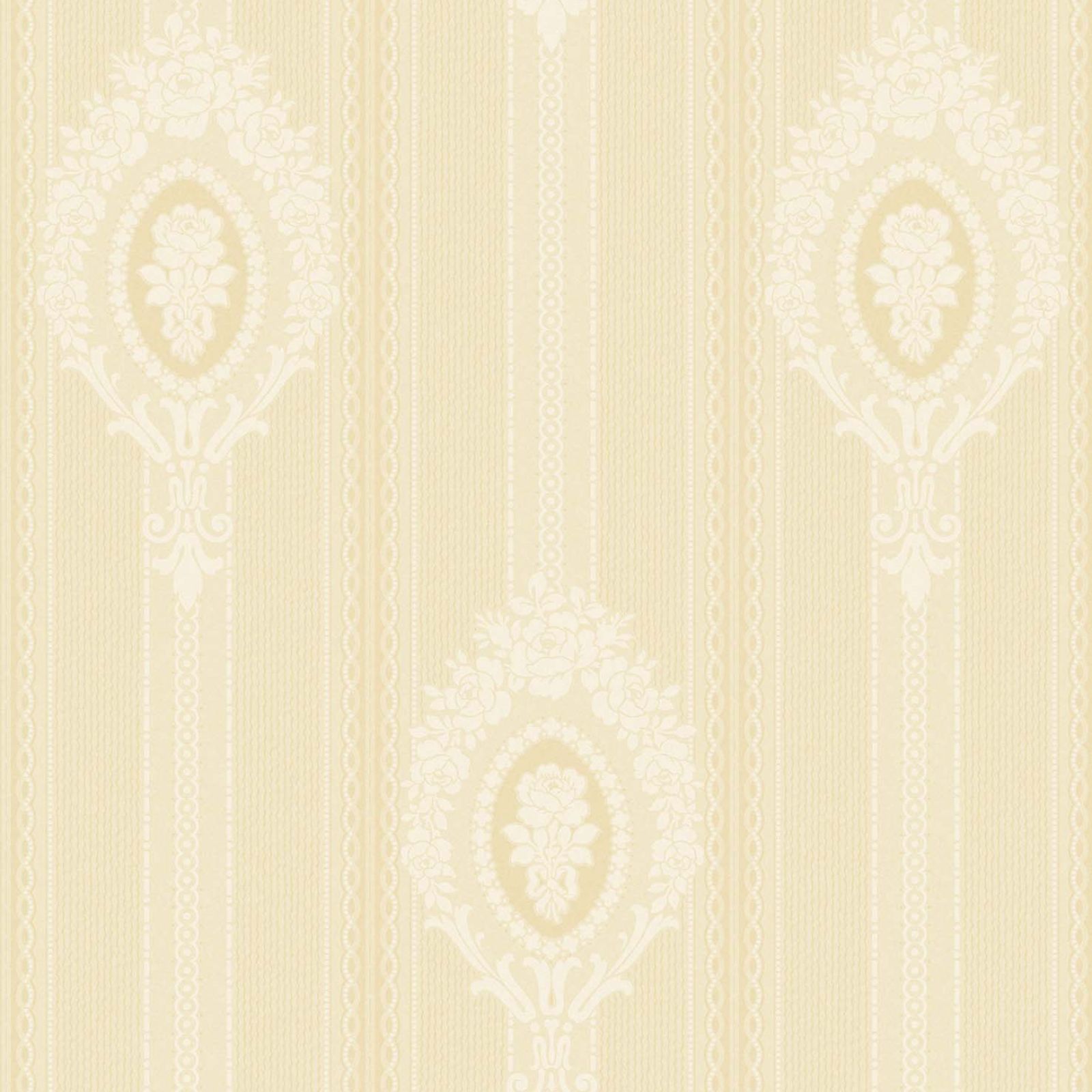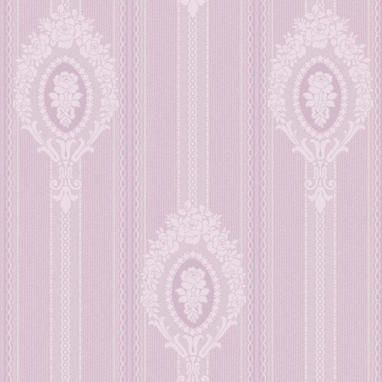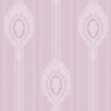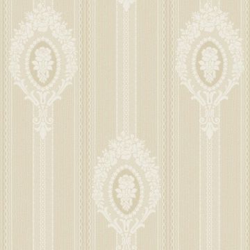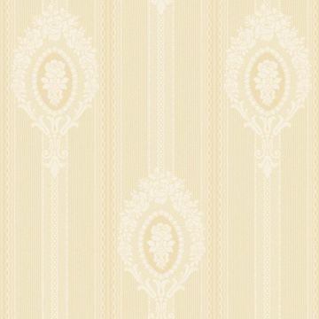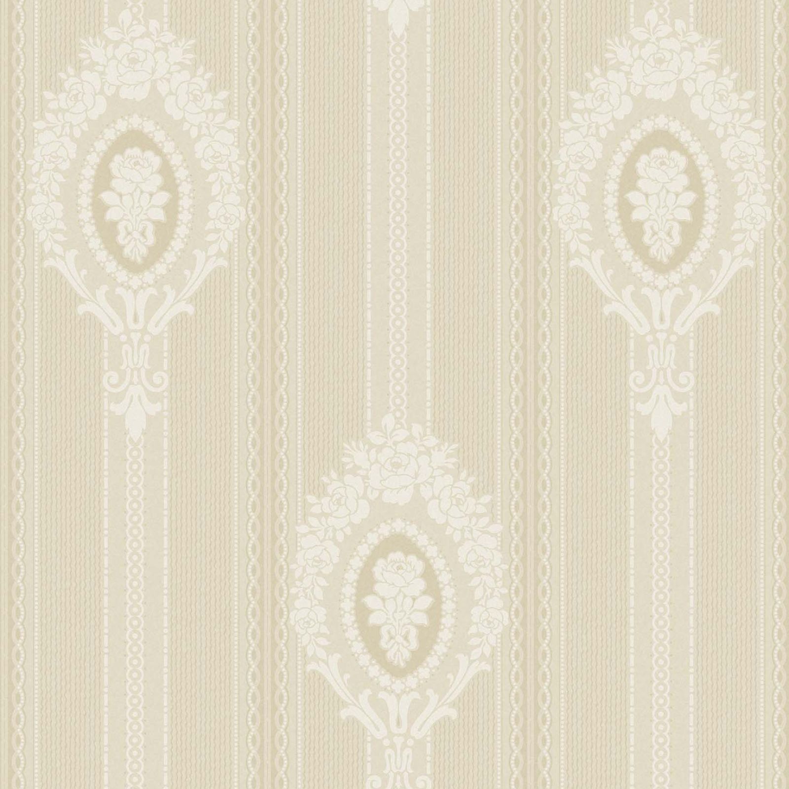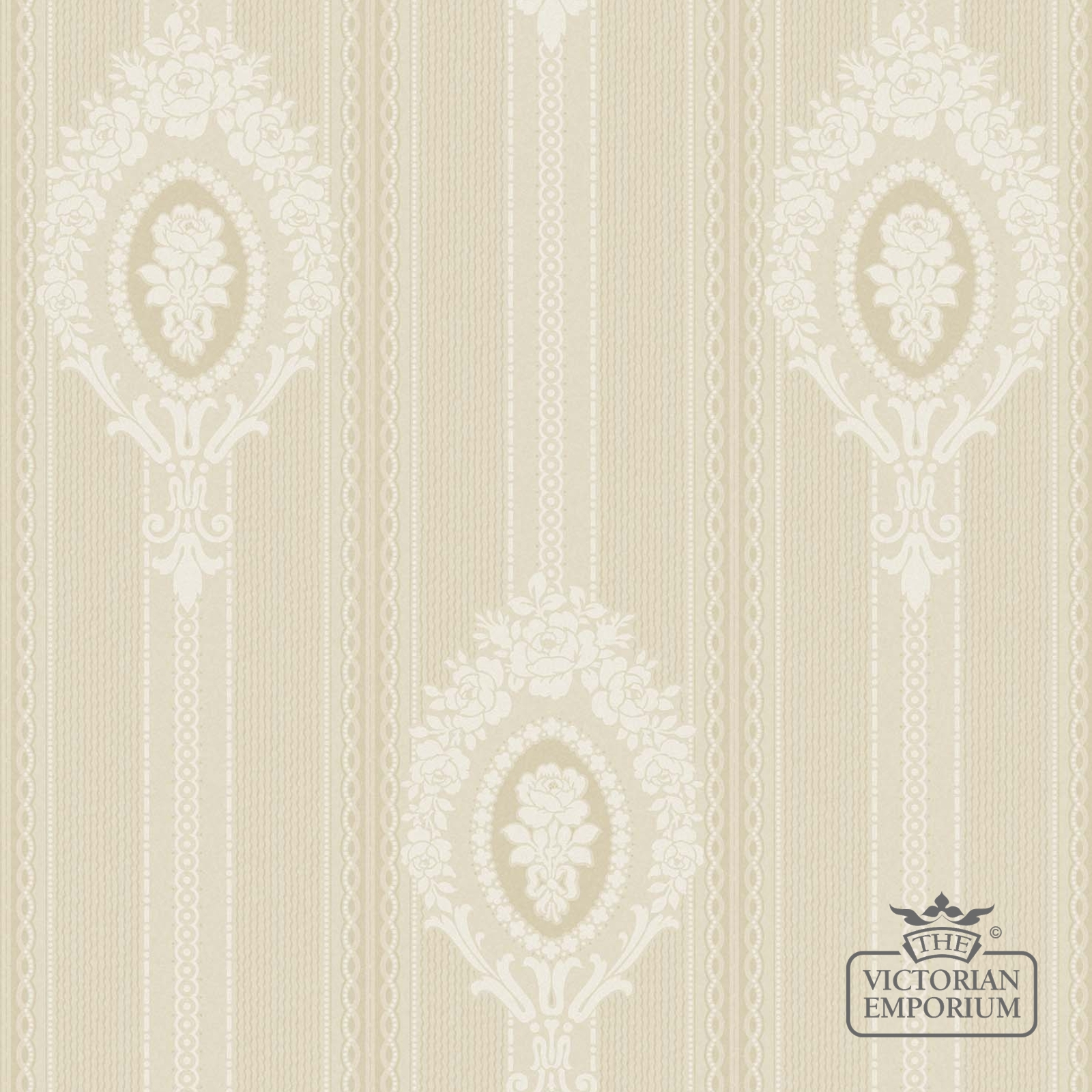 A pretty two tone wallpaper featuring a medallion type design with two tone stripes. This design would be suitable for a hallway, bedroom or bathroom.