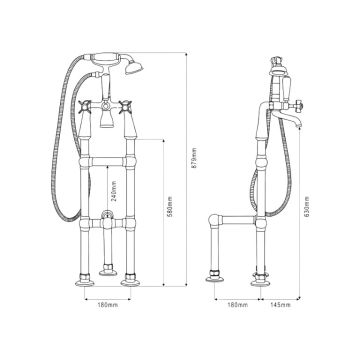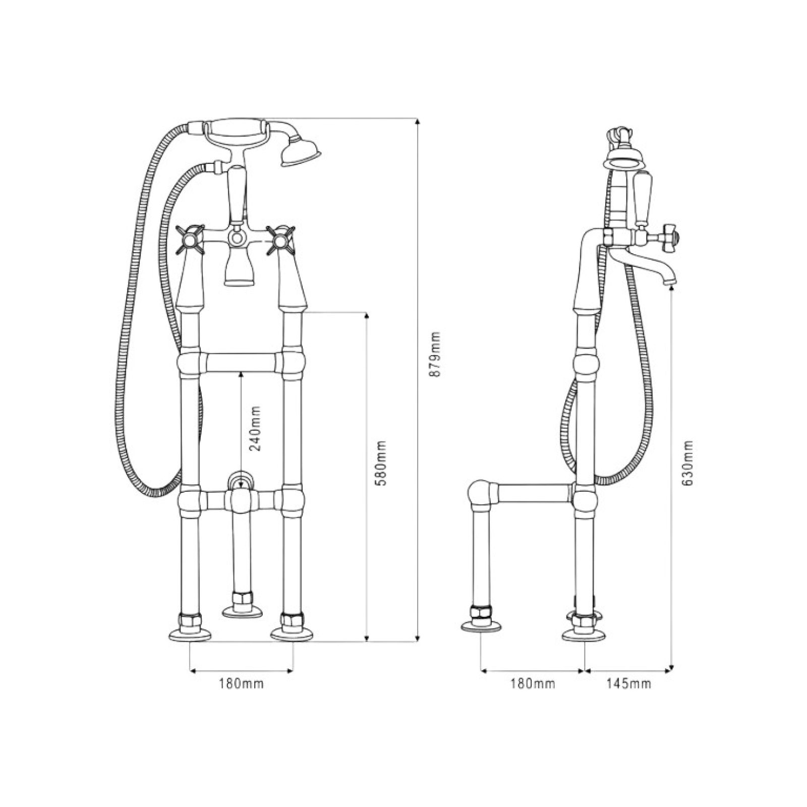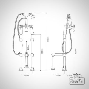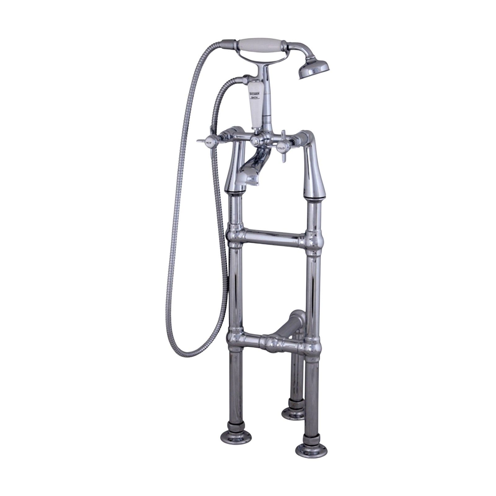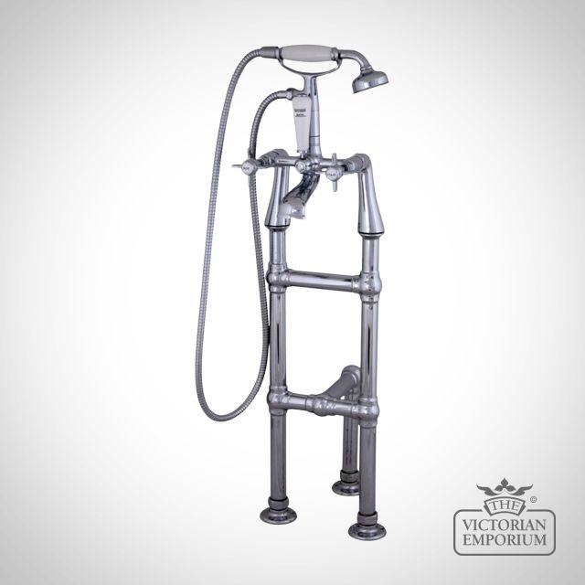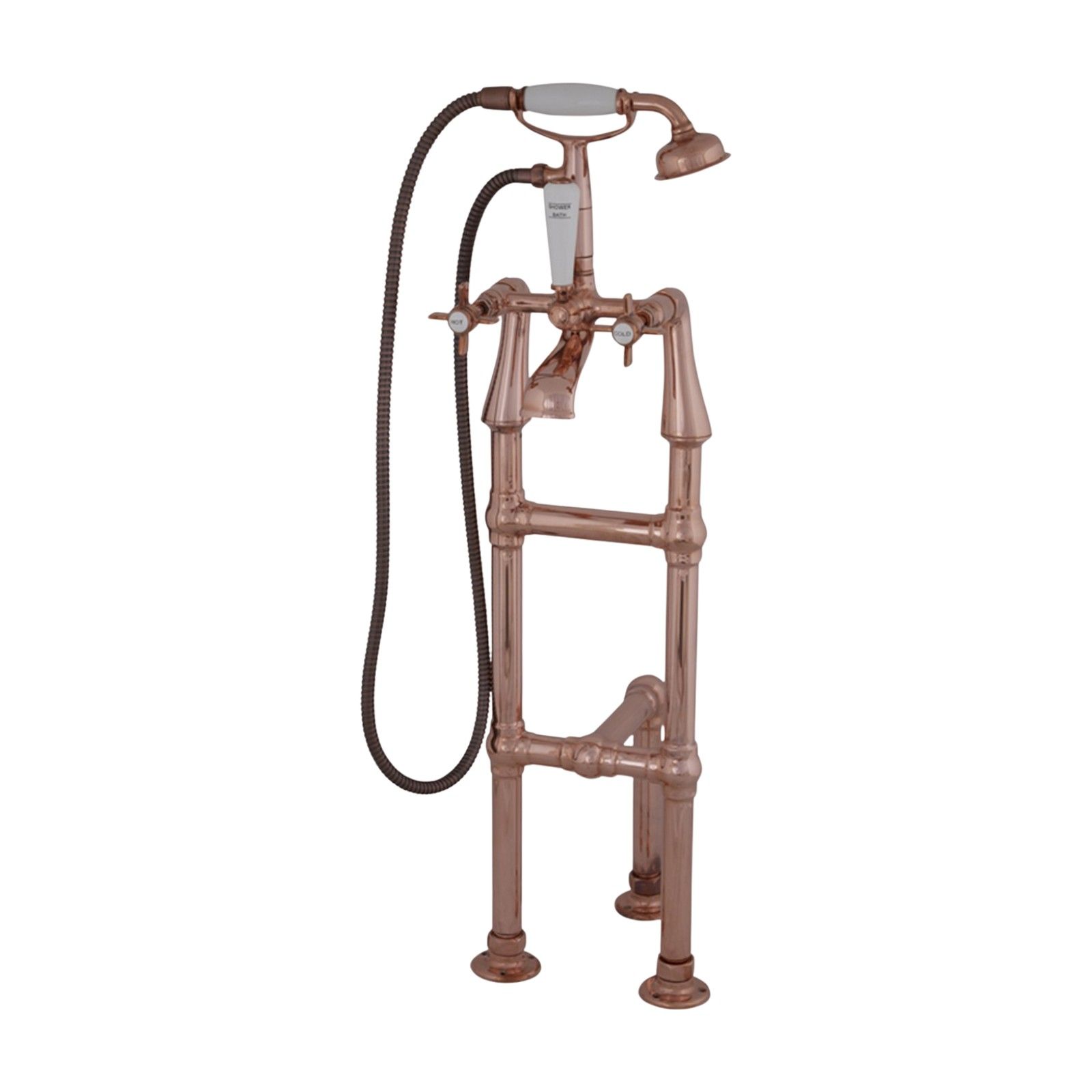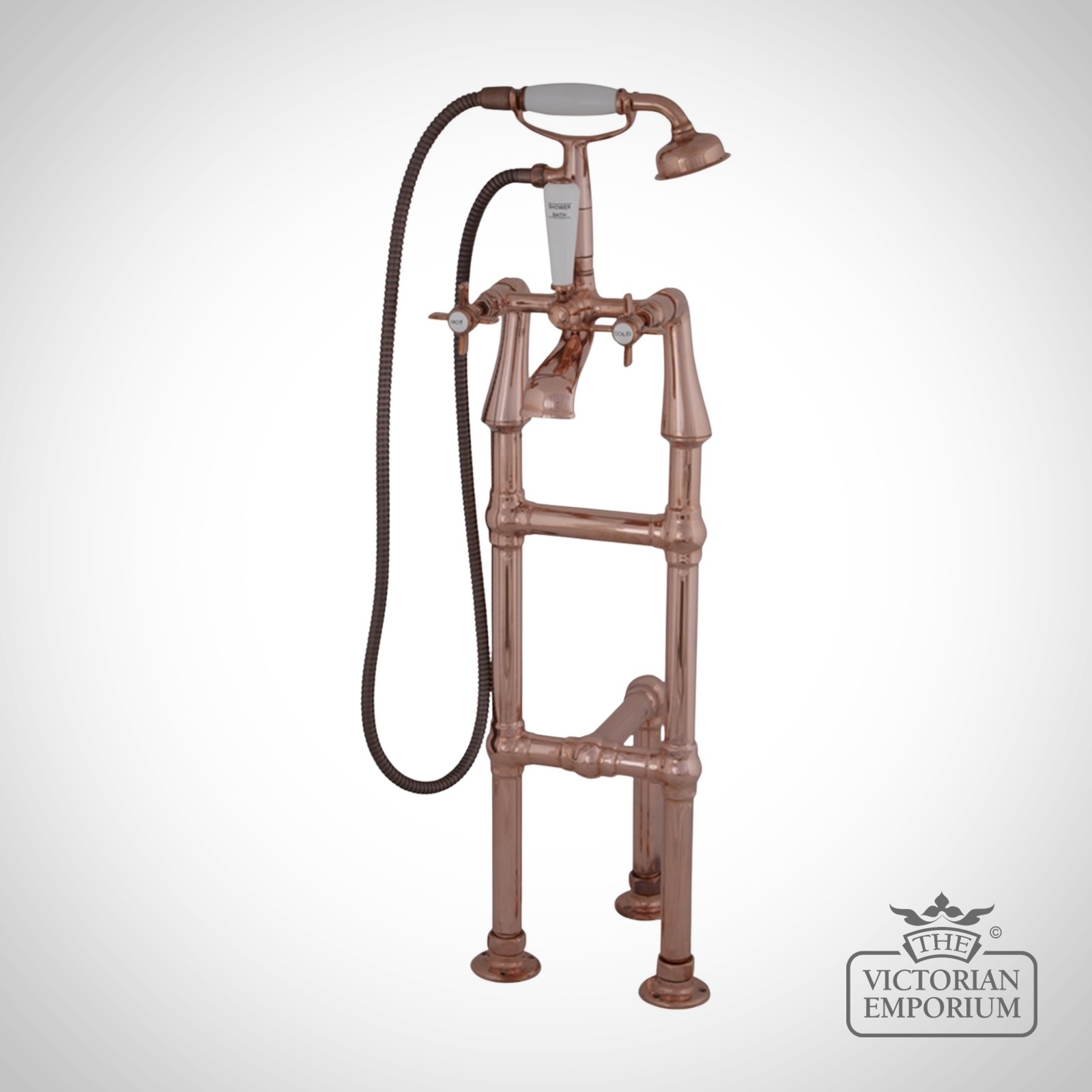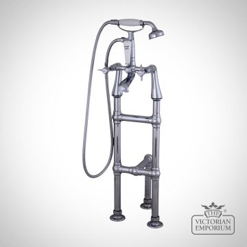 Traditional set of standing bath taps with chrome or copper finish with a supporting leg - a wonderful addition to any period bathroom