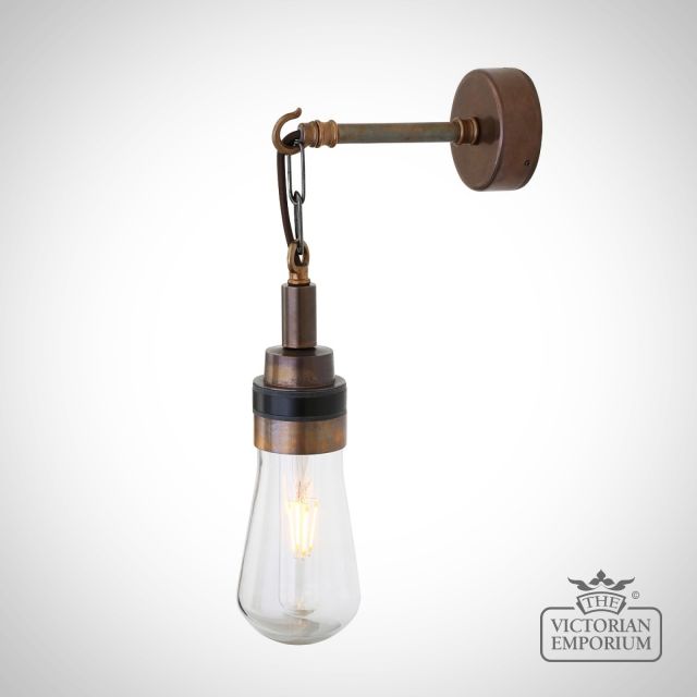 This fitting is suspended by chain and open hook that is attached to a brass sleeve and wall bracket.