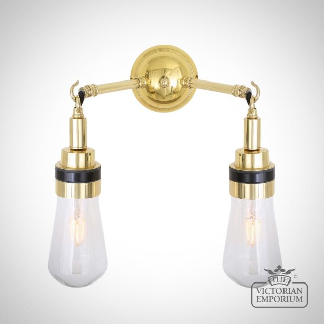 The Meri is an industrial-style double wall light that is suitable for installation in all rooms including in bathrooms and most outdoor areas, with a single dome wall bracket with two arms suspending two IP rated lamps.