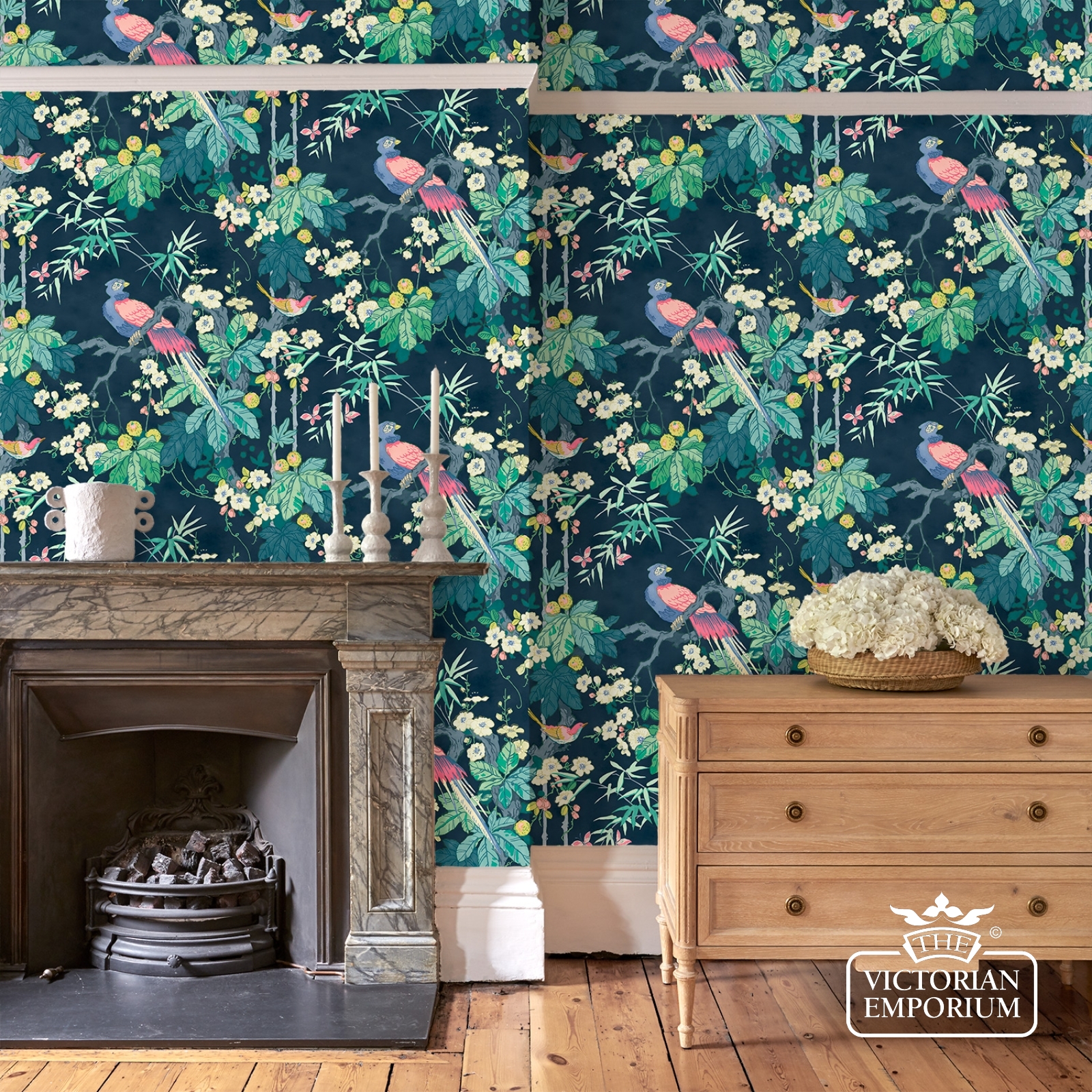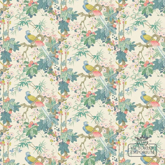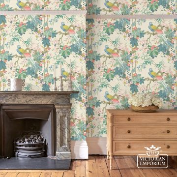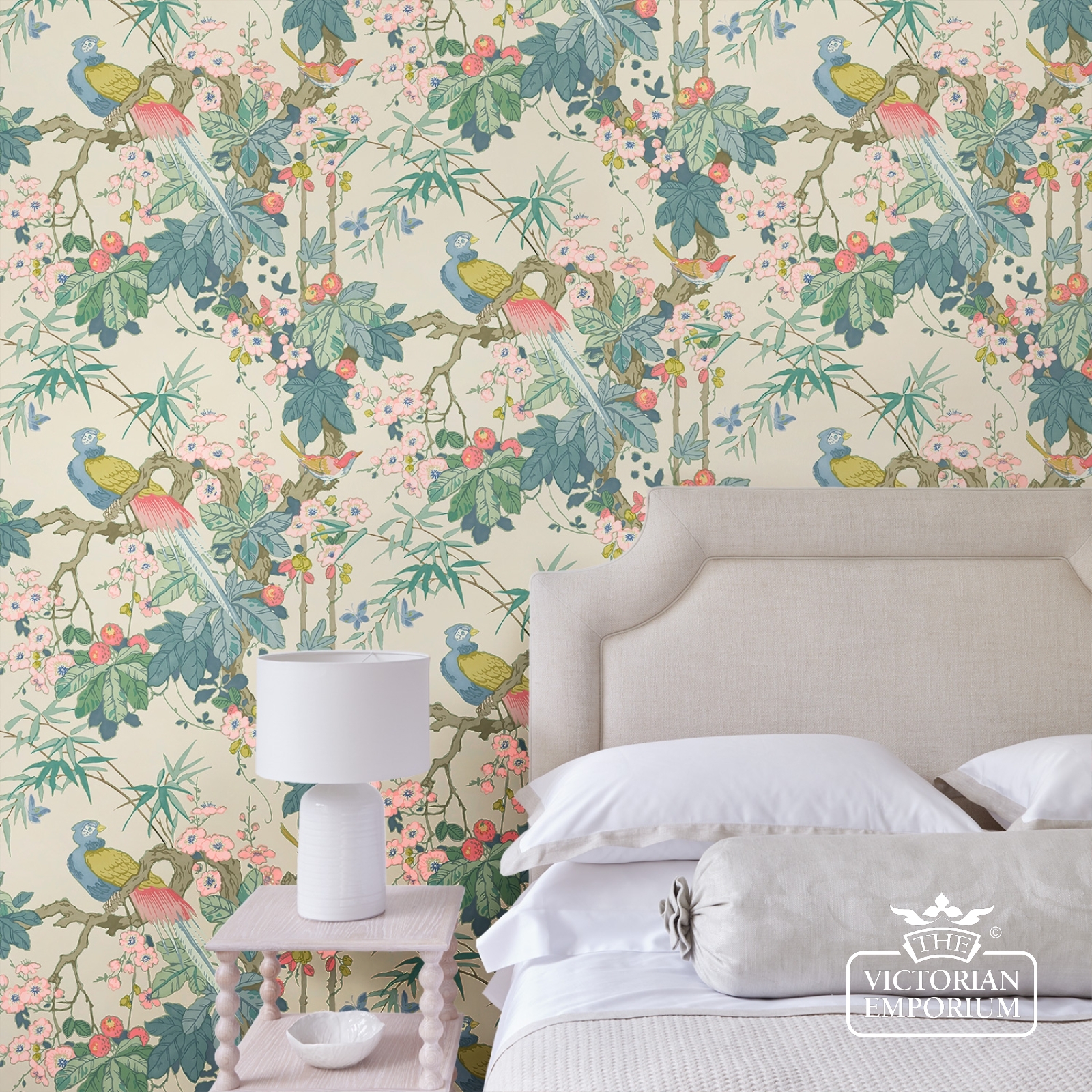 Against a simple, airy background, birds perch amongst bamboo and deliciously scented blossom; a wallpaper for any home.