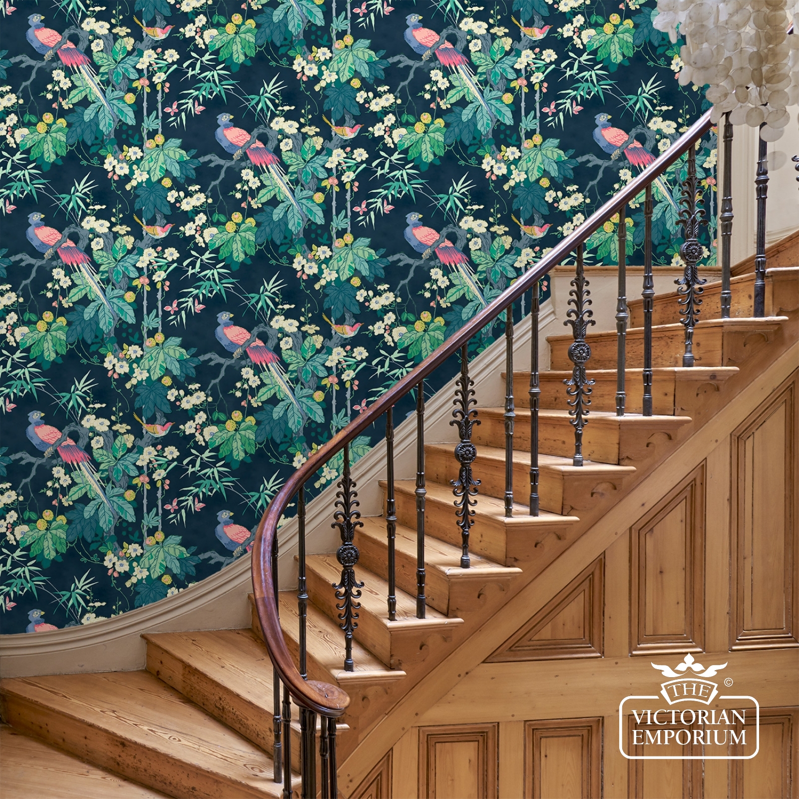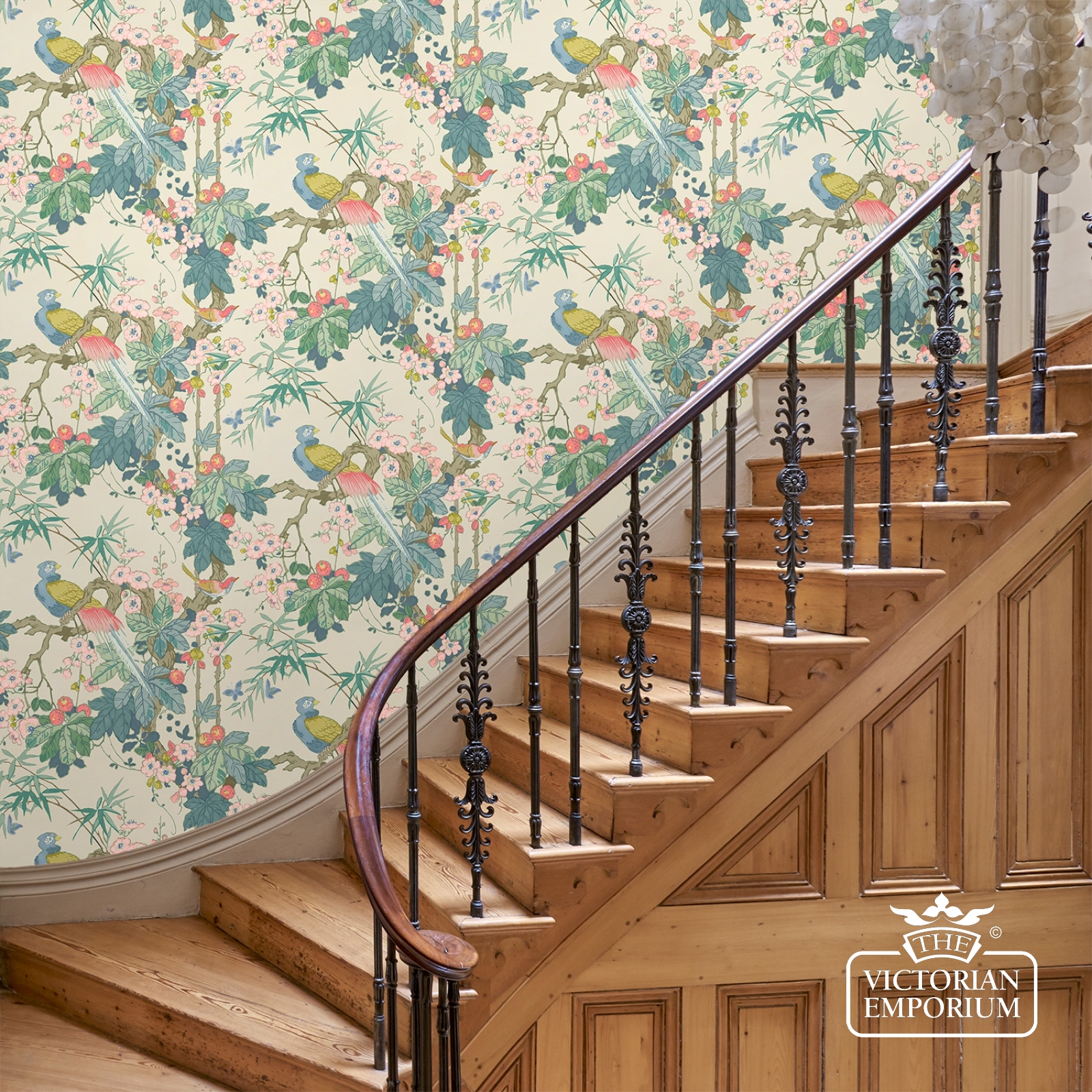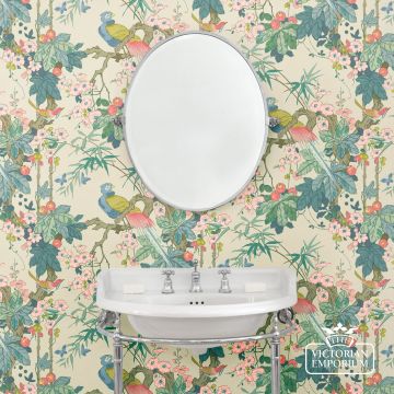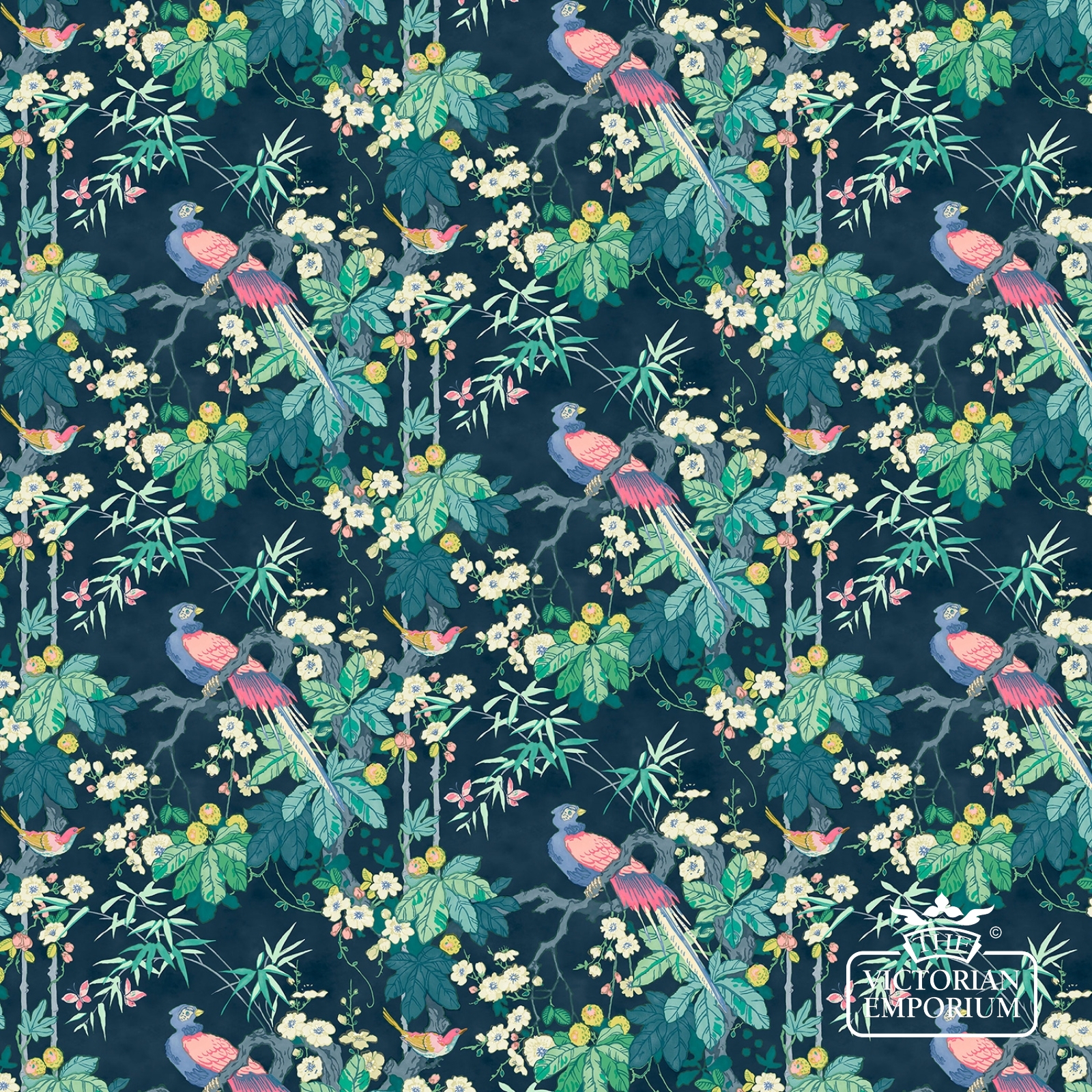 Against a simple, airy background, birds perch amongst bamboo and deliciously scented blossom; a wallpaper for any home.