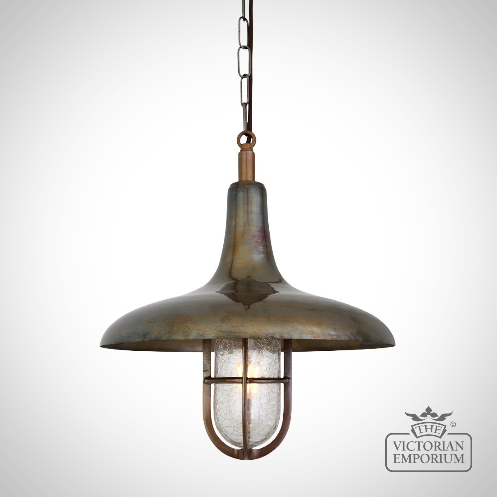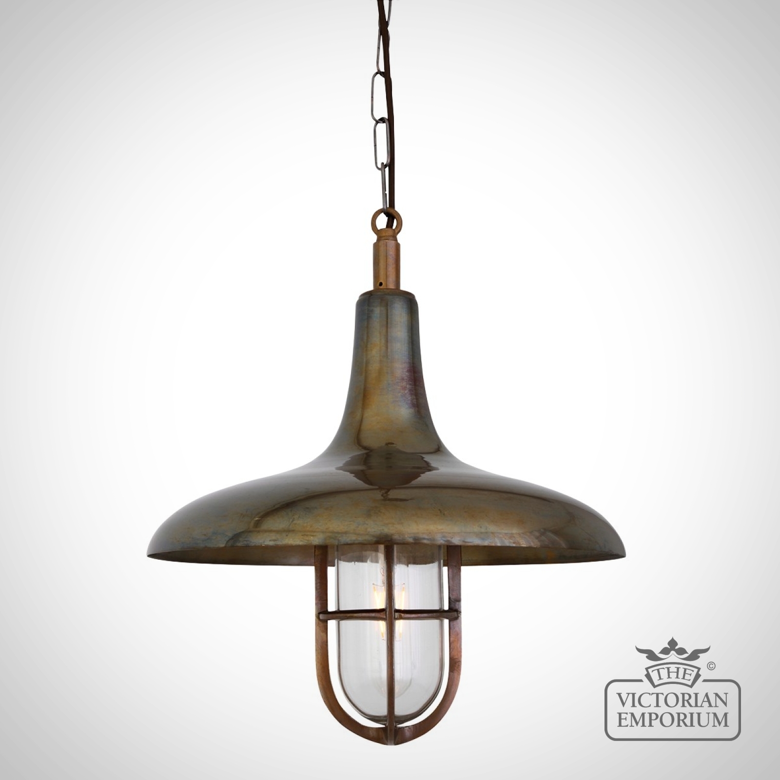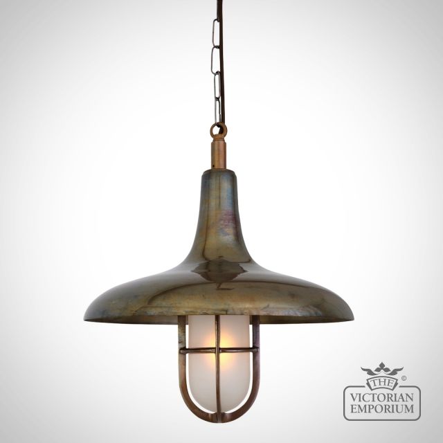 The Mirar is a nautical style pendant light with an industrial-style brass metal shade with a well glass lamp that is IP65 rated and can be installed in most bathroom and outdoor locations.