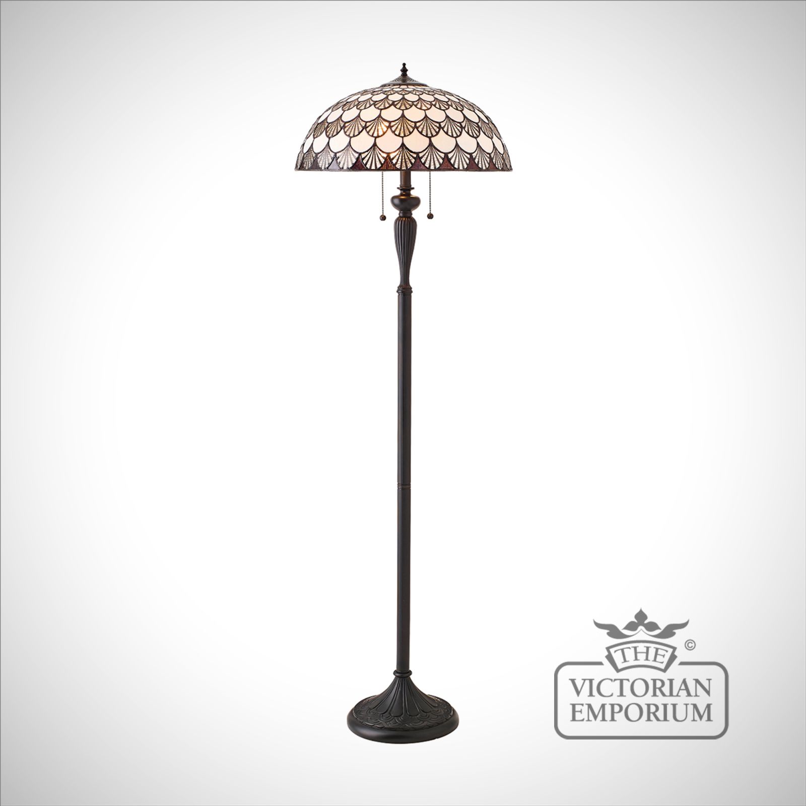 An attractive Tiffany style floor light formed from scalloped shaped glass sections in creams and browns, and teamed with a traditional bronze effect fitting