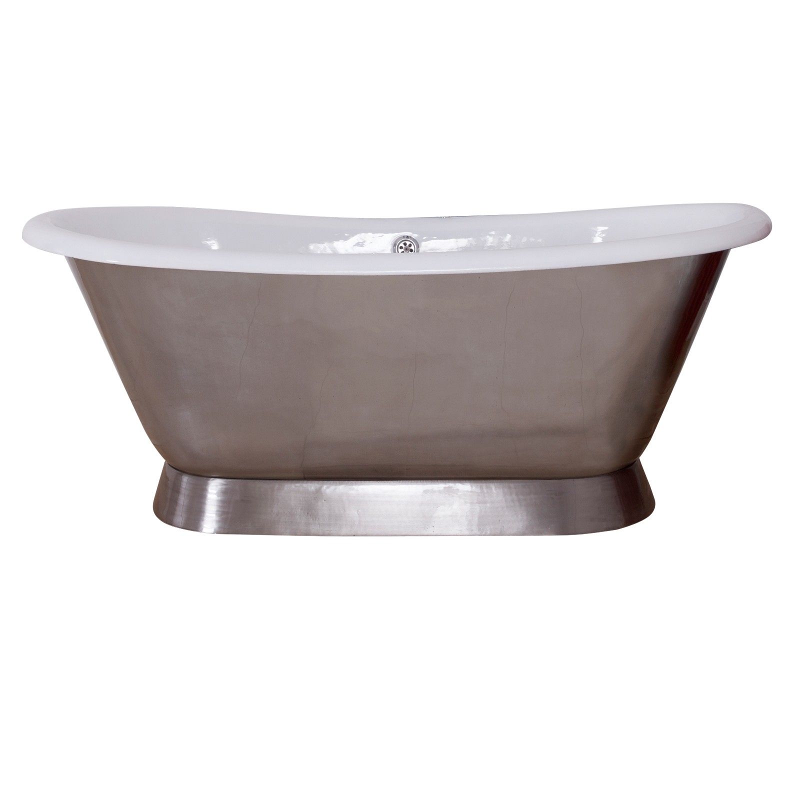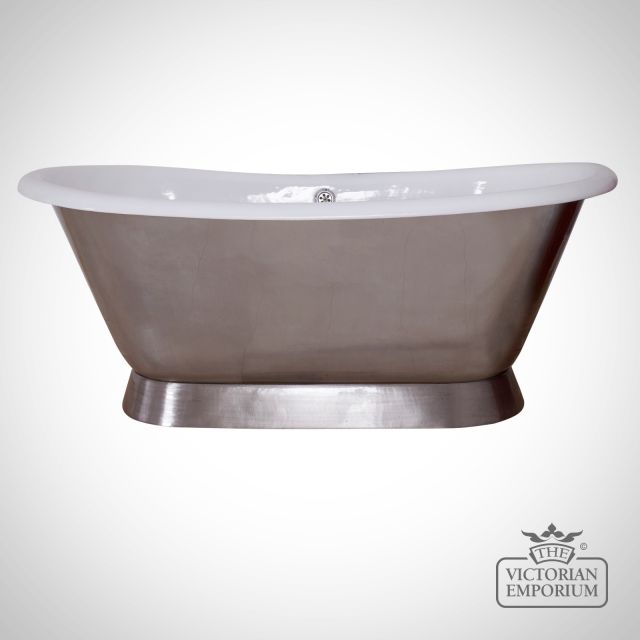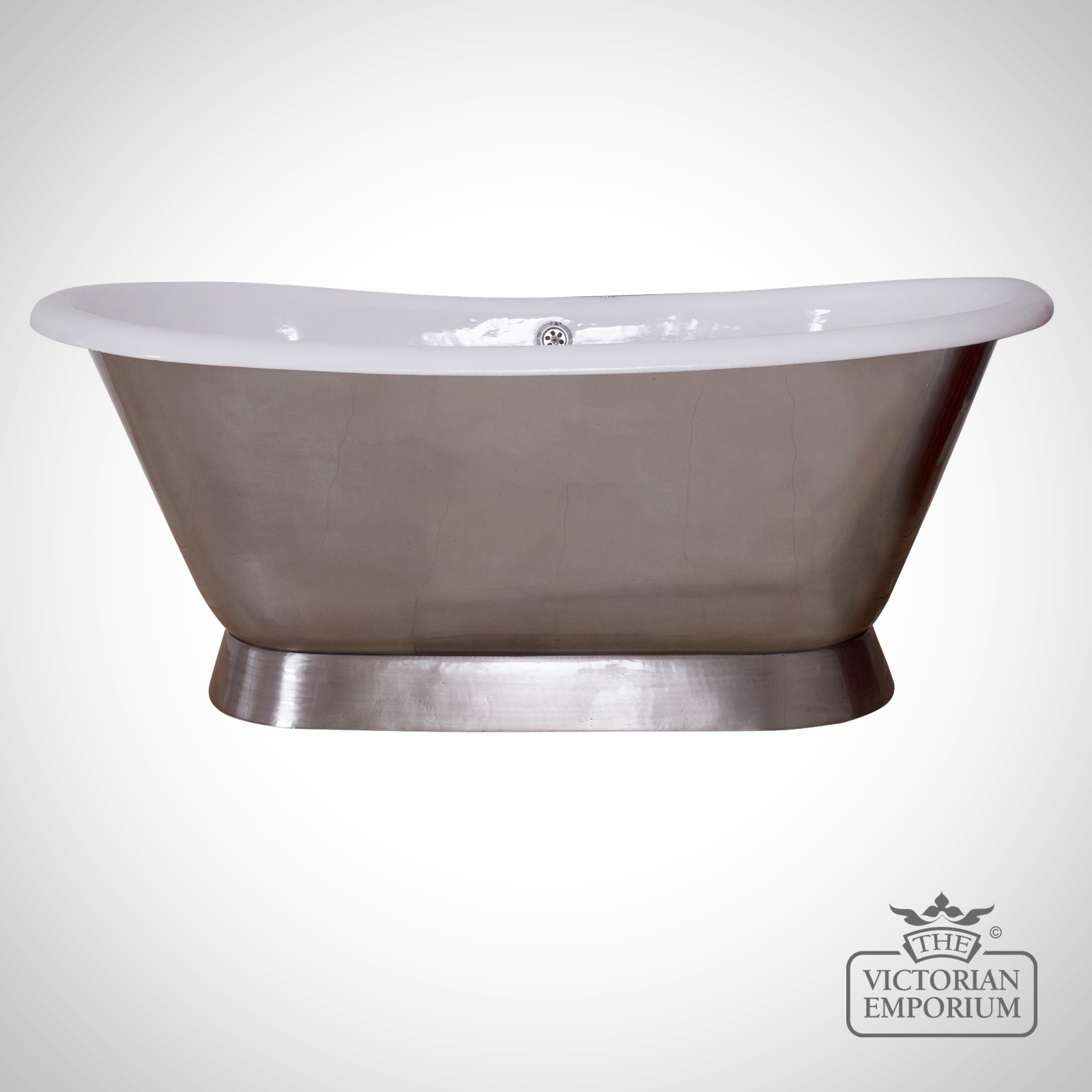 Large pewter lustre cast iron bath without tap holes. This is a less shiny finish than traditional polished or nickel baths.