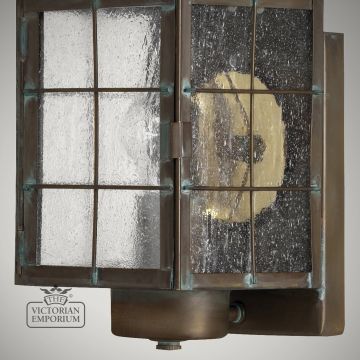 This is a Nautical Style Wall Lantern in Aged Brass made from Solid Brass with Clear Seeded Glass. The design style is timeless New England and the lamp features bright brass reflectors