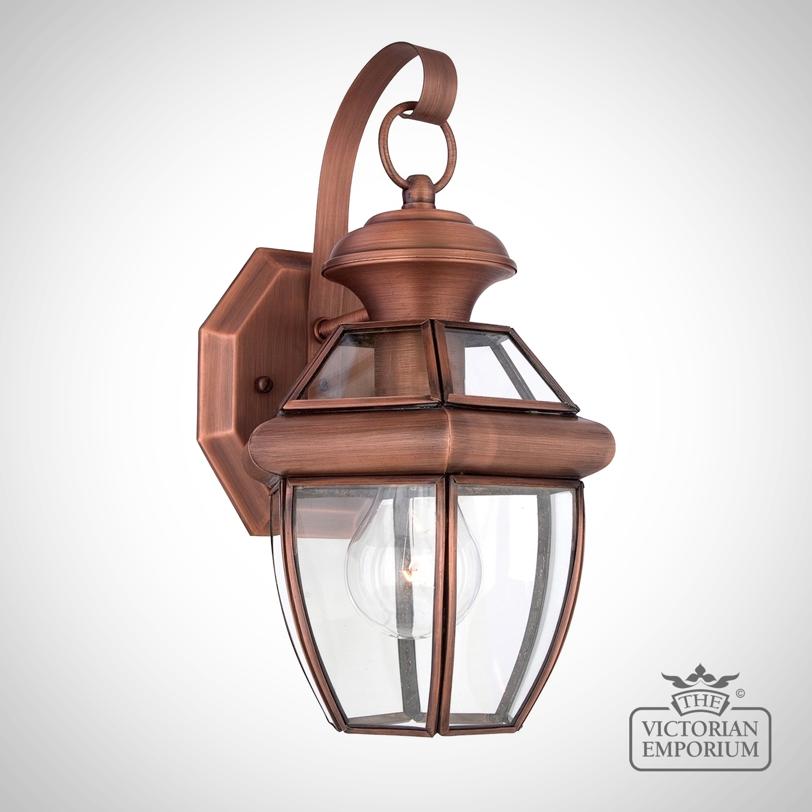 The Newbury small wall light is elegant and features a classic design with bevelled glass in aged copper.