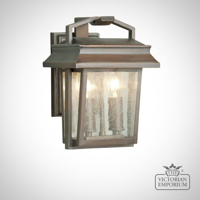 This lantern is hand made in heavy wrought iron and hand finished in an Old Bronze finish. All fittings are hot zinc dipped prior to painting to give rust protection guaranteed for 2 years.