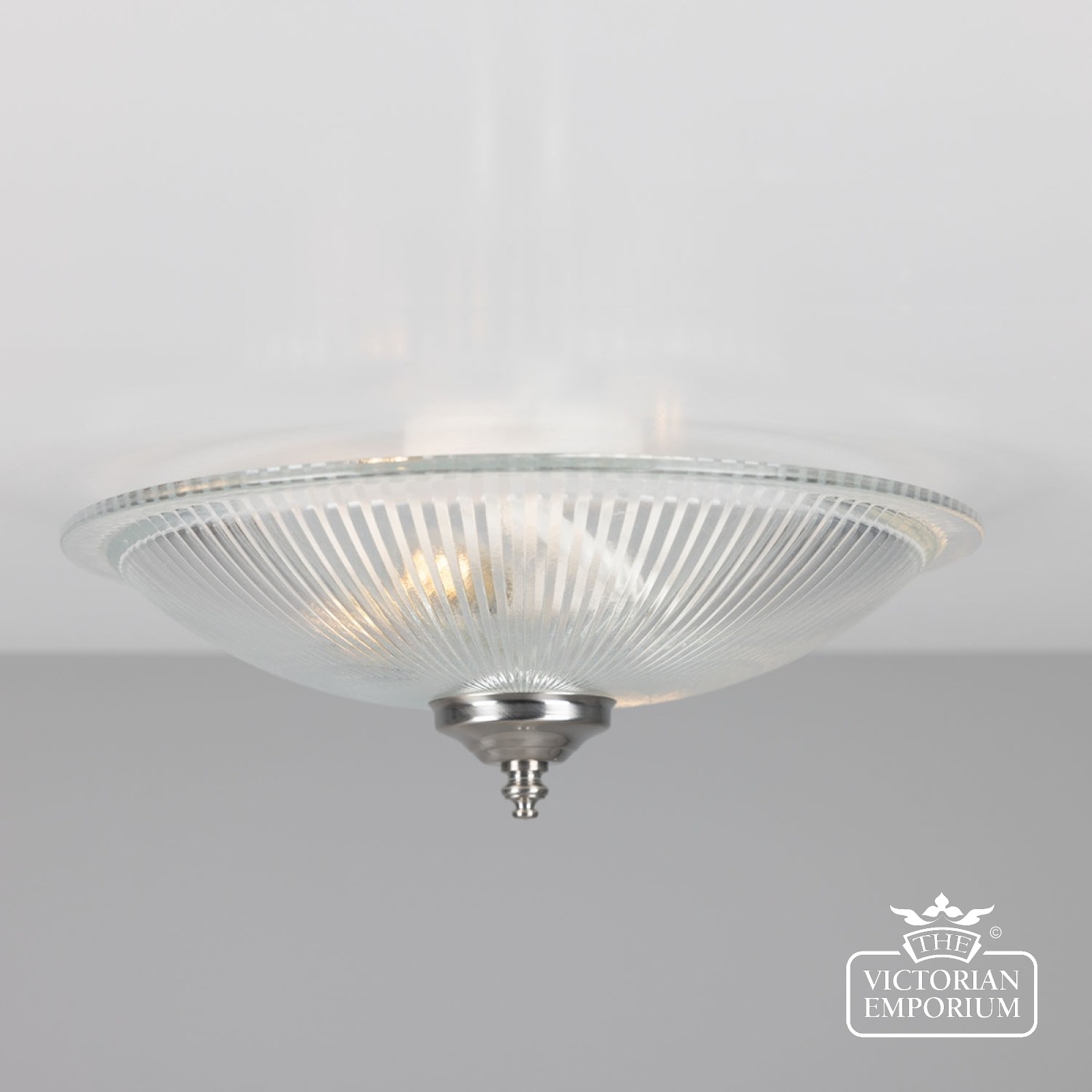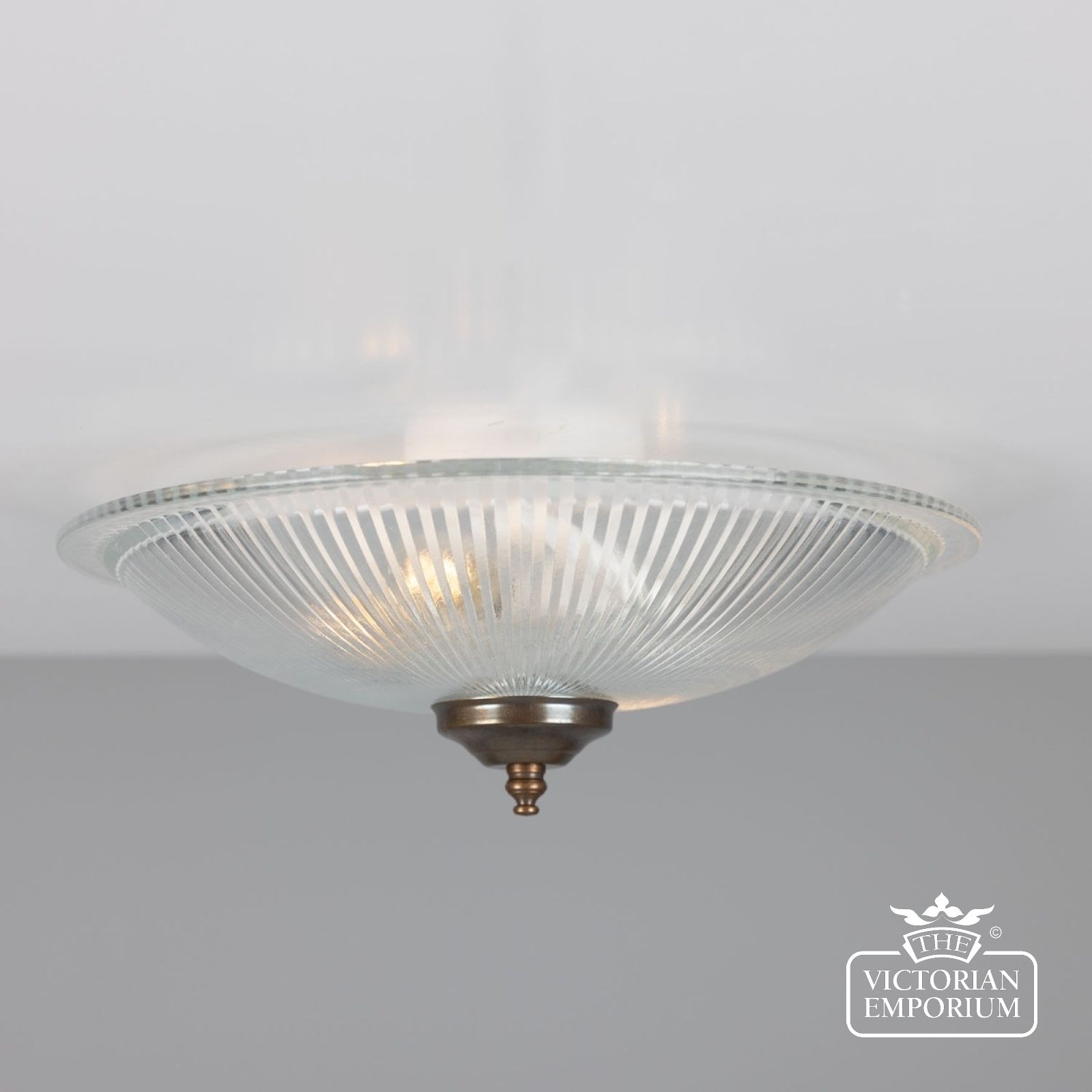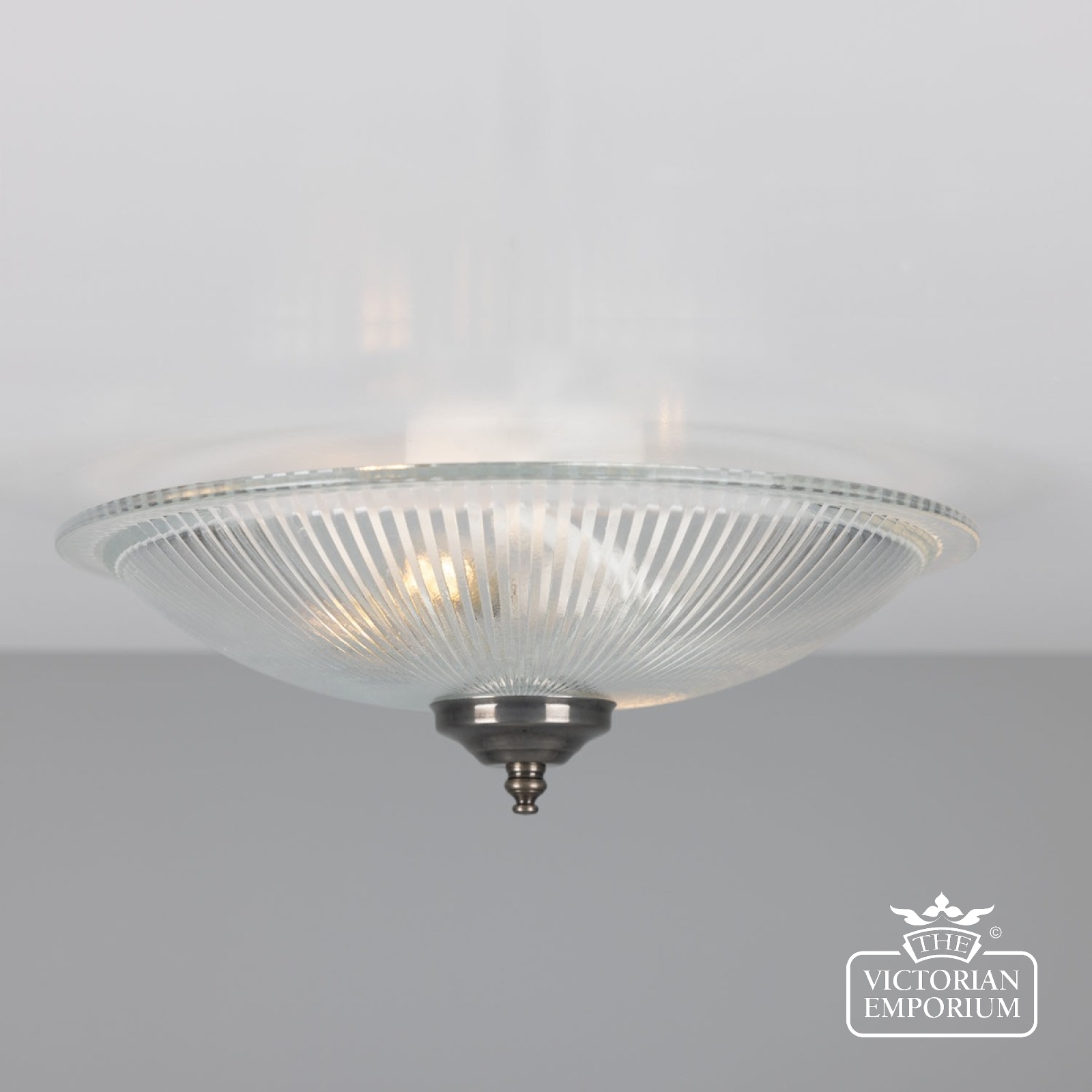 This light is ideal for small spaces, designed to refract the light, this flush ceiling light features an elegant Holophane glass shade that emanates light outward over your entire space
