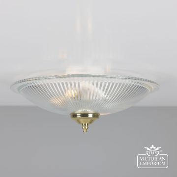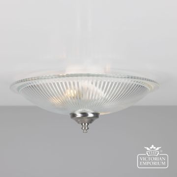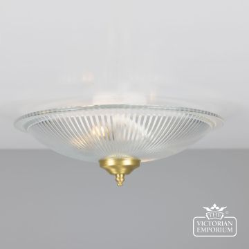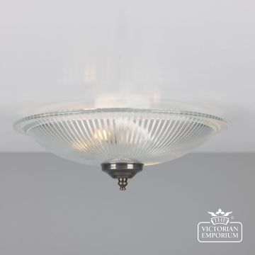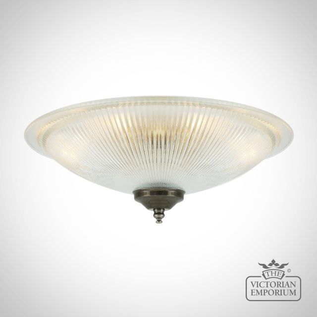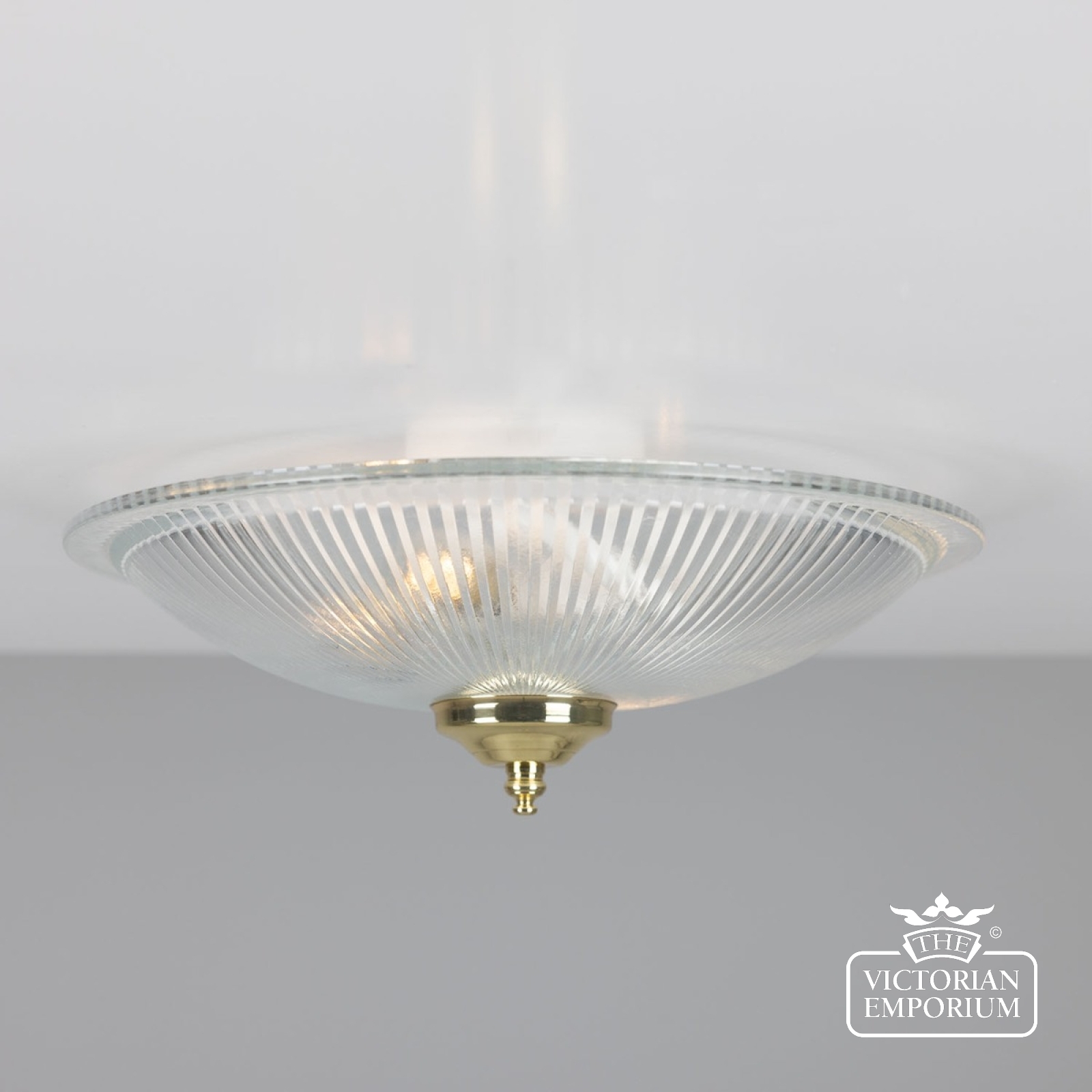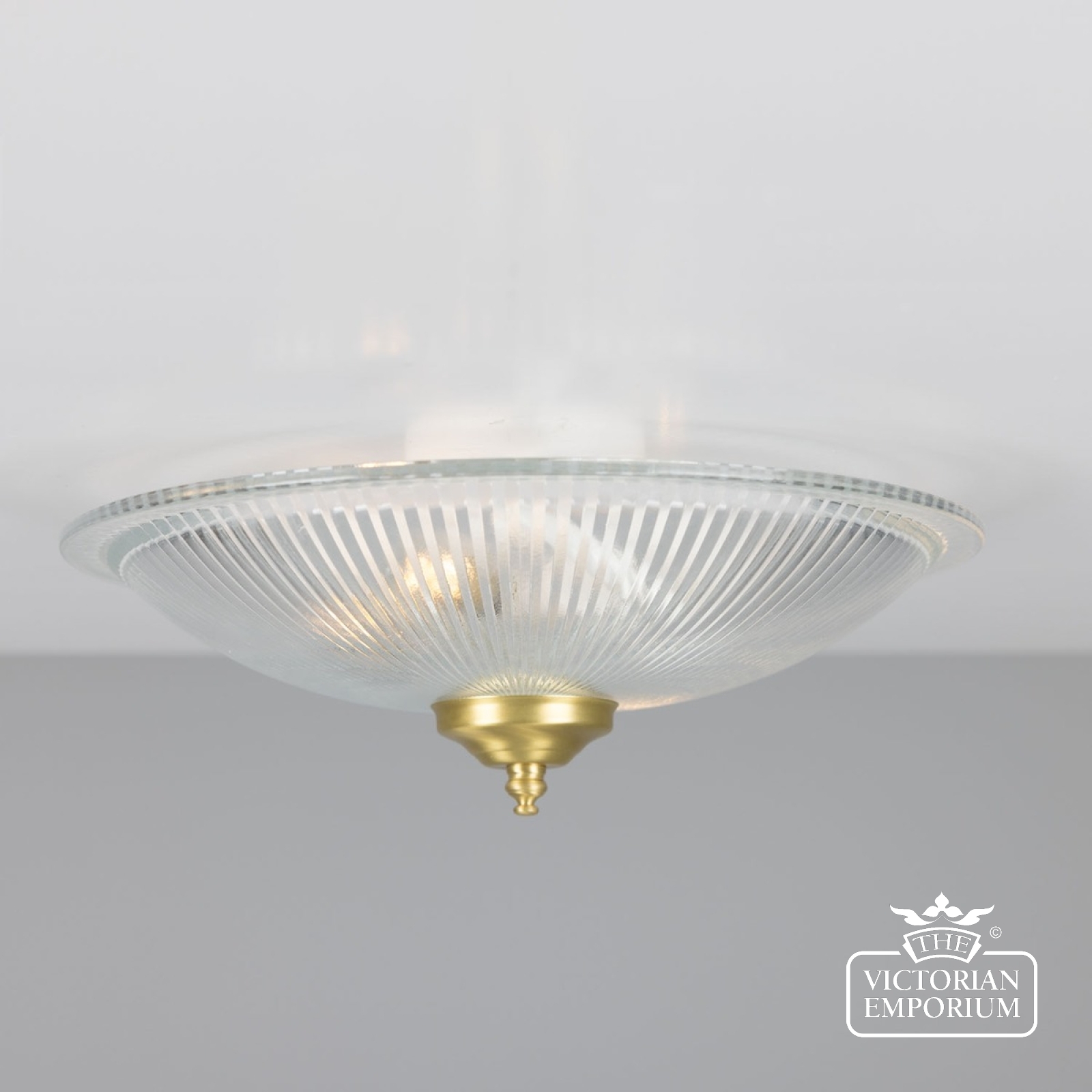 This light is ideal for small spaces, designed to refract the light, this flush ceiling light features an elegant Holophane glass shade that emanates light outward over your entire space