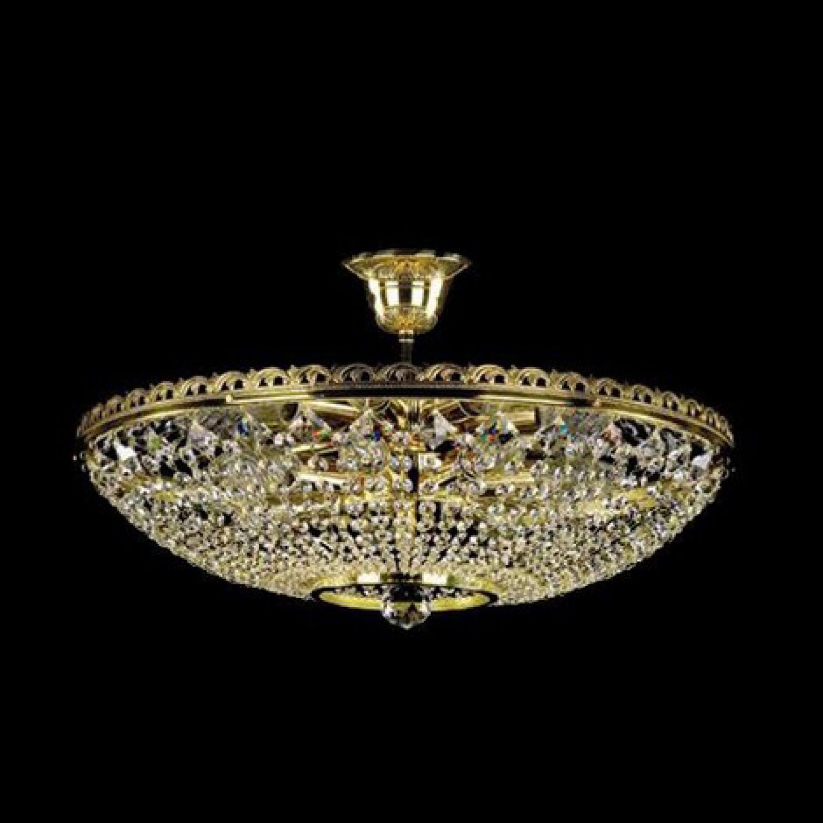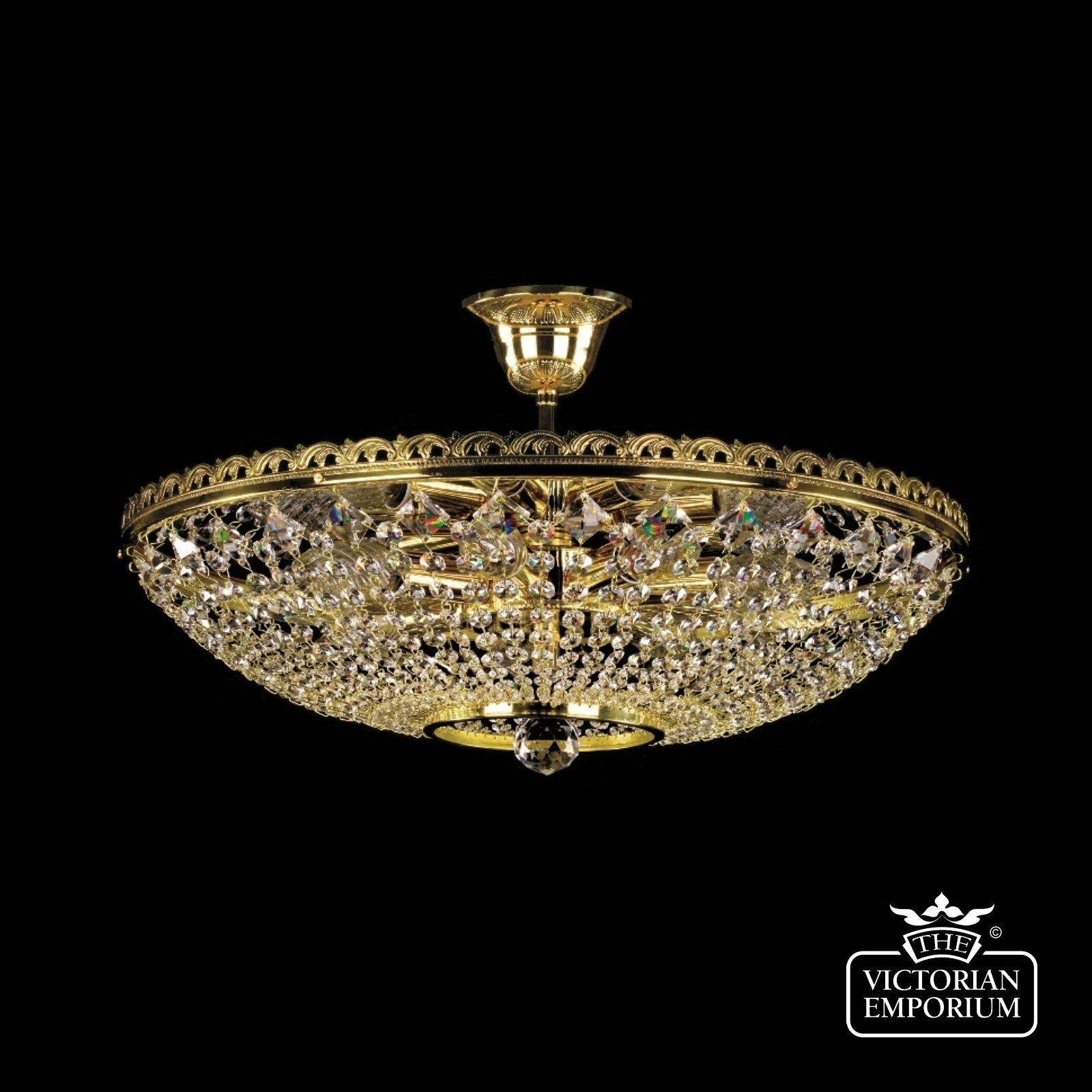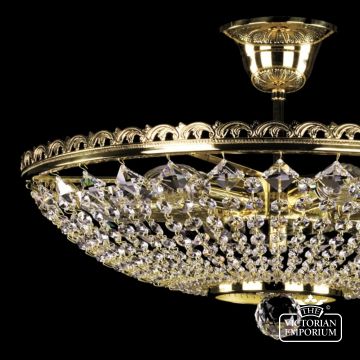 Bohemian crystal basket chandelier, designed for low ceilings. Beautiful ornate frame with mirror finish inner plate and 30% PbO crystal trimmings. Crystal sparkles beautifully when reflecting with the light to produce a lovely array of colours.