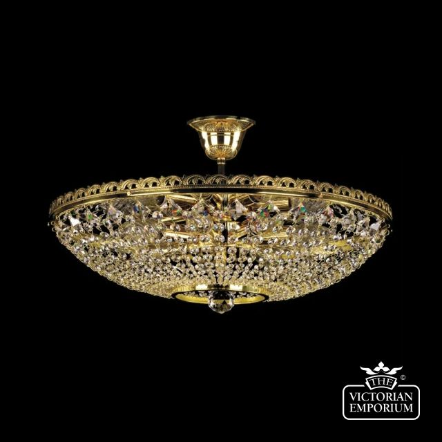Bohemian crystal basket chandelier, designed for low ceilings. Beautiful ornate frame with mirror finish inner plate and 30% PbO crystal trimmings. Crystal sparkles beautifully when reflecting with the light to produce a lovely array of colours.