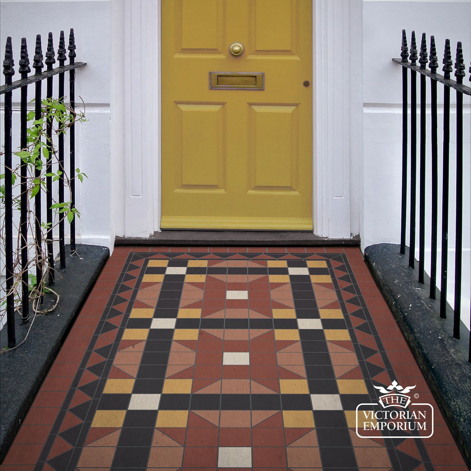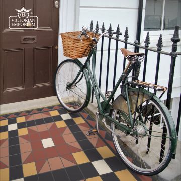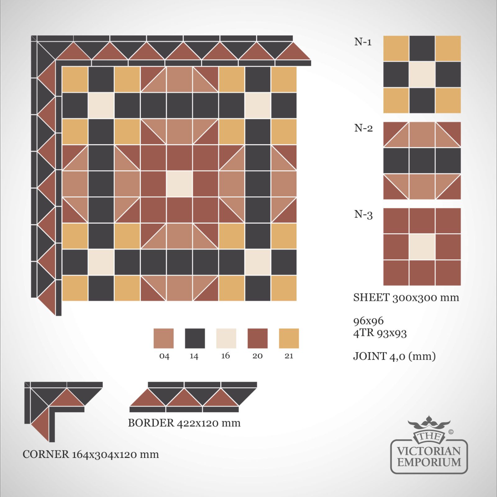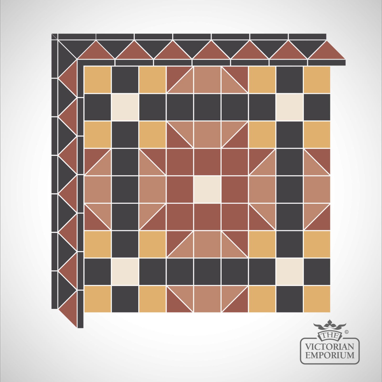 Victorian mosaic centre pattern tiles in a Victorian colour palette of black, white, yellow, red and rust - sold by the sheet.