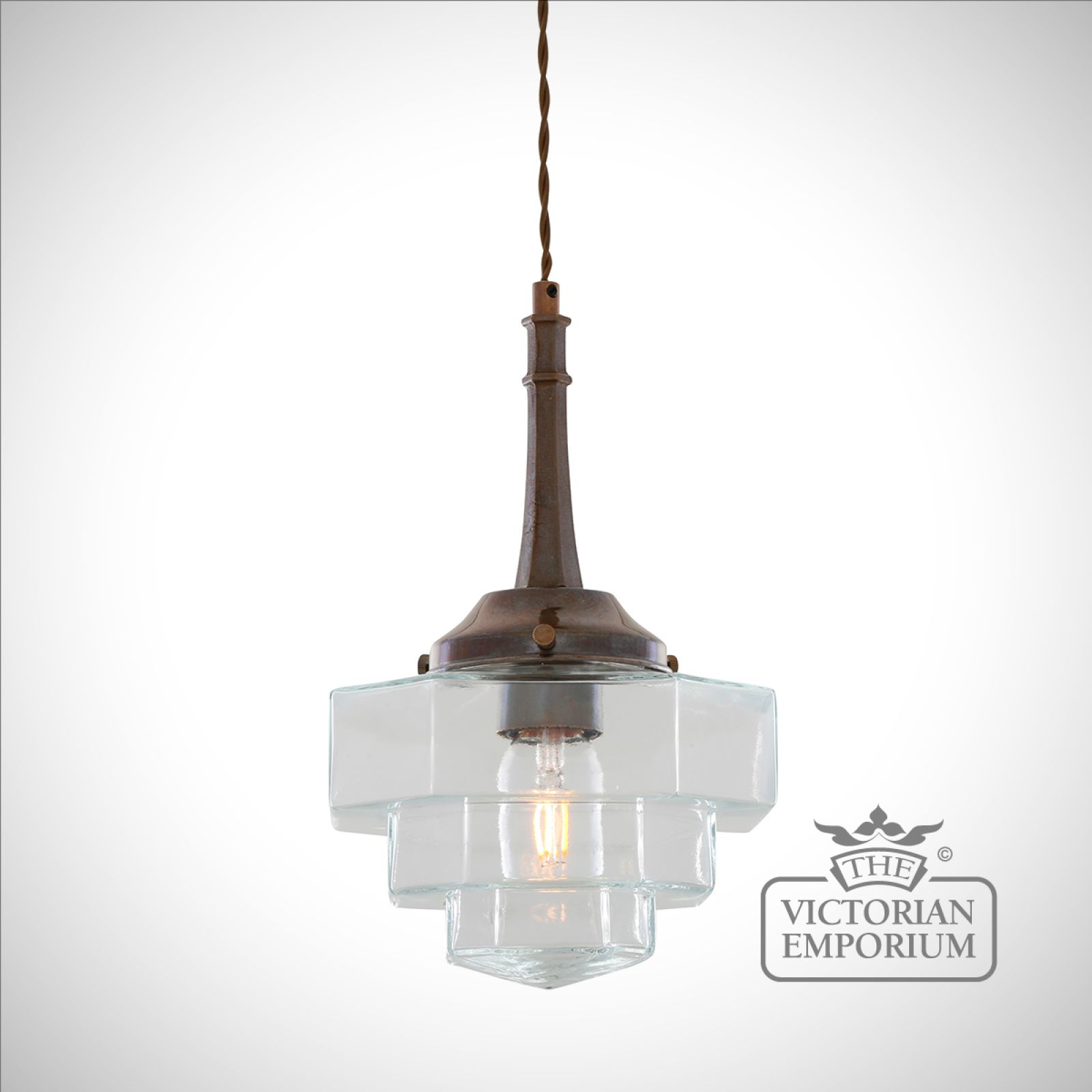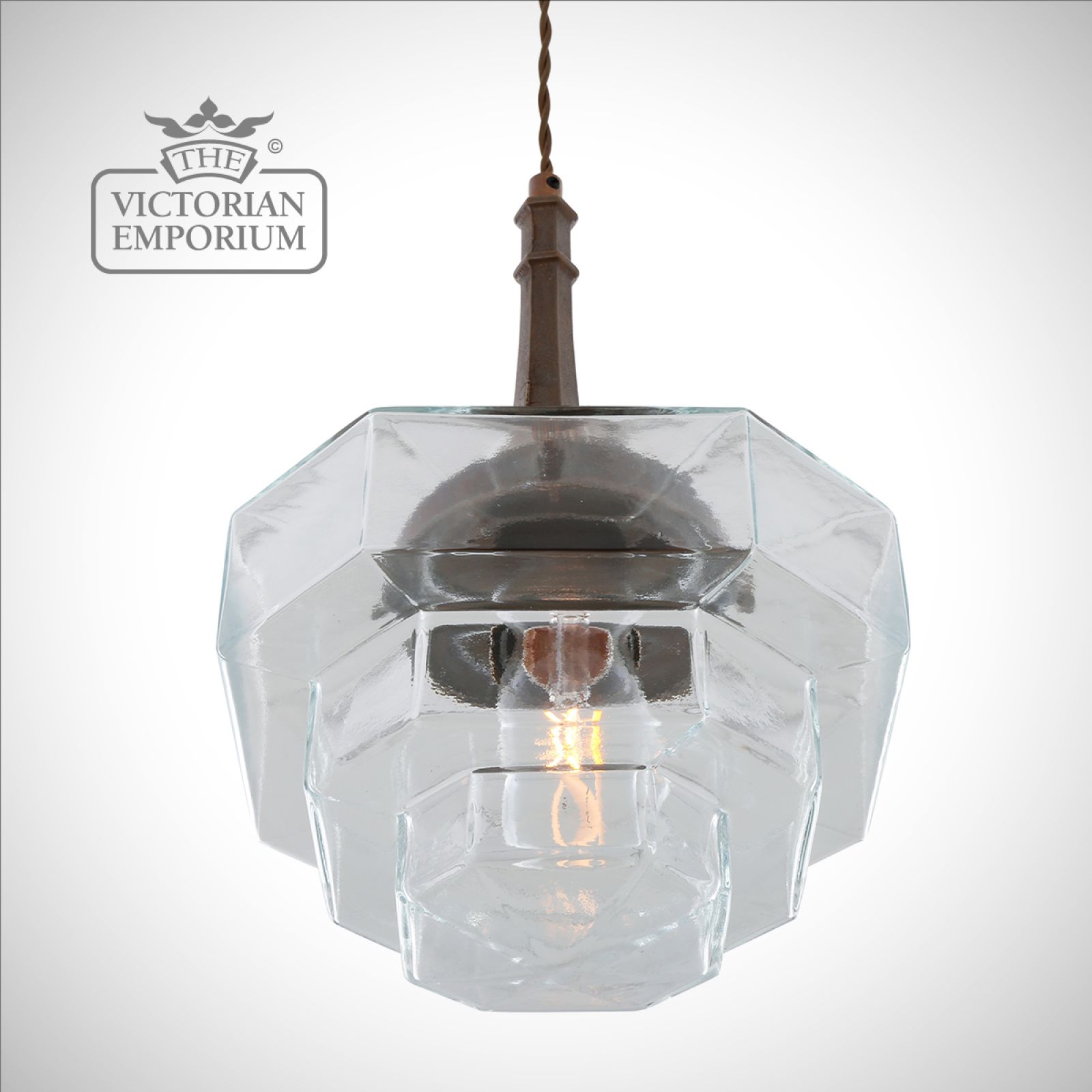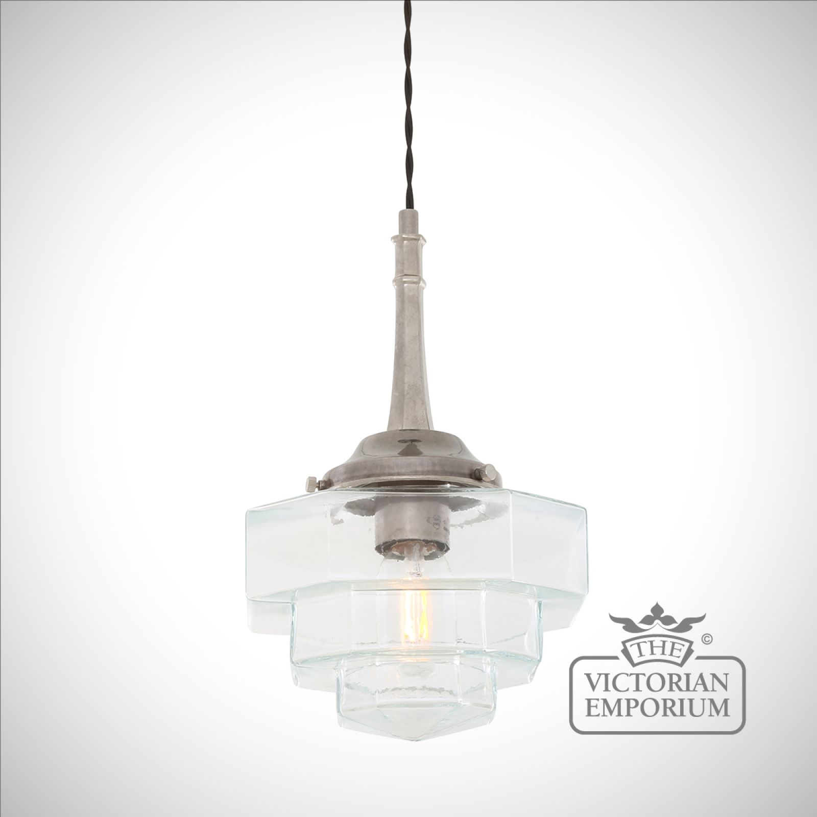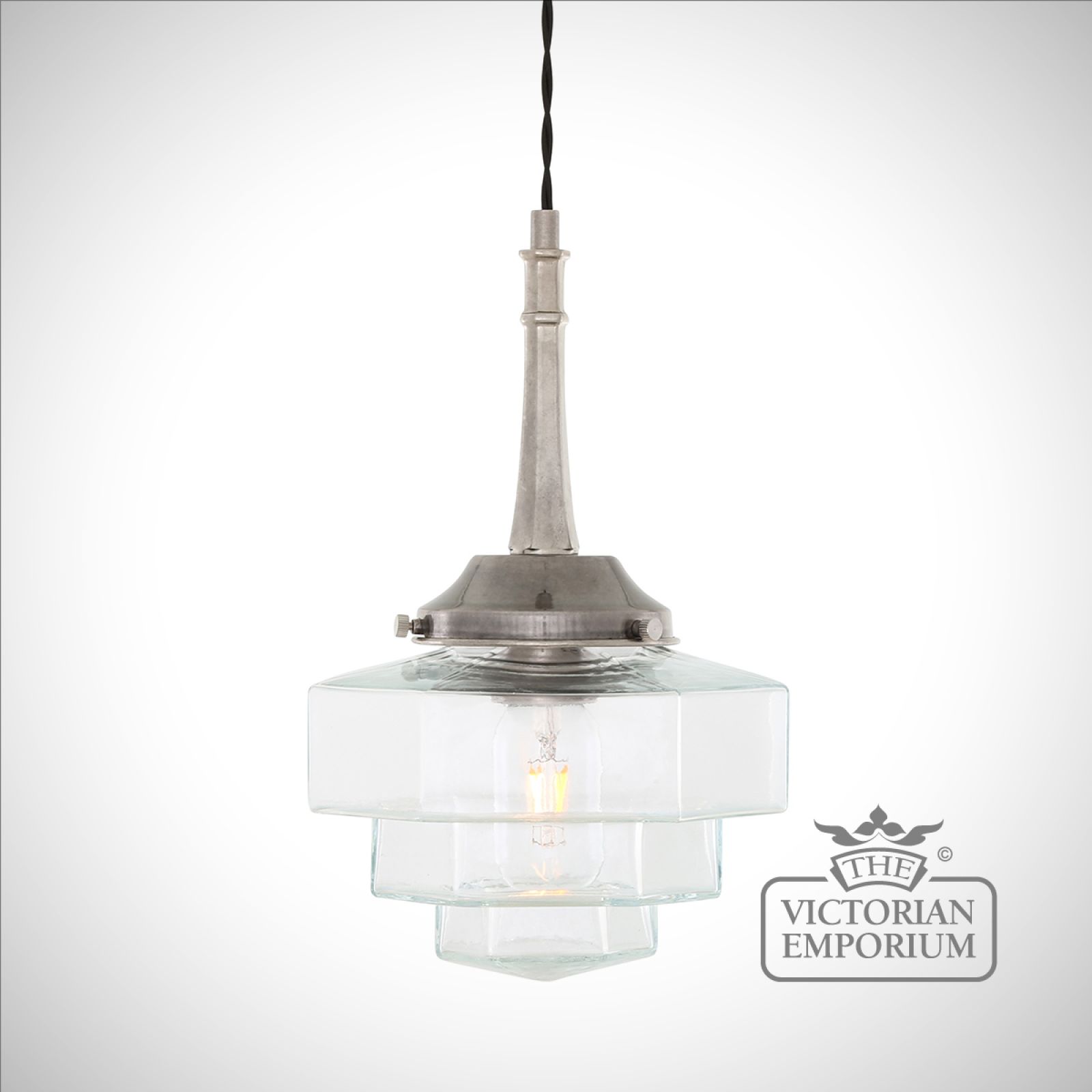 Inside the hexagonal glass shade is an E27 lamp holder. We recommend using one of our decorative LED tube bulbs in this modern, Art Deco pendant (bulb sold separately).