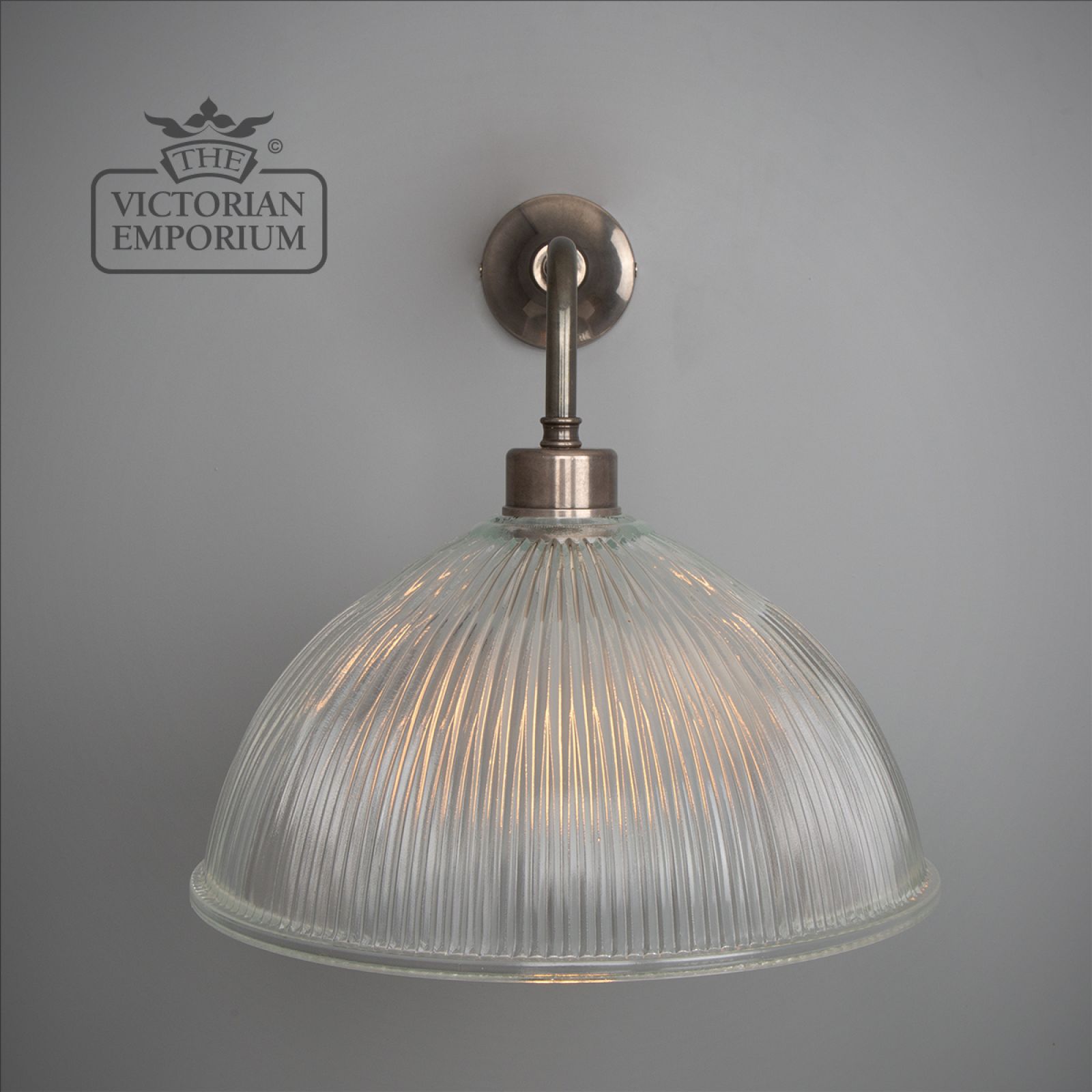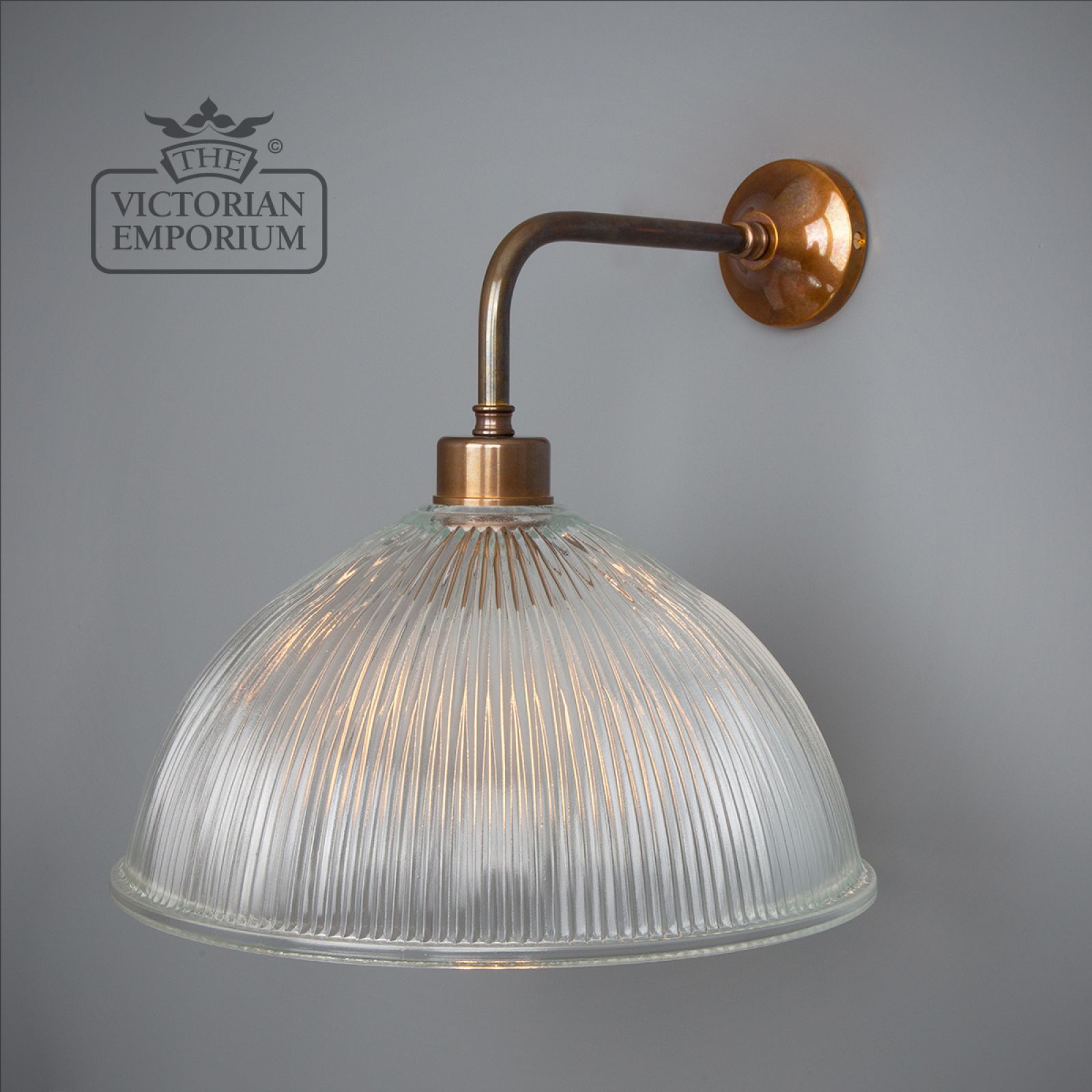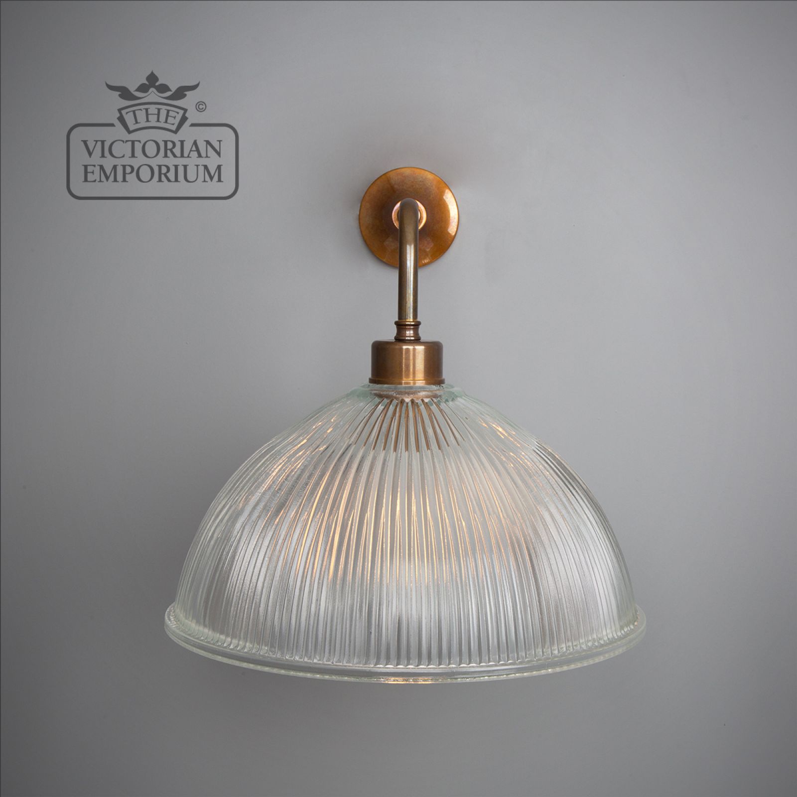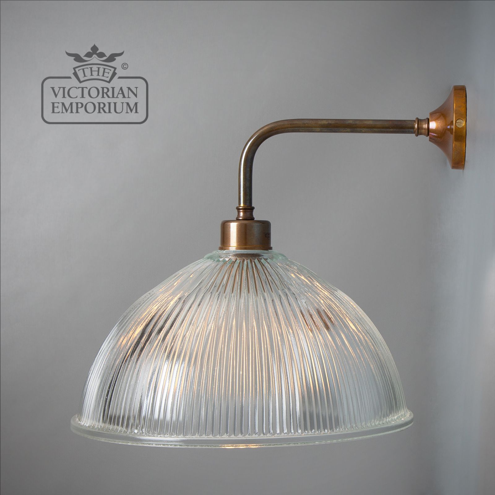 The Nova Prismatic Wall Light features a prismatic glass lamp shade attached to a brass lamp holder with a right angled brass arm.