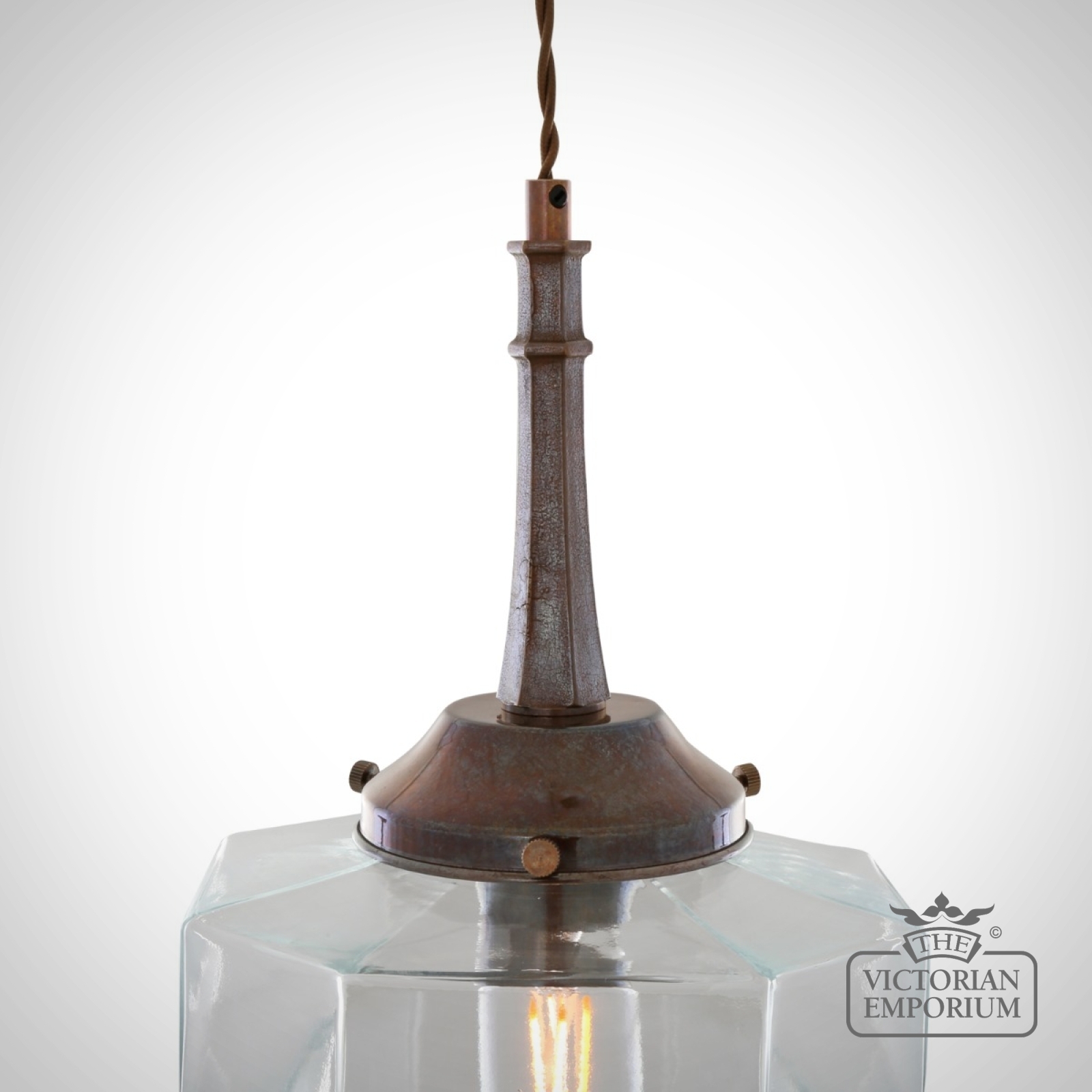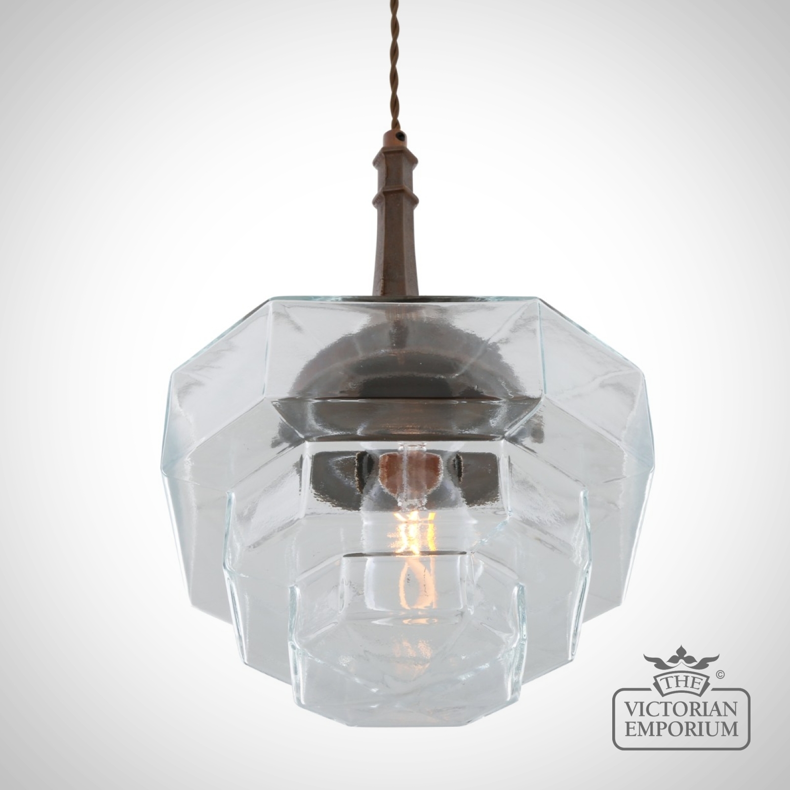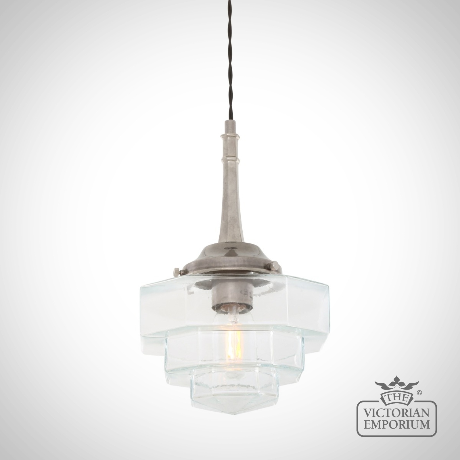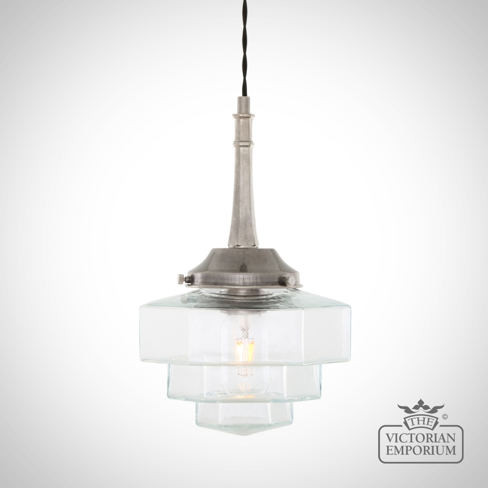 Inside the hexagonal glass shade is an E27 lamp holder. We recommend using one of our decorative LED tube bulbs in this modern, Art Deco pendant (bulb sold separately).