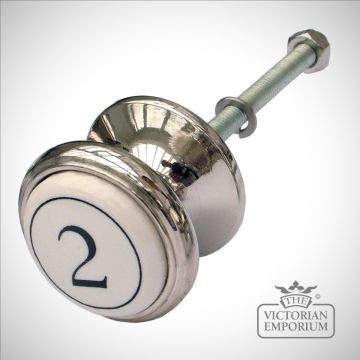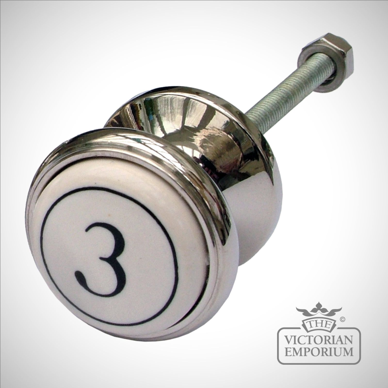 A small porcelain knob in a round shape featuring the numbers 1-9, a great choice and quirky touch for a period style kitchen