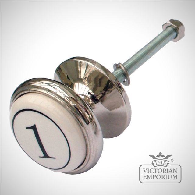 A small porcelain knob in a round shape featuring the numbers 1-9, a great choice and quirky touch for a period style kitchen