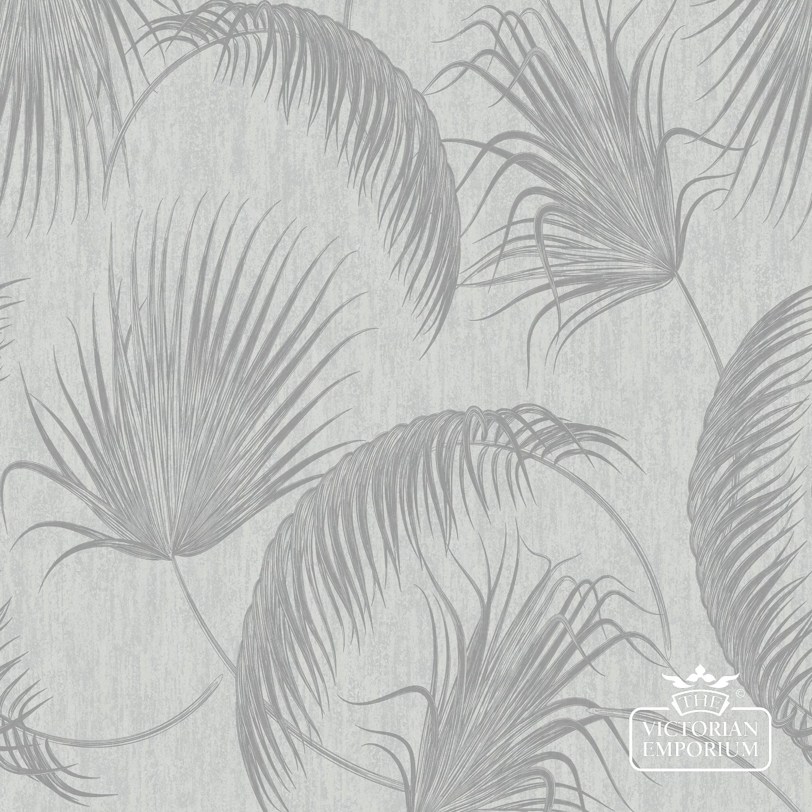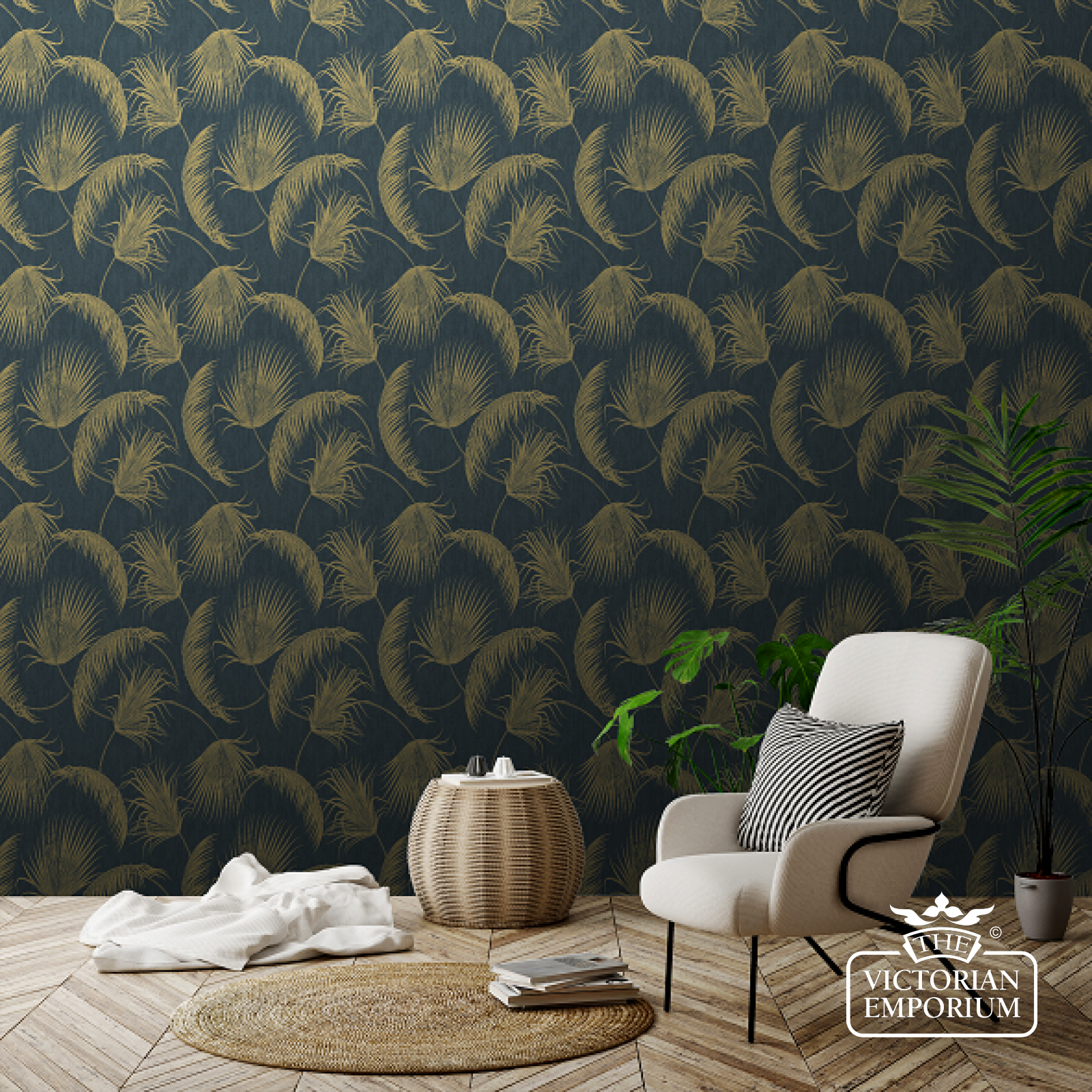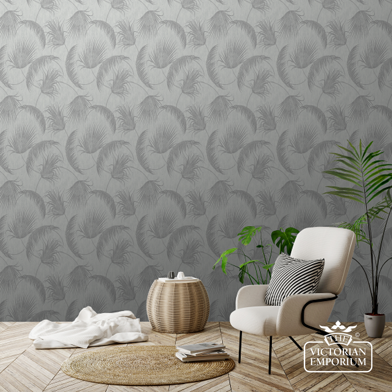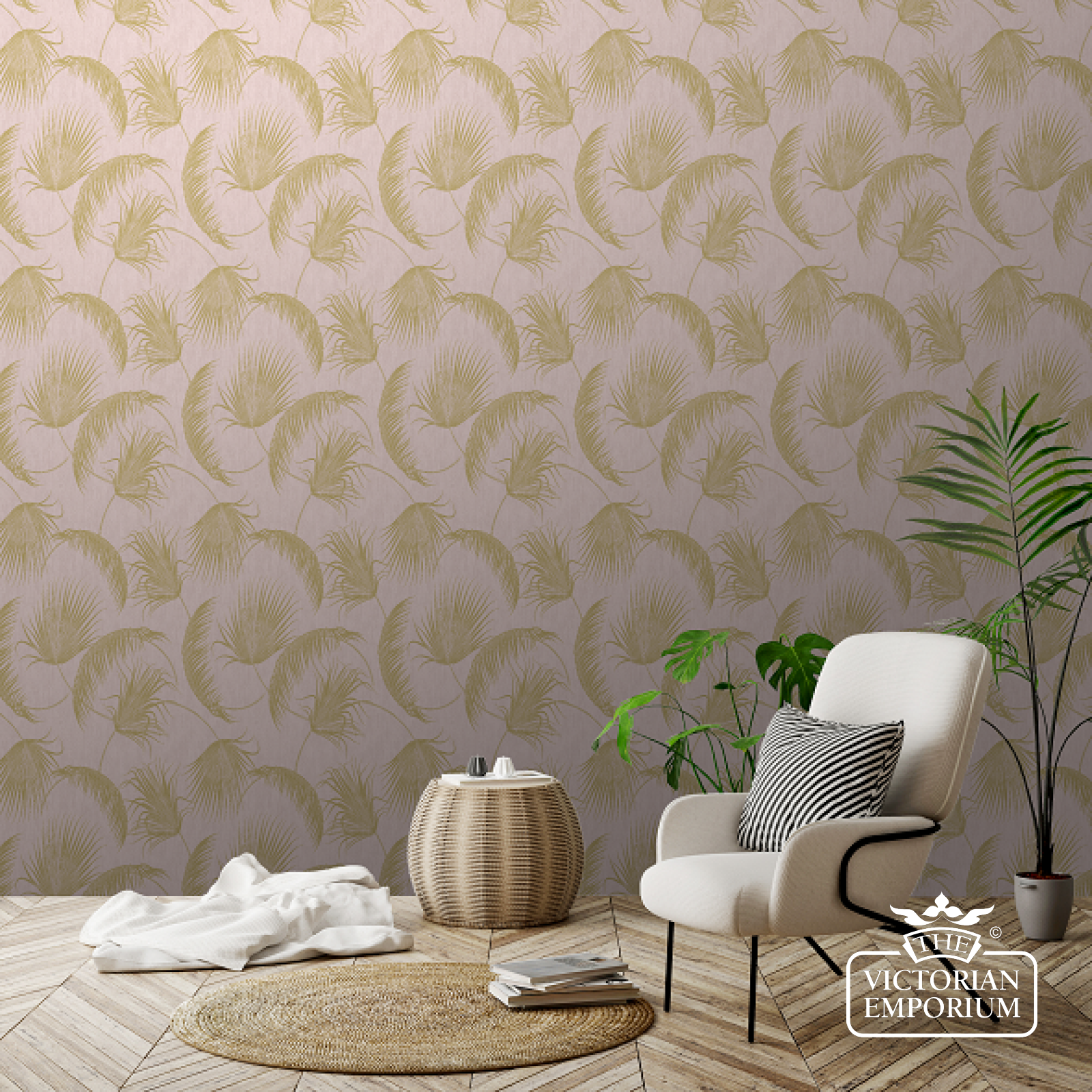 Bring a touch of the tropics to period or contemporary rooms with Oasis Leaves (Oasis Fronds) by SK Filson. This elegant design layers softly drawn palm fronds with subtle metallic highlights that catch the light without overpowering a scheme.
