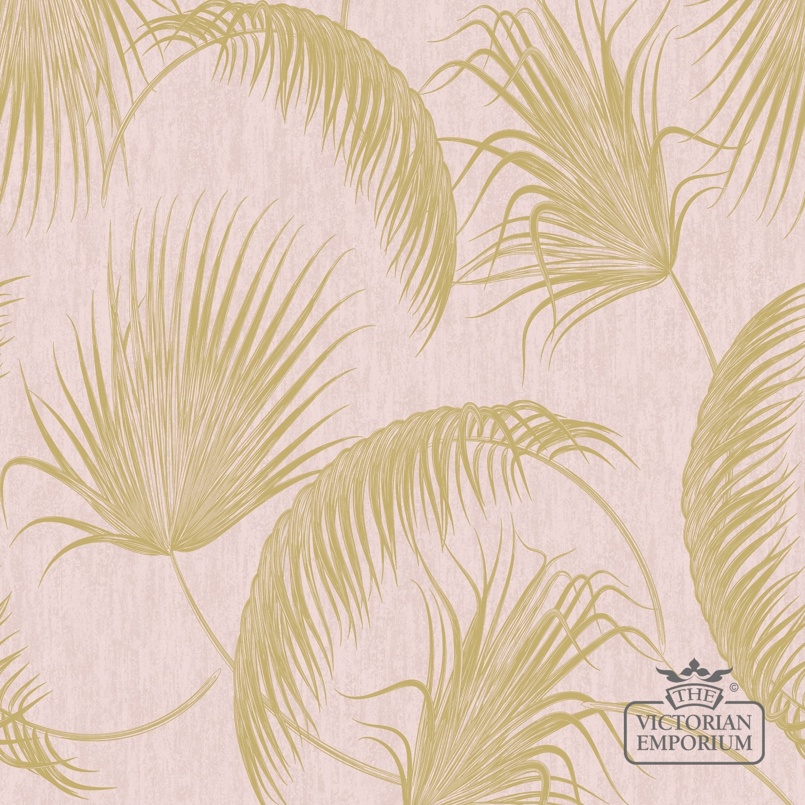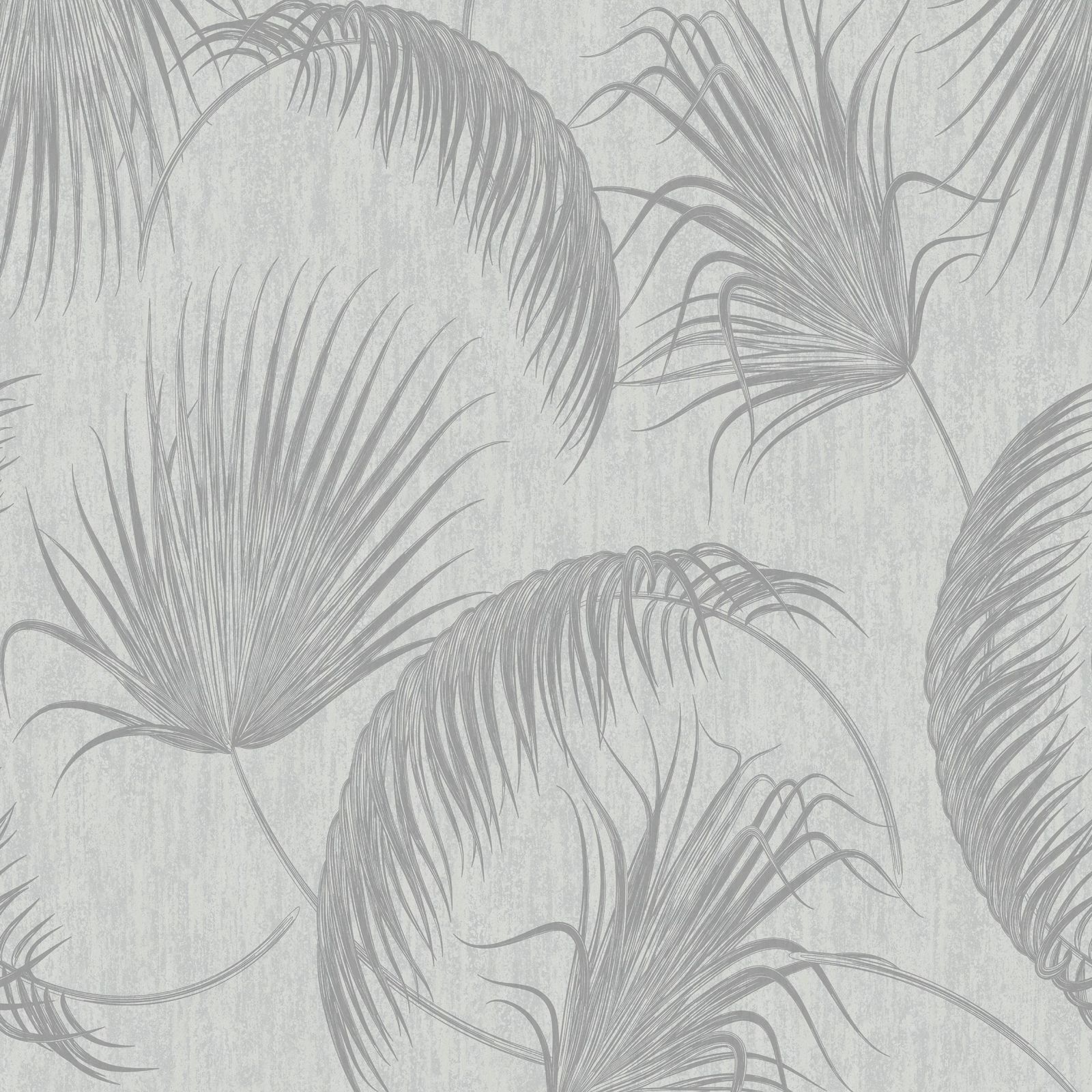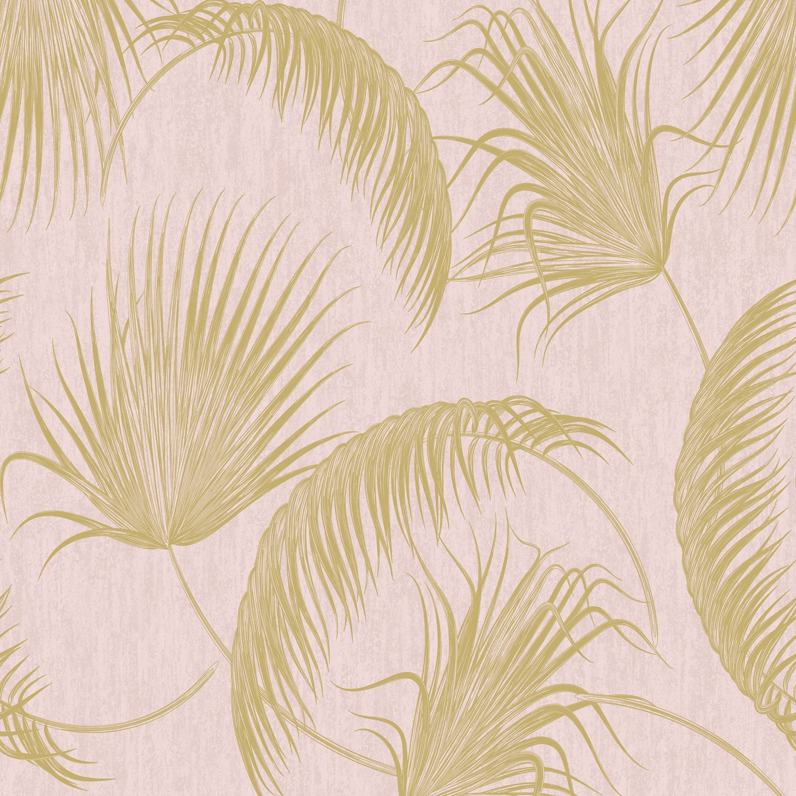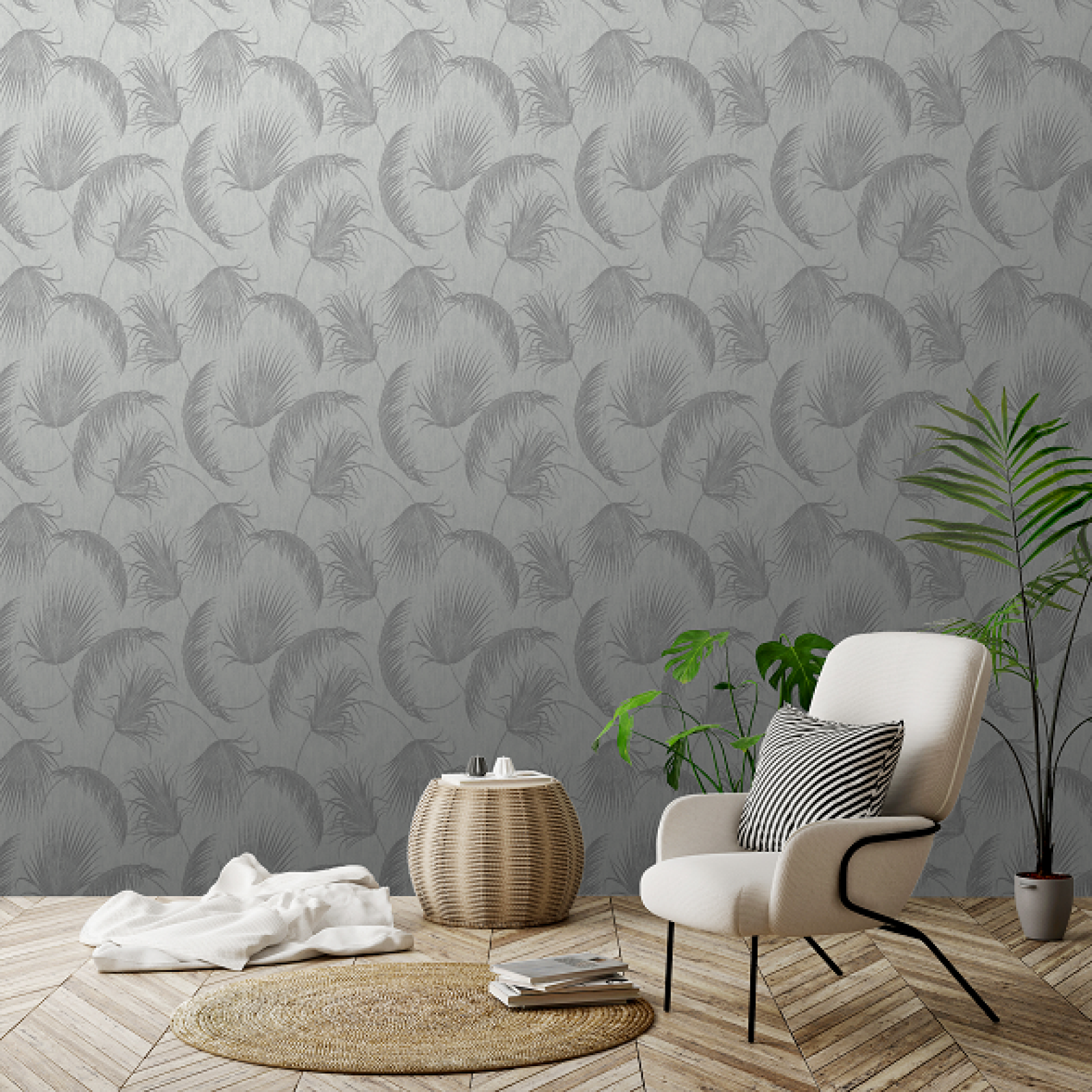 Oasis Leaves (Oasis Fronds) tropical wallpaper. Non-woven, paste-the-wall, washable with metallic detail. Pink, Blue or Grey