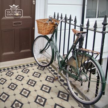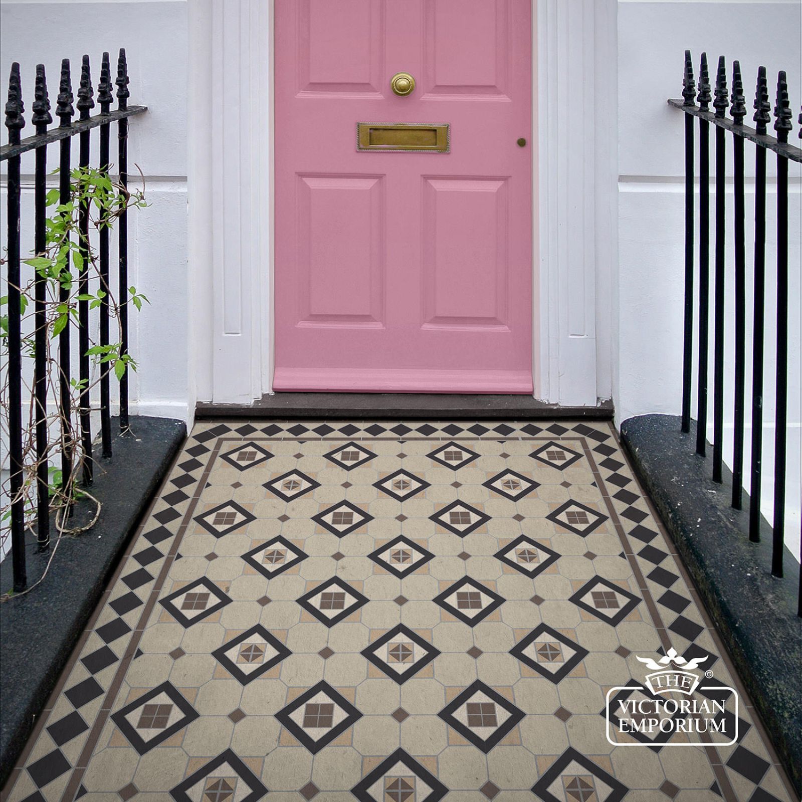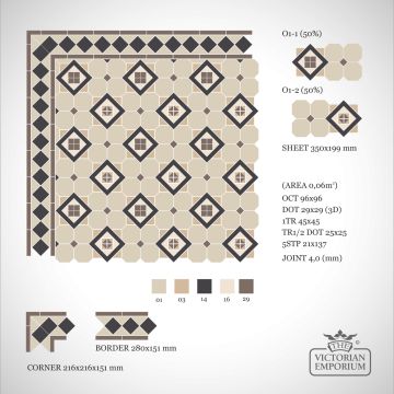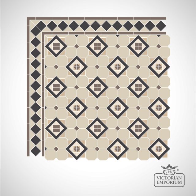 Victorian mosaic centre pattern tiles in a Victorian colour palette of brown black, buff and white - sold by the sheet.