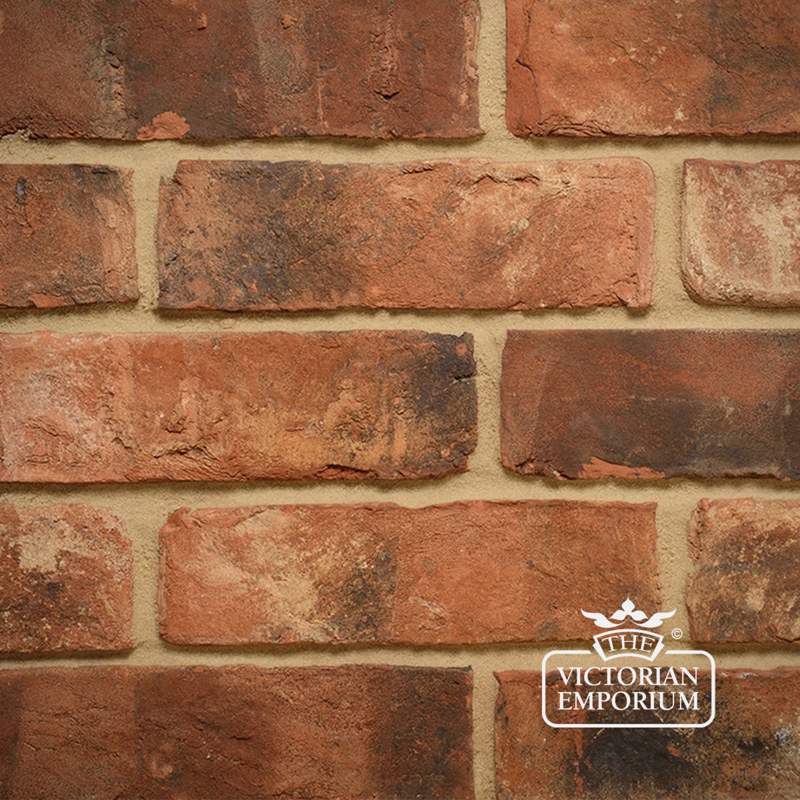 These are brick slips made from full size imperial sized bricks in all the traditional finishes, along with a range of Victorian brick tiles. These products are typically used for cladding interior walls to give them a bare brick look but can be used outdoors too and on the inside of fireplaces. Often brick slips for fireplaces are laid in a traditional herringbone pattern.