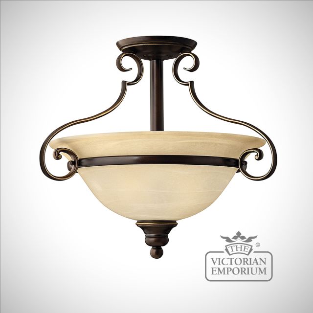 This is a lovely semi flush mount light with beautiful antique highlights and faux alabaster glass.