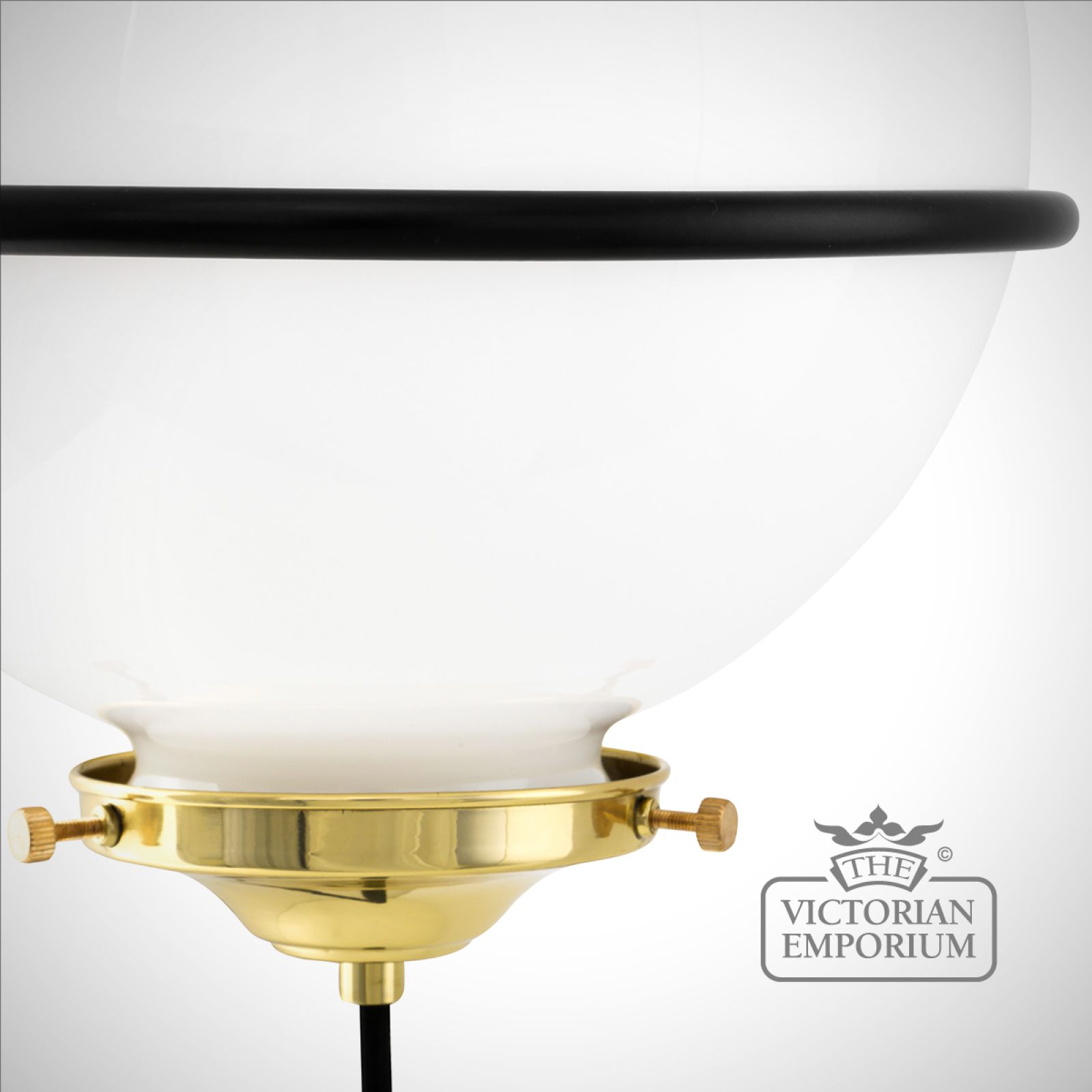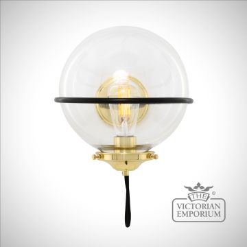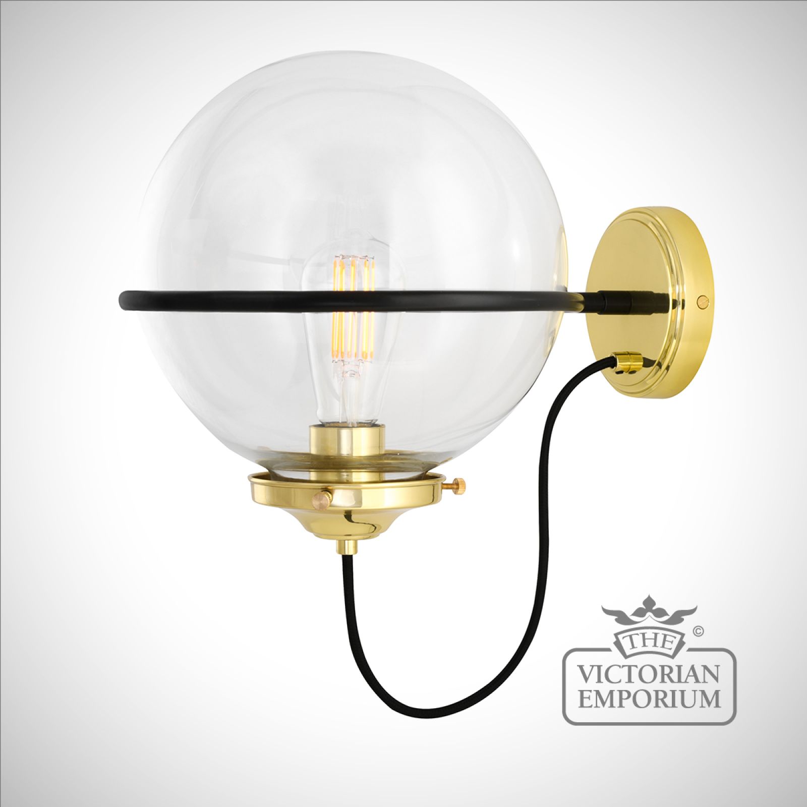 The Oranmor wall light features a 25cm glass globe lamp shade that sits inside a black steel ring. This circular ring is attached to a brass wall bracket.