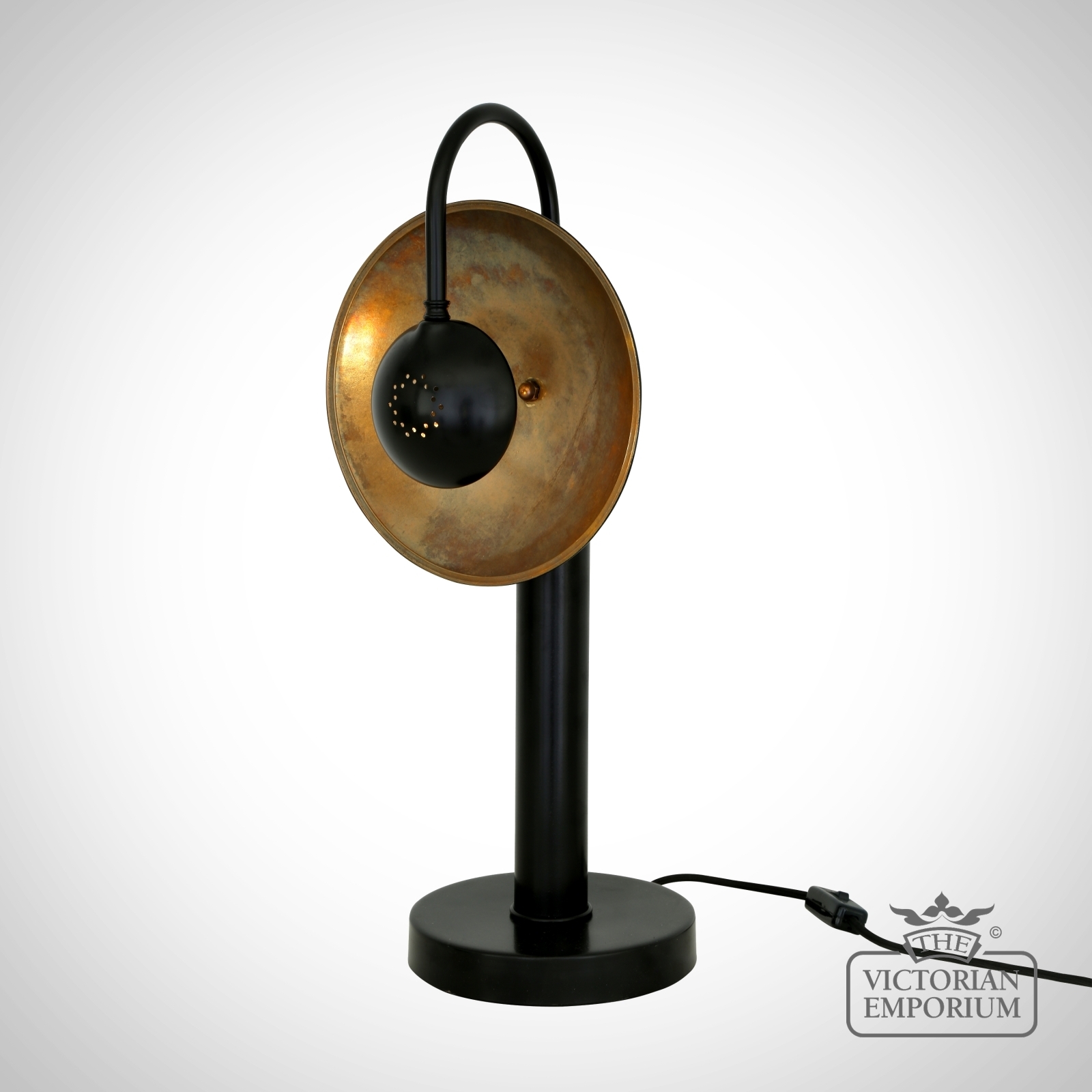 The round neck arm is attached to a powder-coated black brass pillar and matching base. Colour finishes available for the dish surface include antique brass, satin brass and antique silver. G9 bulb is sold separately.