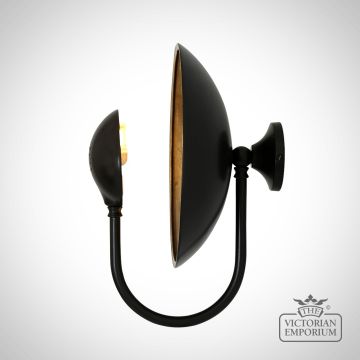 The Orebro wall light has an industrial style and features a large brass reflective dish surface. A dome shade elegantly attached to a swan neck arm emerges from behind the brass dish to reflect light against its large surface.