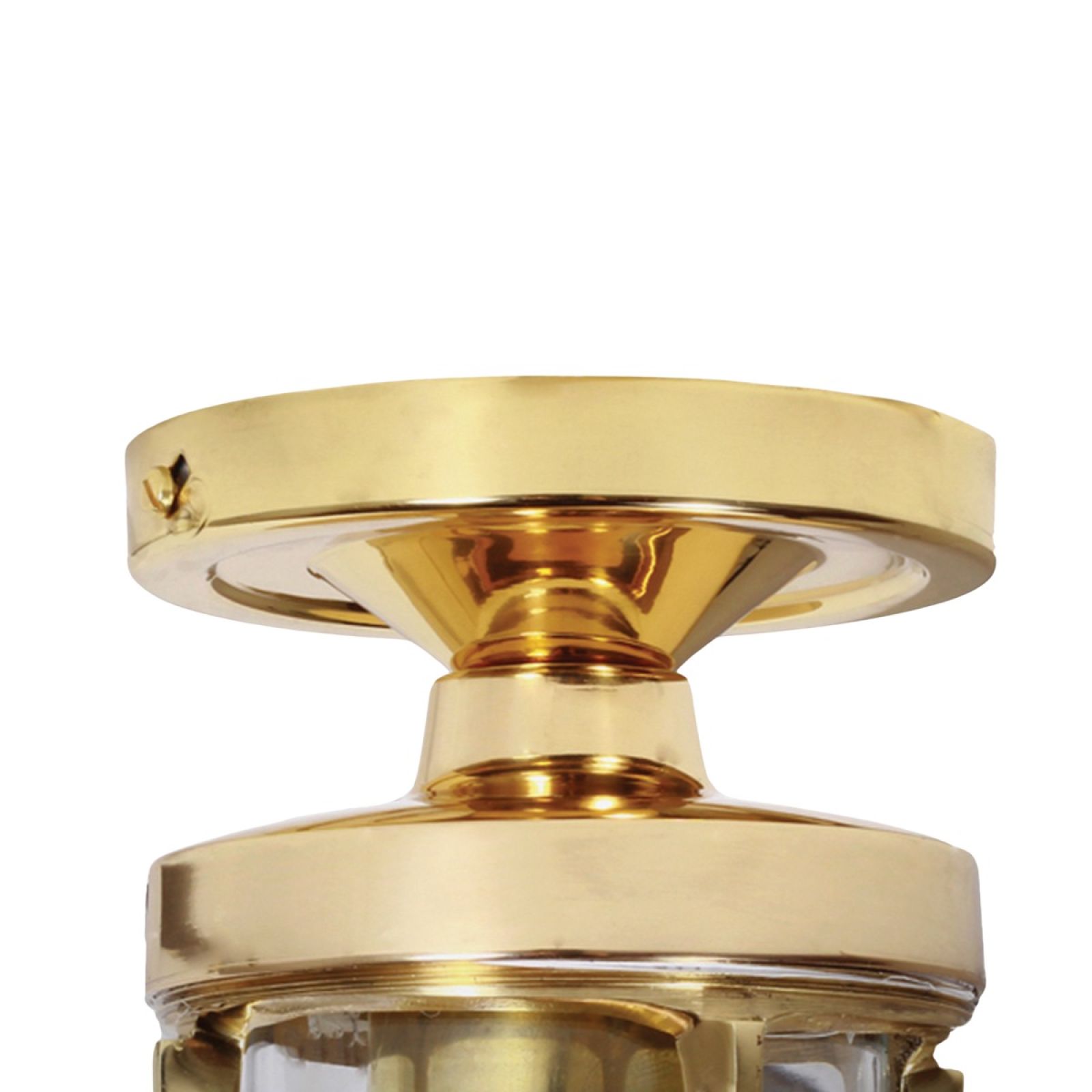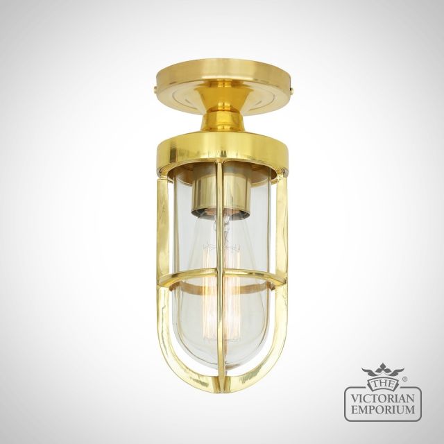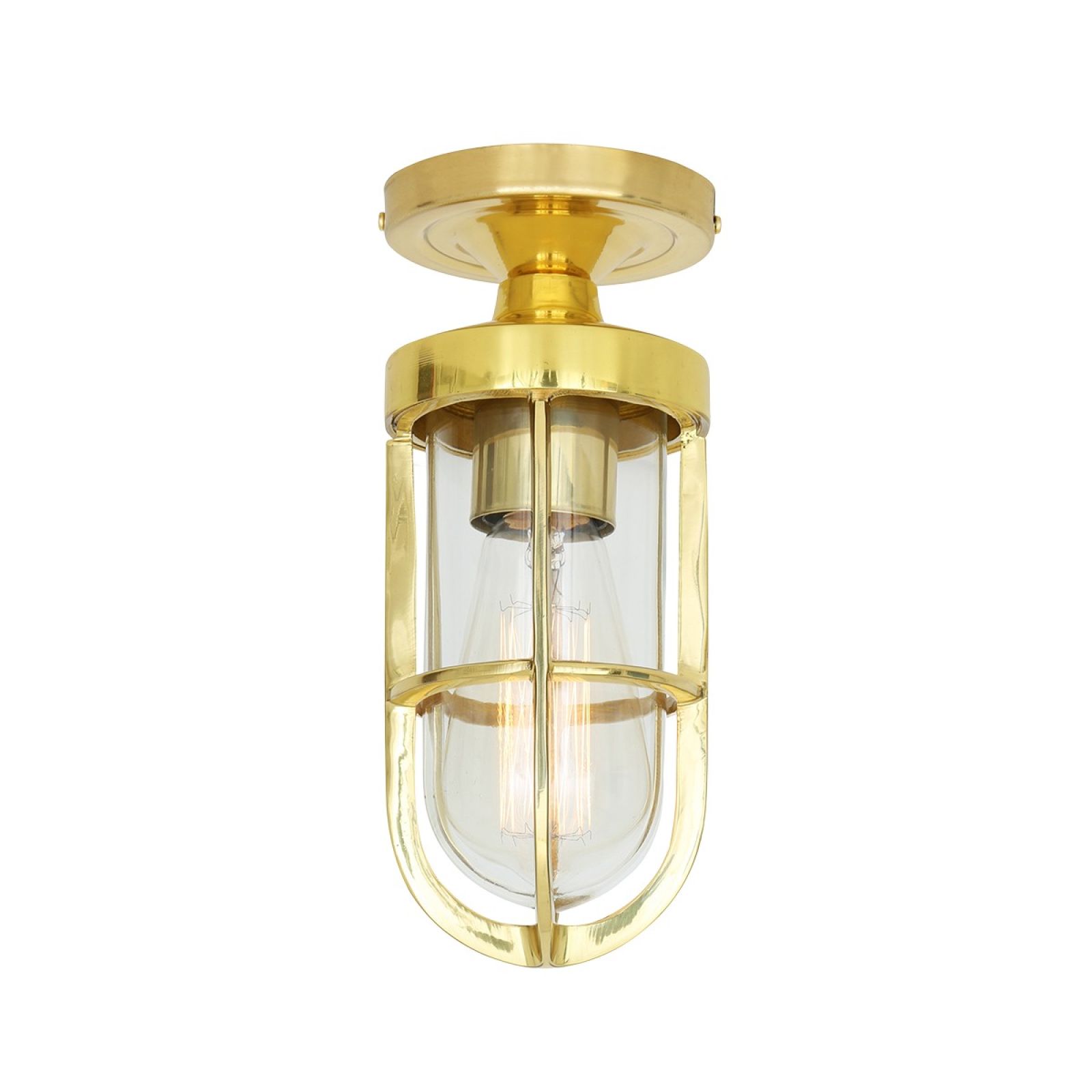 This decorative flush ceiling light is designed to refract the light, and comes complete with a glass shade and brass protective cage which looks great when lit with a warm bulb.