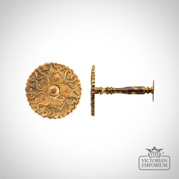 Ornate circular brass curtain holdback complete with filigree design including stem, wall plate and fixings