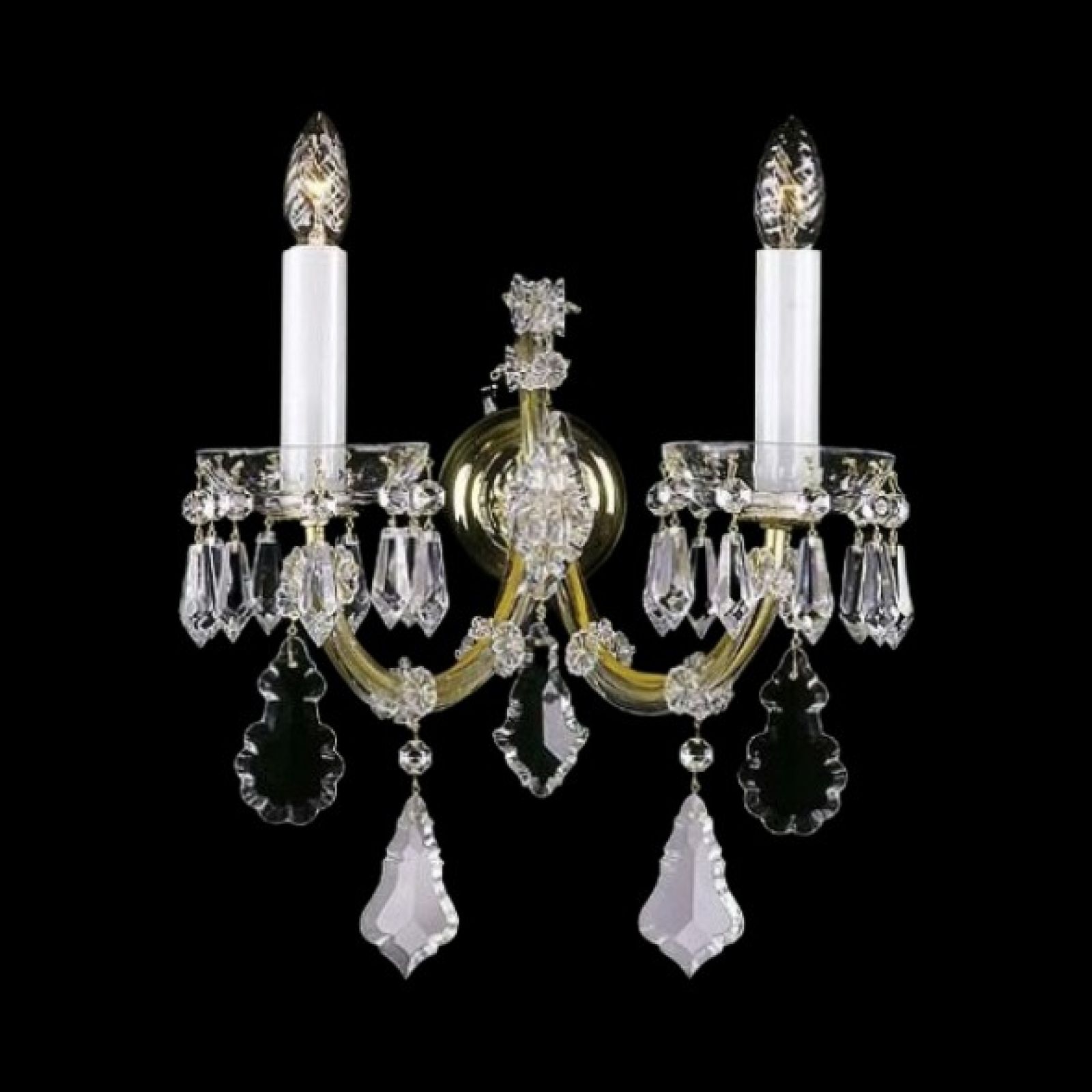 Delicate long white glass candles and crystal trimmings. Handcut crystal bobeches, french pendeloques and large tear drops
