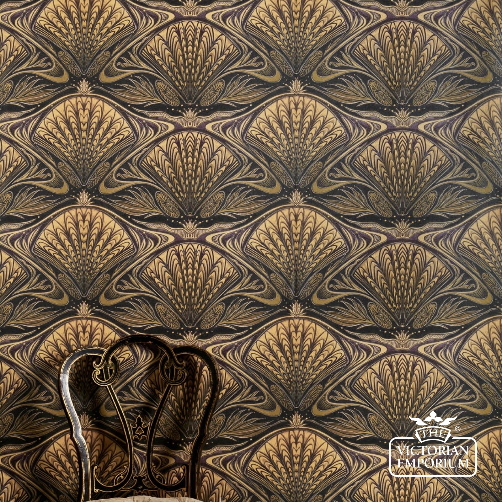 An Art Nouveau inspired shell design wallpaper. On a metallic coated smooth high-quality base, this pattern oozes sensuality and soft glamour with its semi-sheen. In tones of off black, toffee and stone it is a versatile palette, while the pattern is calming with its vintage curve appeal.