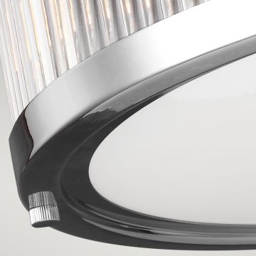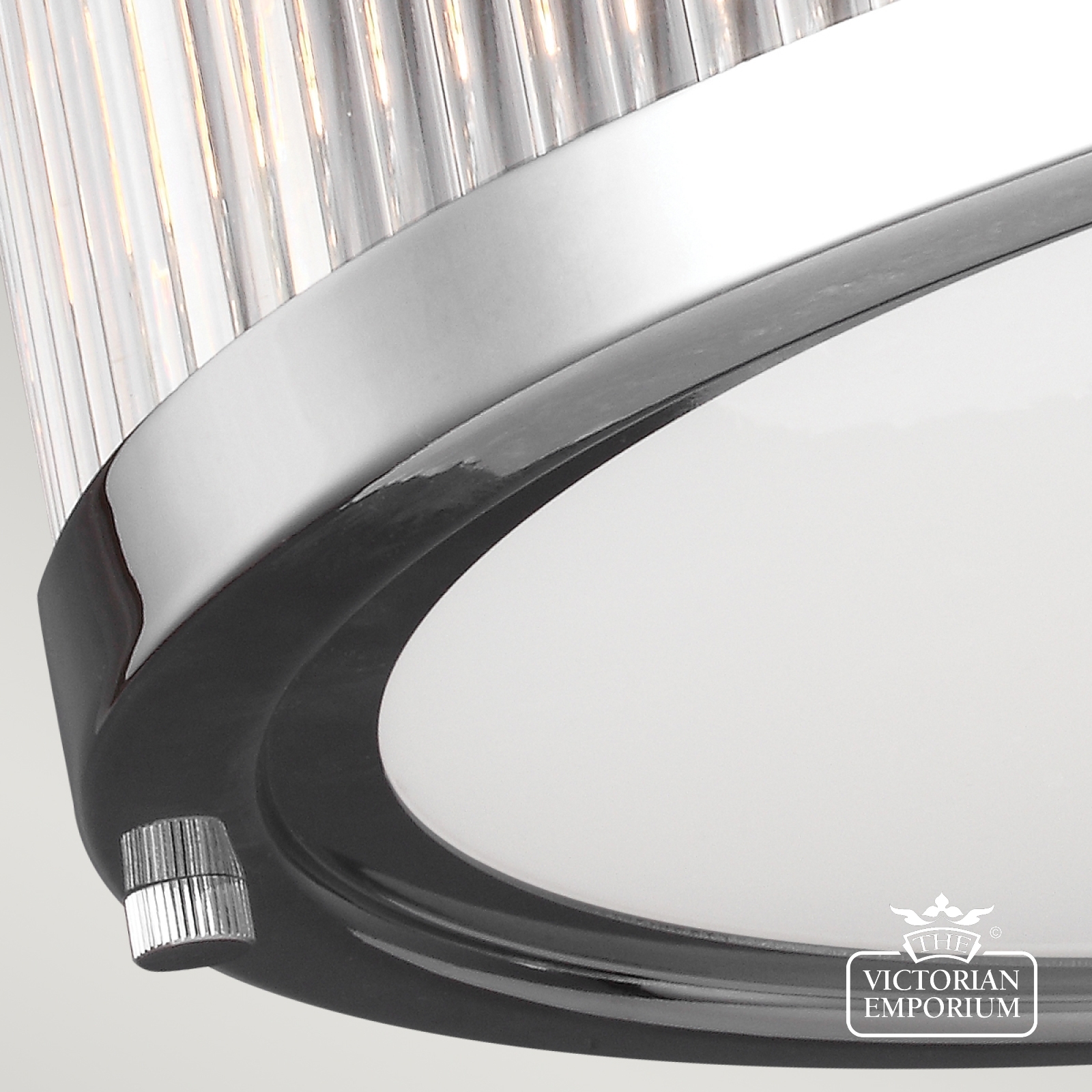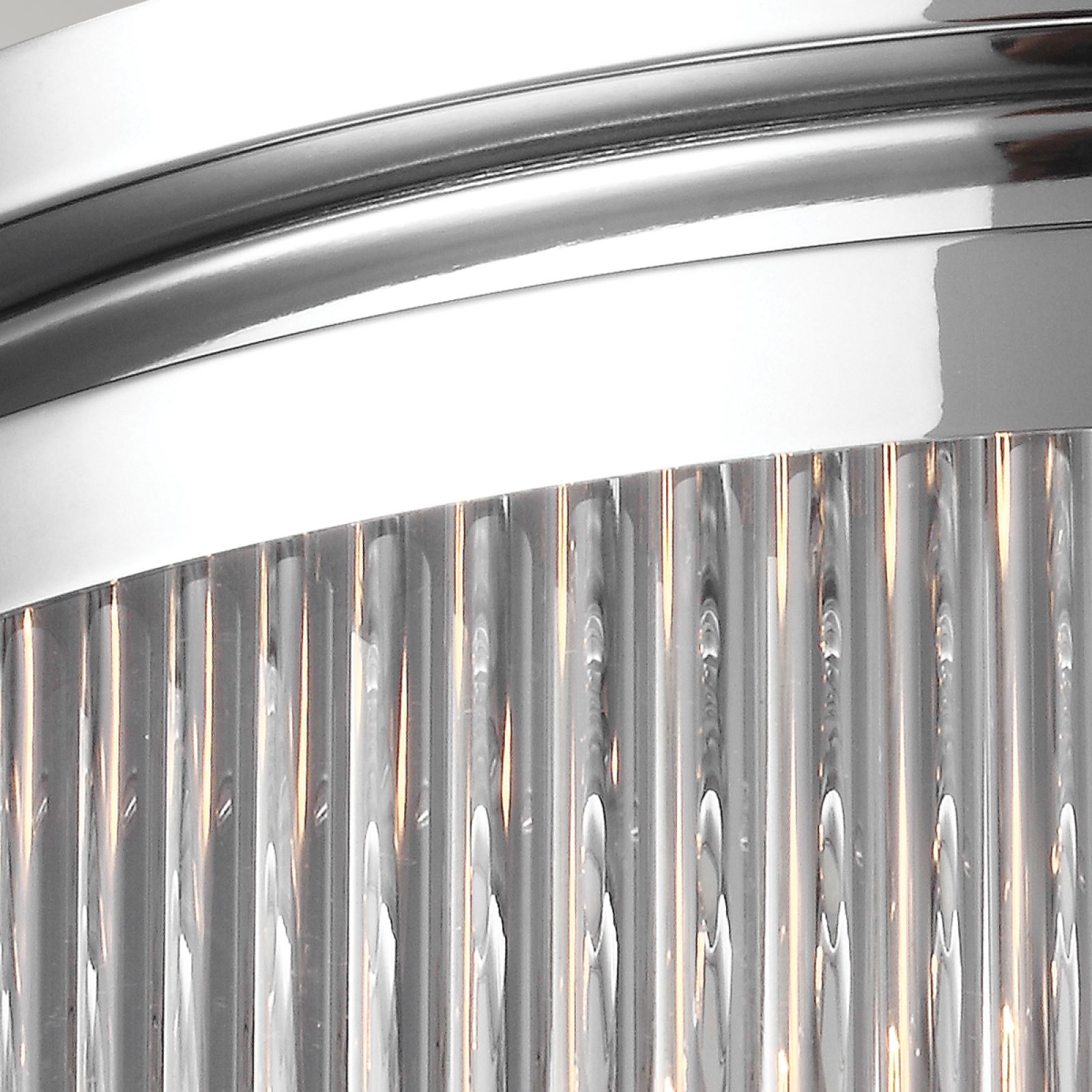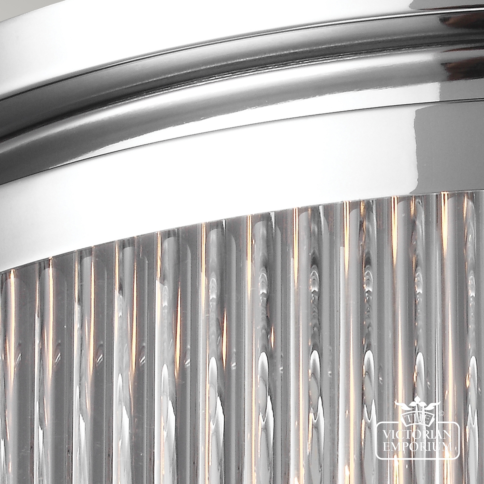 This light has a polished chrome finish with glass tube shades created using rows of individual clear glass rods to softly diffuse the light